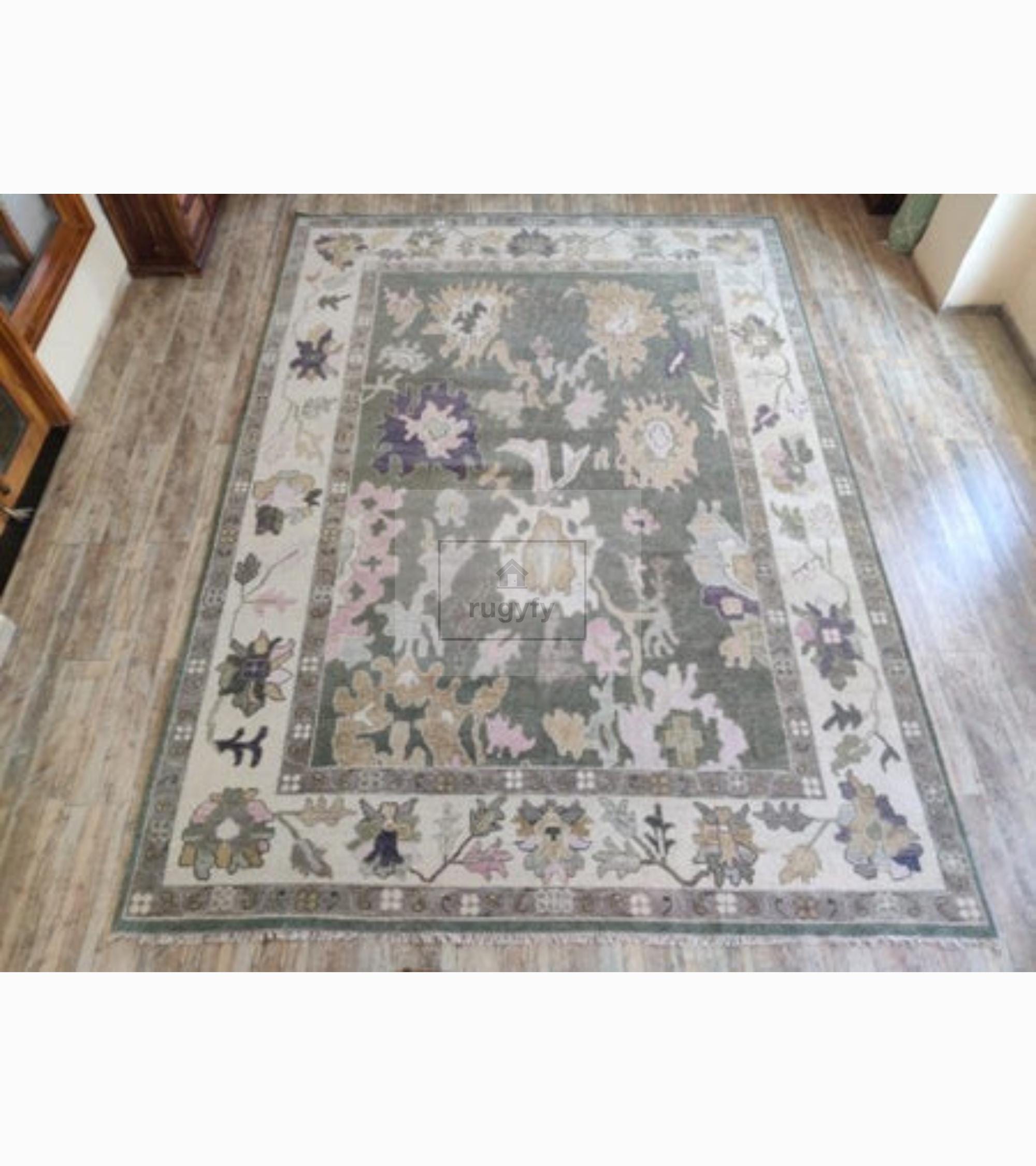 Keywords: hand-knotted rug, Oushak rug 8x10, Turkish rug, vintage style wool carpet, sage green and blush rug, Bhadohi India rug