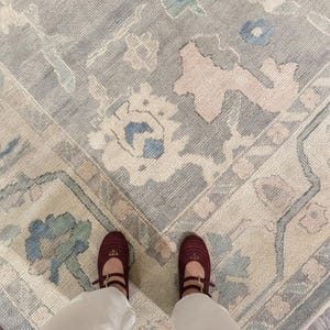 Bring home calm, artisanal charm with this 8x10 pastel Oushak rug. Hand-knotted in wool, it features a soothing beige ground with soft blue, sage green, gold and lilac motifs. The vintage-inspired Turkish pattern layers beautifully in living rooms, dining rooms, or bedrooms while adding warmth, texture, and timeless