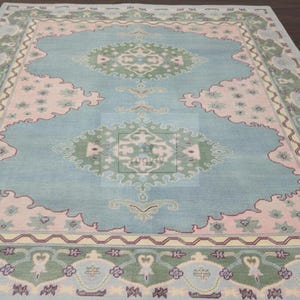Keywords: hand-knotted rug, Oushak rug 8x10, Turkish rug, vintage style wool carpet, sage green and blush rug, Bhadohi India rug