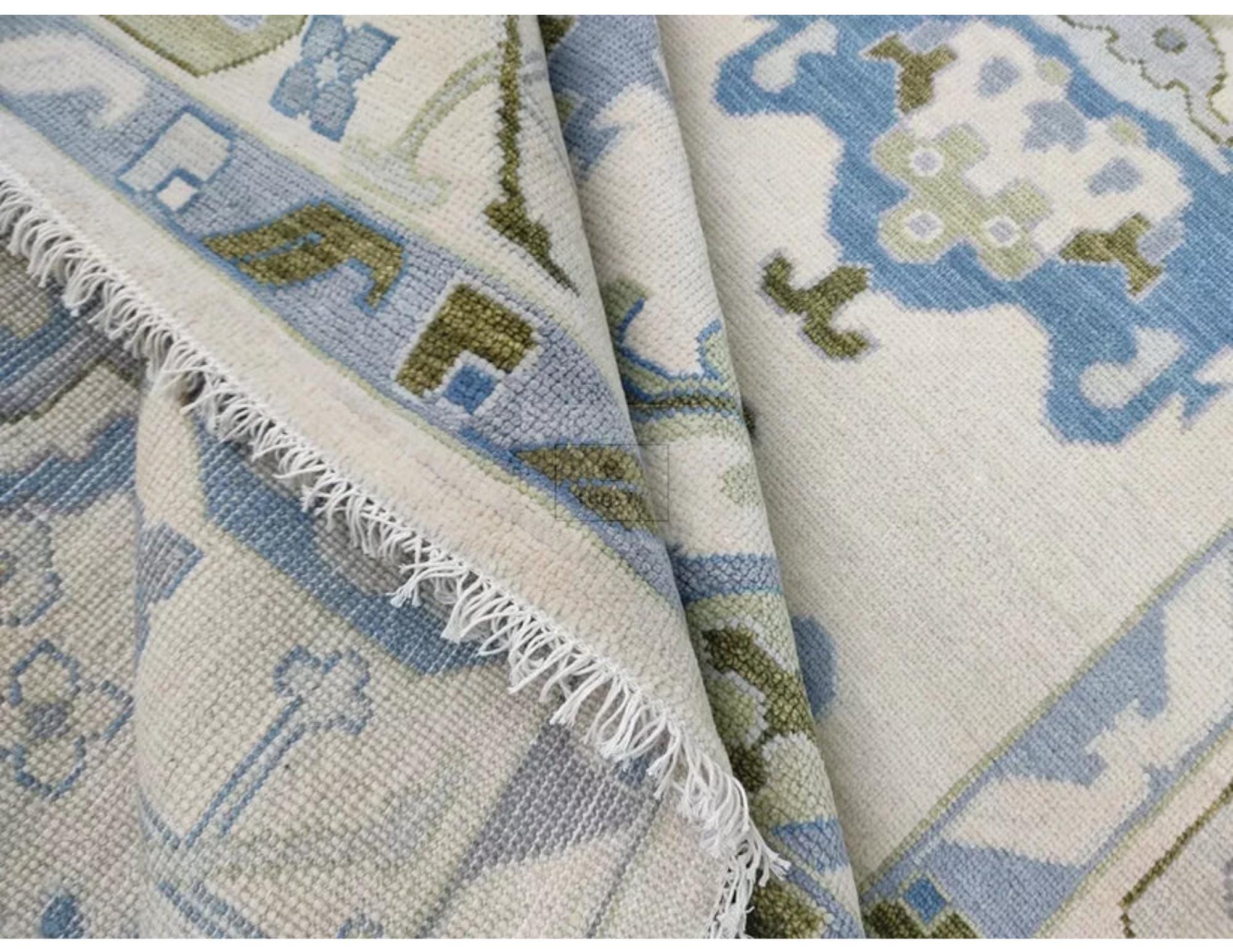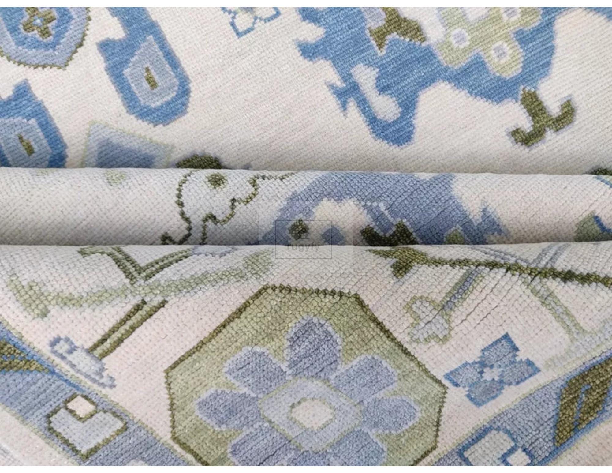 Bring timeless Turkish artistry to your home with this Handmade Wool Oushak Rug, beautifully crafted by skilled artisans using traditional hand-knotted weaving. The rug features a soft blue, green, and ivory palette—perfect for adding calm and elegance to any space. Its subtle floral and geometric motifs are inspired by classic Anatolian Oushak designs, known for their charm and warmth.
