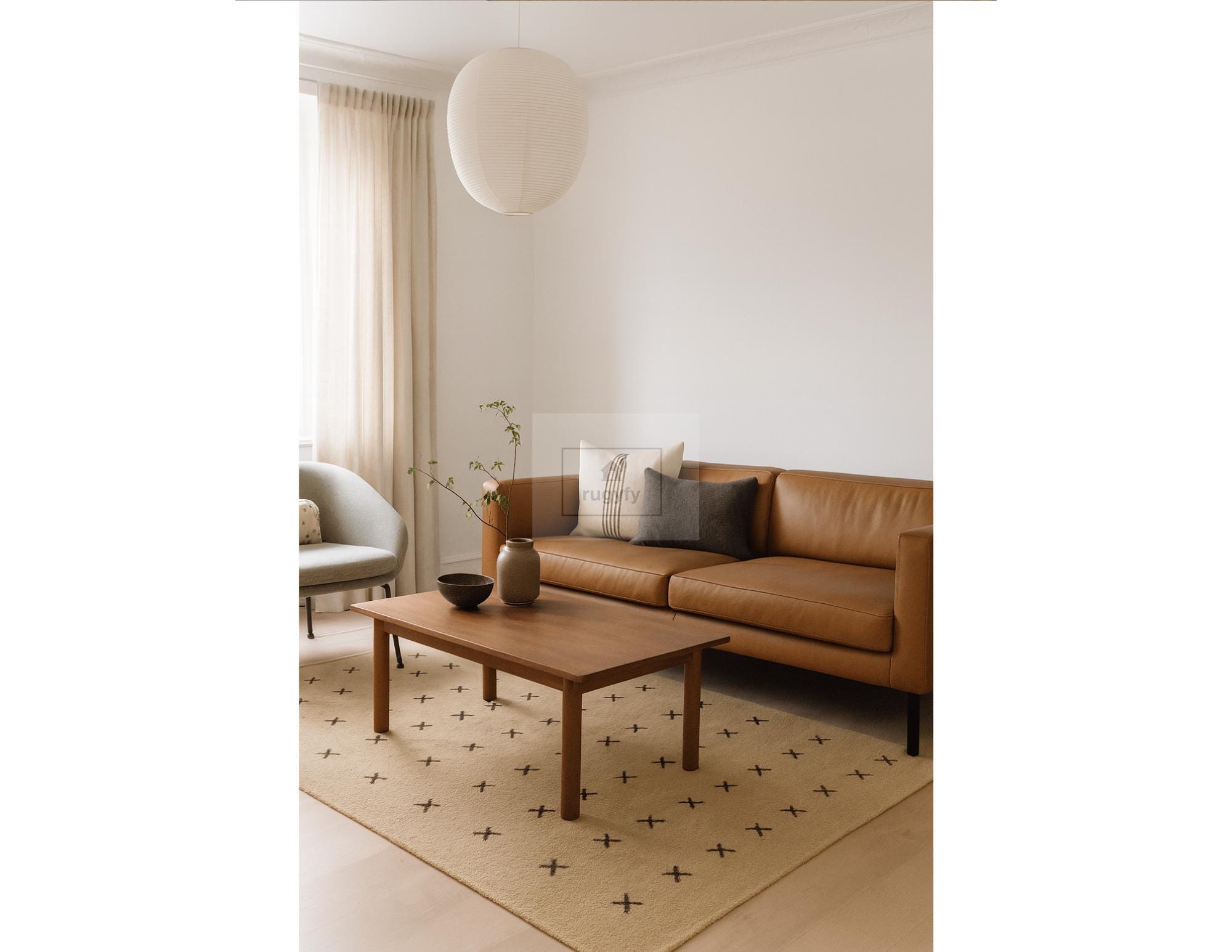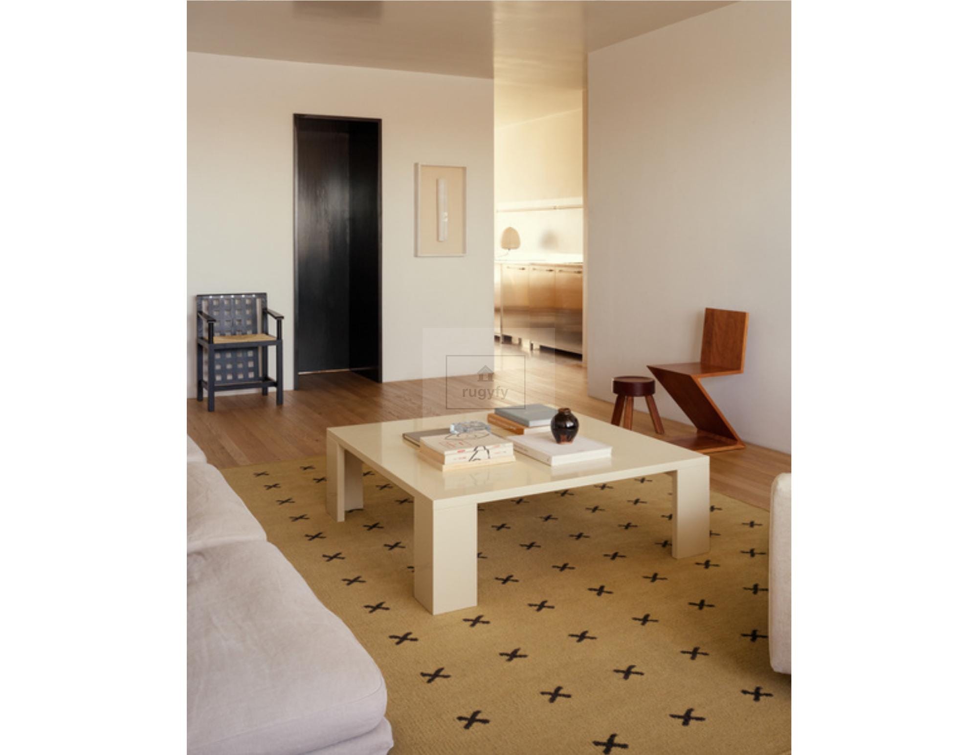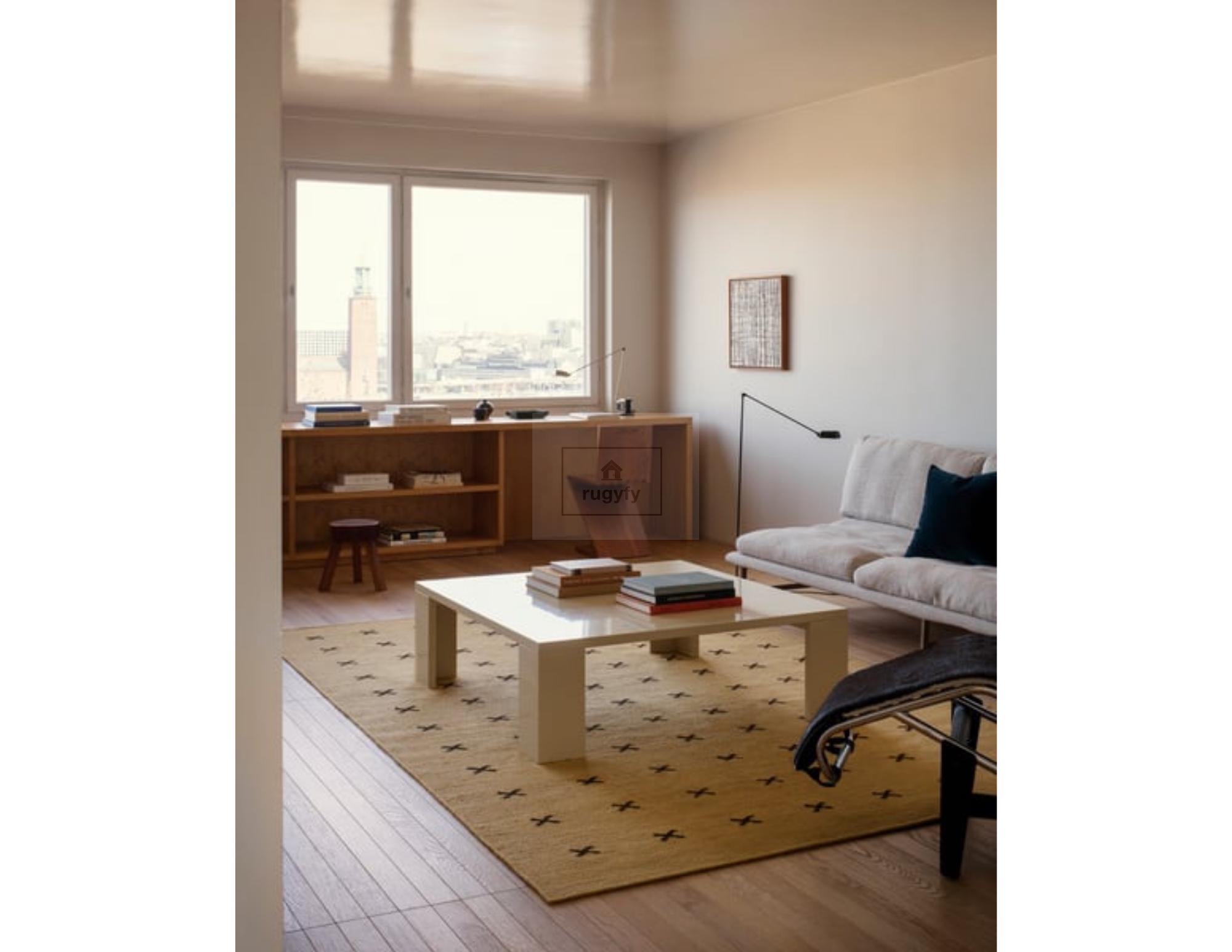 Bring warmth, texture, and character into your home with this handwoven flatweave wool rug. Crafted by skilled artisans in India, each piece is a testament to traditional craftsmanship—blending natural materials with modern design. The low‑profile flatweave construction makes the rug durable yet lightweight, while its reversible design ensures extended use A graphic cross (plus‑sign) pattern in deep black is carefully woven across a warm mustard/beige base, adding a bold yet minimalist accent that complements contemporary, Scandinavian, or bohemian interiors