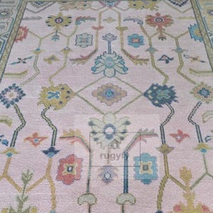 8x10 hand-knotted wool rug , Oushak rug” / “Oushak wool rug ,boho area rug , cream blue green rug ,Turkish style wool carpet , modern boho rug , neutral boho decor , floral geometric rug , soft pile wool rug , bohemian living room rug , pastel rug , handmade floor rug , hand spun wool carpet , sustainable wool rug , earth tone rug , pastel Turkish Oushak rug