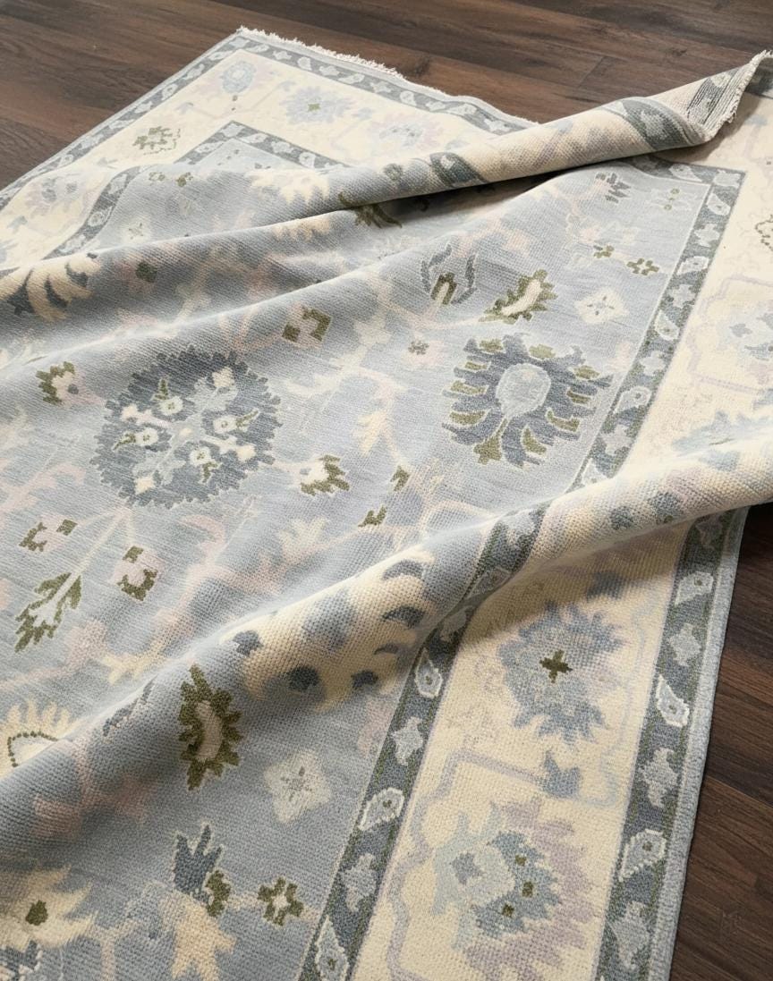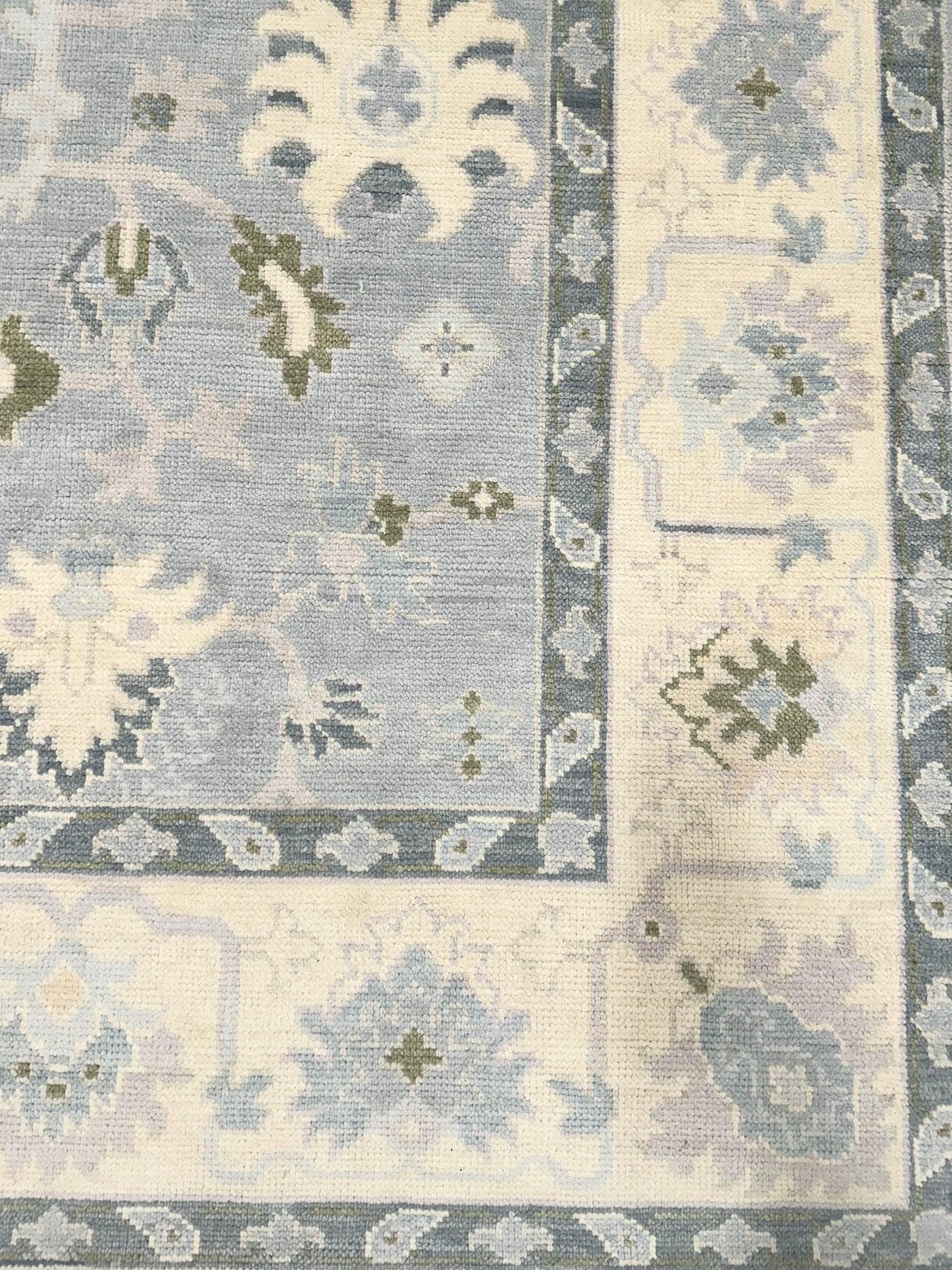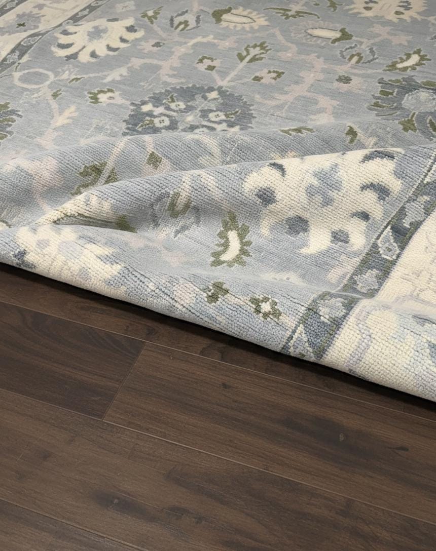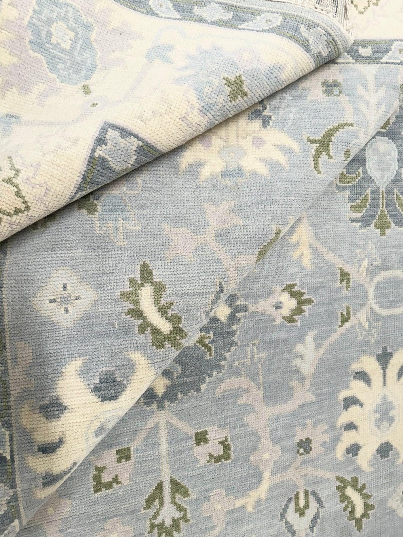 Bring timeless elegance into your home with this handcrafted Oushak area rug. Every strand is hand‑knotted by skilled artisans using high‑quality wool on a cotton foundation, creating a durable rug with a soft, plush pile. Oushak rugs are celebrated for their subtle designs, open space and muted color palettes, and this piece is no exception. The tranquil light blue field is adorned with large floral and medallion motifs spaced across the surface and framed by an ivory and sage green border. These motifs are tied using the Turkish (Ghiordes) knot, a technique that yields a long‑lasting, heirloom‑quality rug