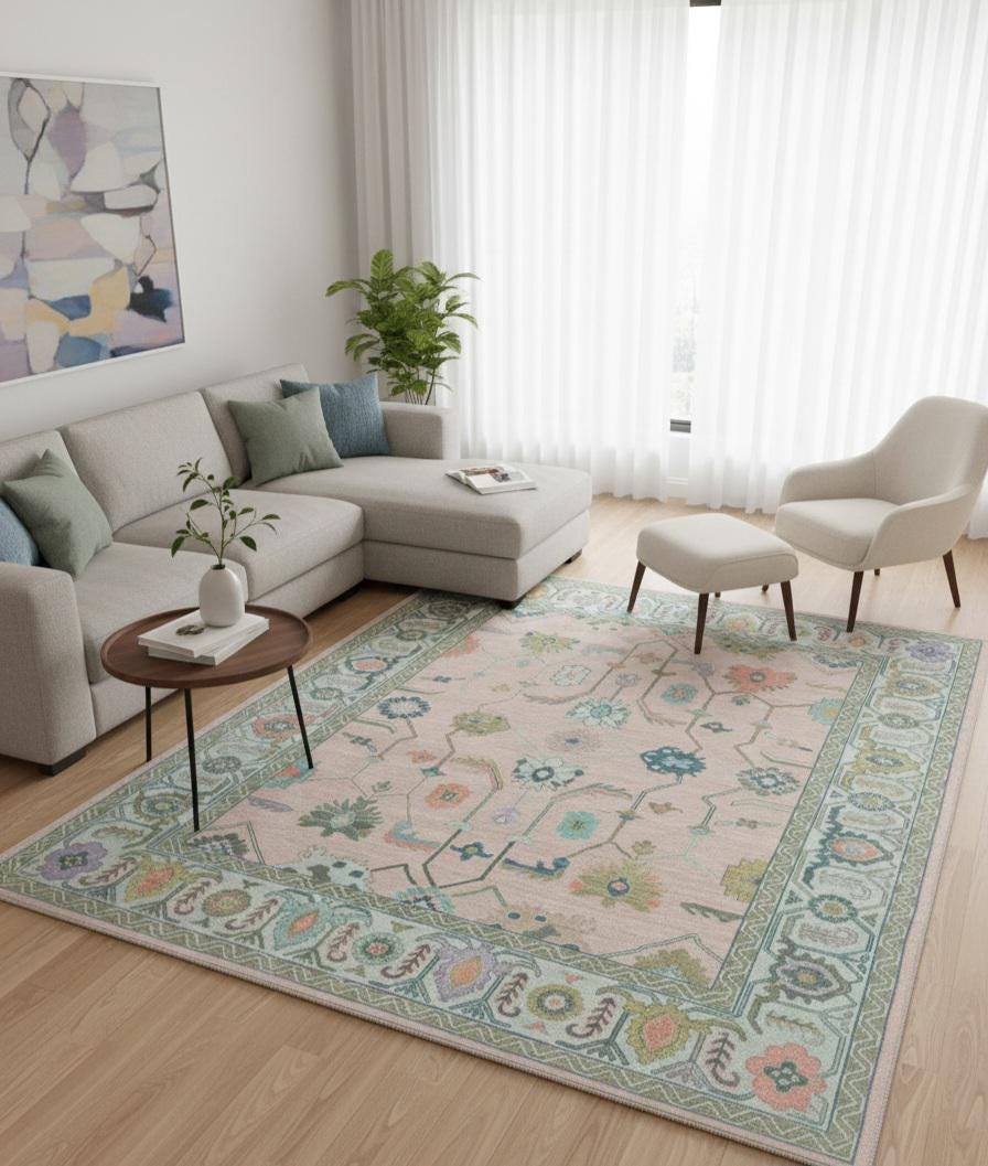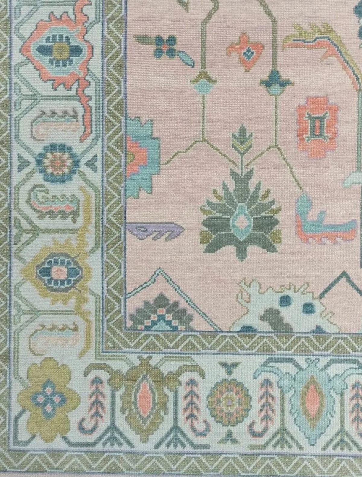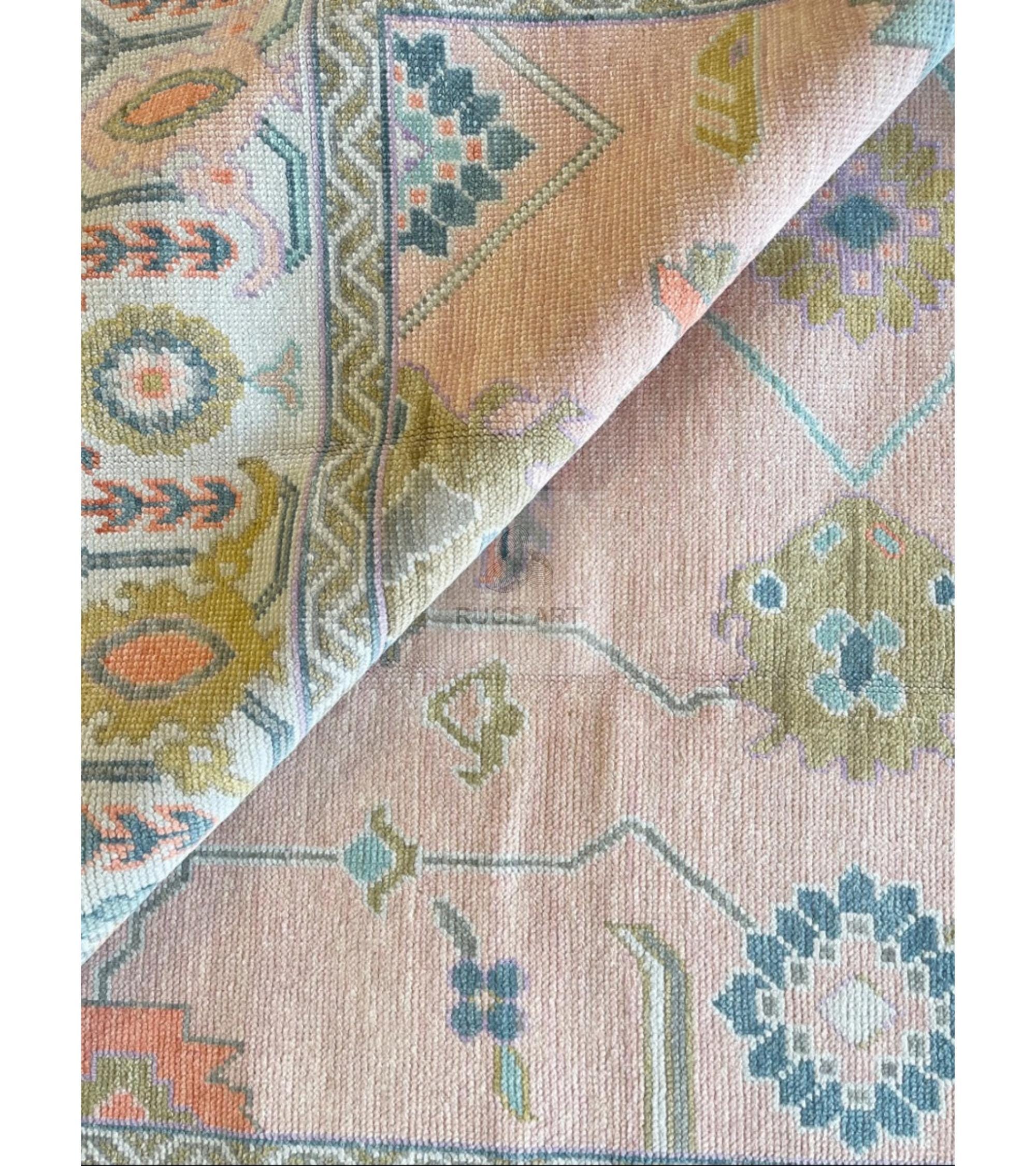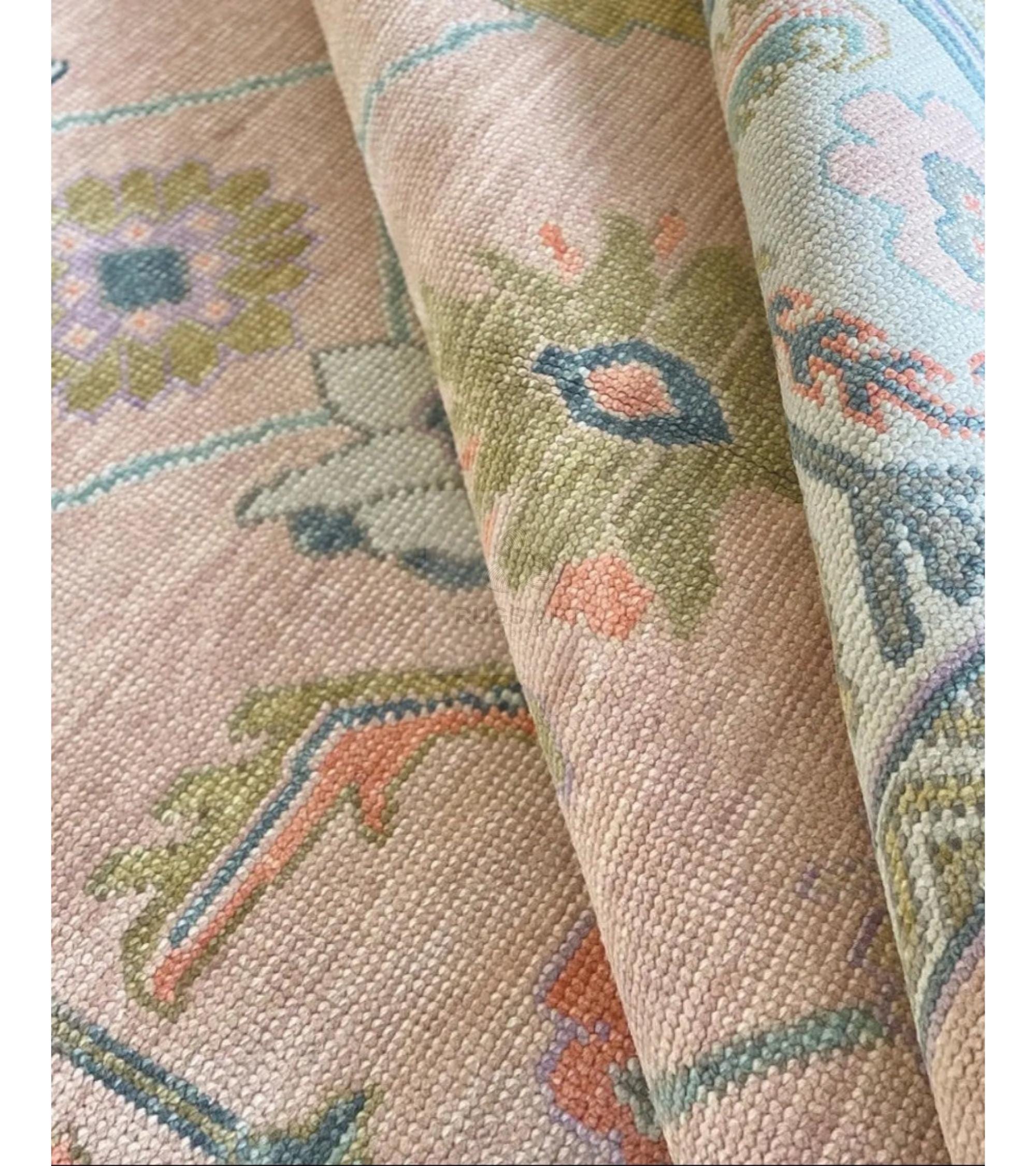Bring soft elegance and timeless charm into your home with this Handmade Pink Oushak Wool Rug, a perfect blend of Turkish tradition and modern pastel beauty. Hand-knotted by skilled artisans using 100% New Zealand wool, this rug features a delicate floral Oushak pattern in calming shades of pink, sage green, muted blue, and ivory — ideal for creating a warm, inviting space.