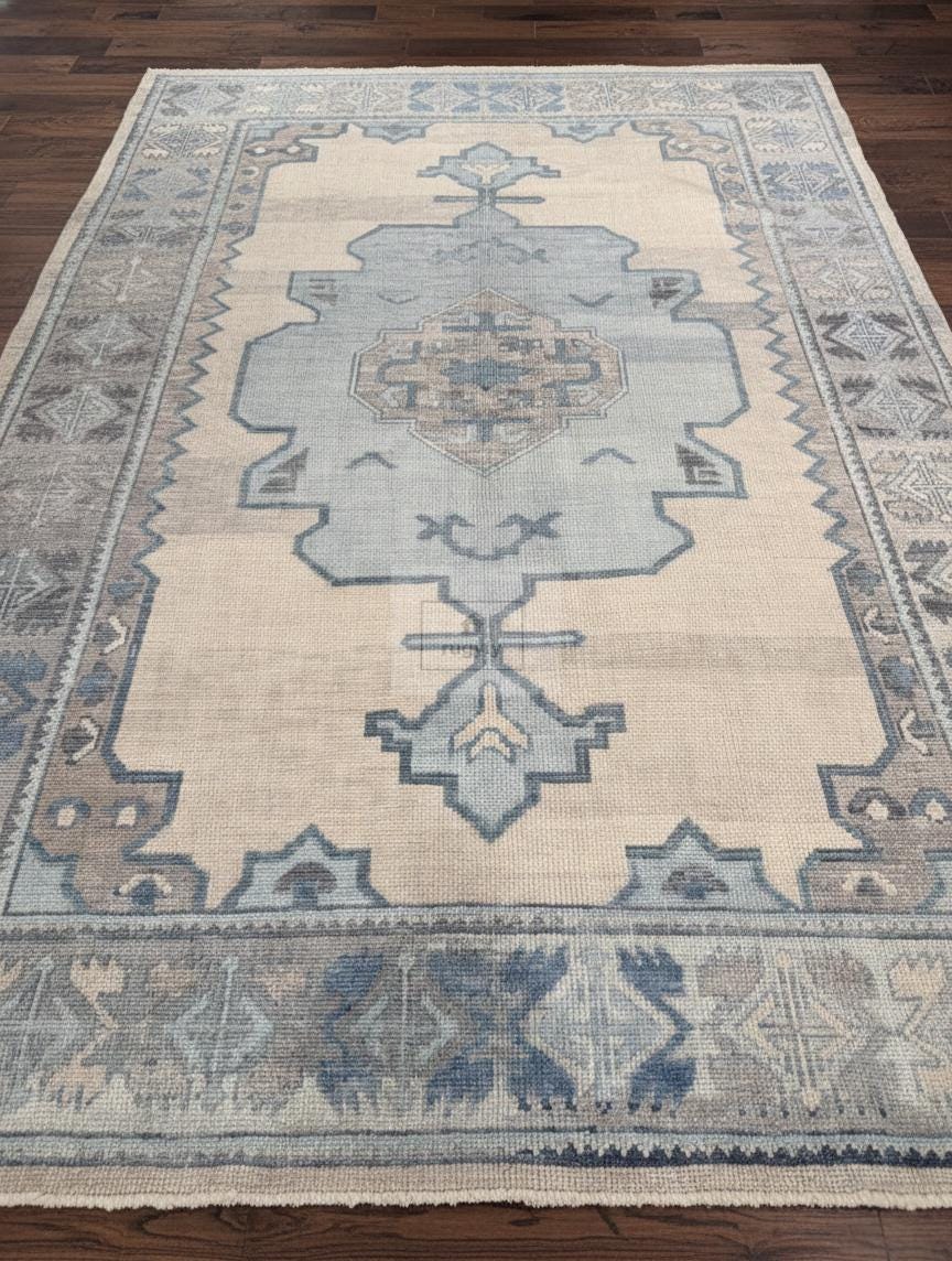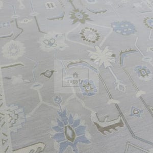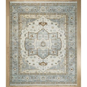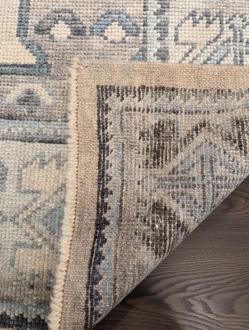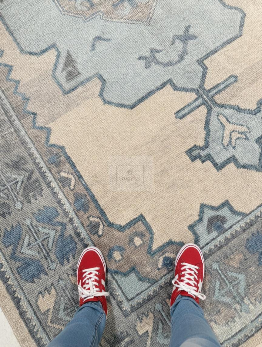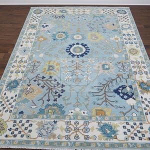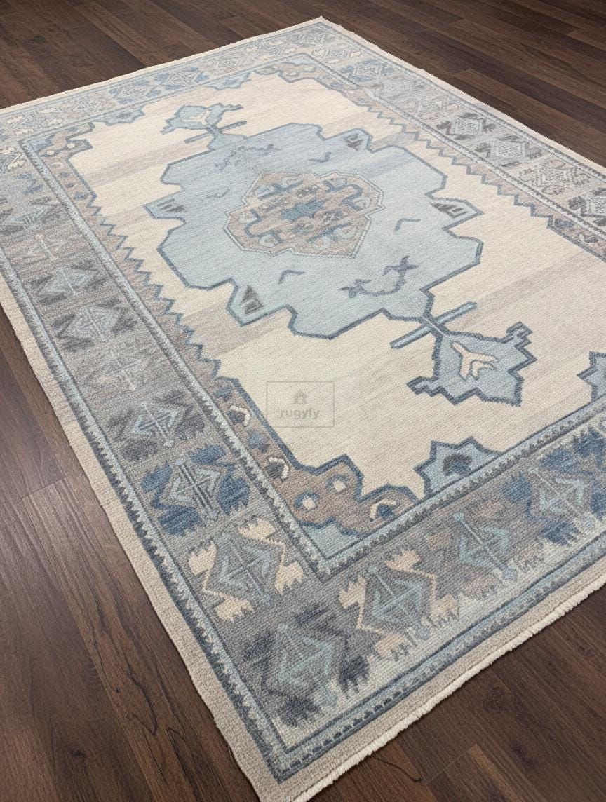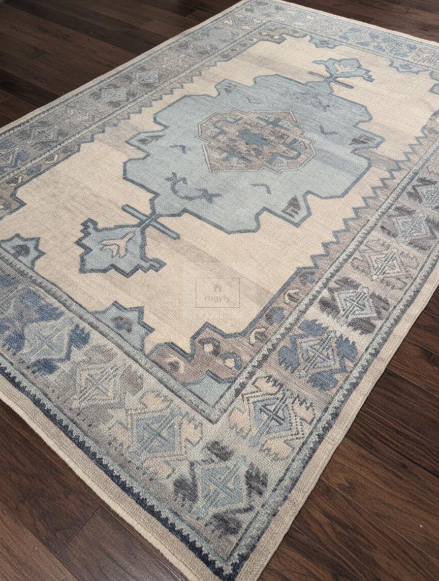 Transform your home into a sanctuary of warmth and sophistication with this handmade 8x10 Turkish Oushak rug. Masterfully hand-knotted from 100% premium New Zealand wool, this area carpet features the iconic traditional Oushak motifs in a serene palette of muted blue, soft grey, and cream as shown in the images. The plush wool pile offers exceptional underfoot comfort and natural stain resistance, making it an ideal choice for high-traffic living rooms, serene bedrooms, or authentic farmhouse decor.
