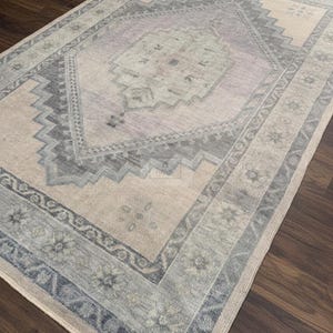 Keywords: hand-knotted rug, Oushak rug 8x10, Turkish rug, vintage style wool carpet, sage green and blush rug, Bhadohi India rug