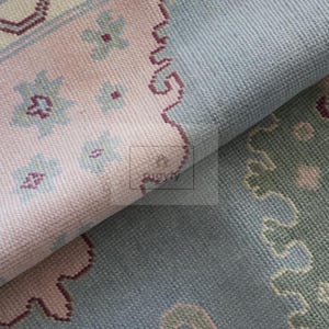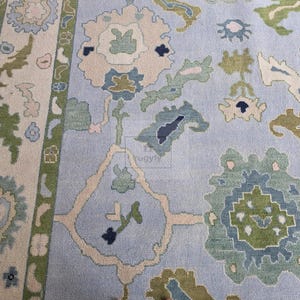Keywords: hand-knotted rug, Oushak rug 8x10, Turkish rug, vintage style wool carpet, sage green and blush rug, Bhadohi India rug