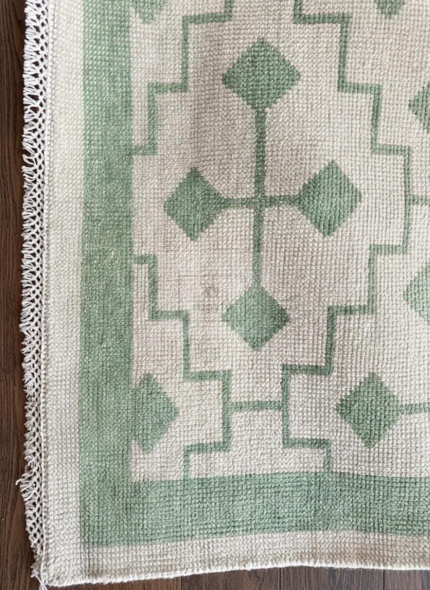 Bring a calm, designer look to your home with this 9x12 hand-knotted Oushak wool rug in a soft ivory/cream base with sage/mint green geometric pattern. Inspired by traditional Turkish Oushak rugs, this piece blends vintage craftsmanship with a clean, modern layout—perfect for today’s farmhouse, boho, coastal, and Scandinavian interiors.