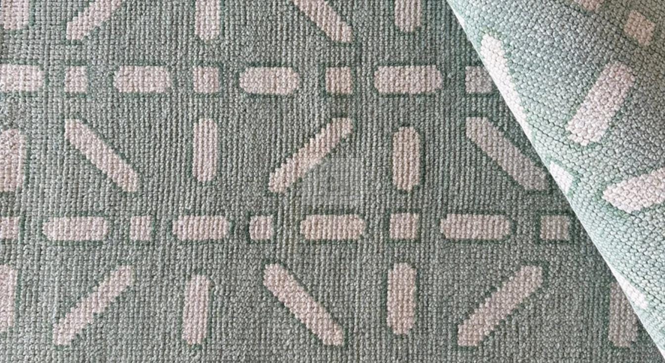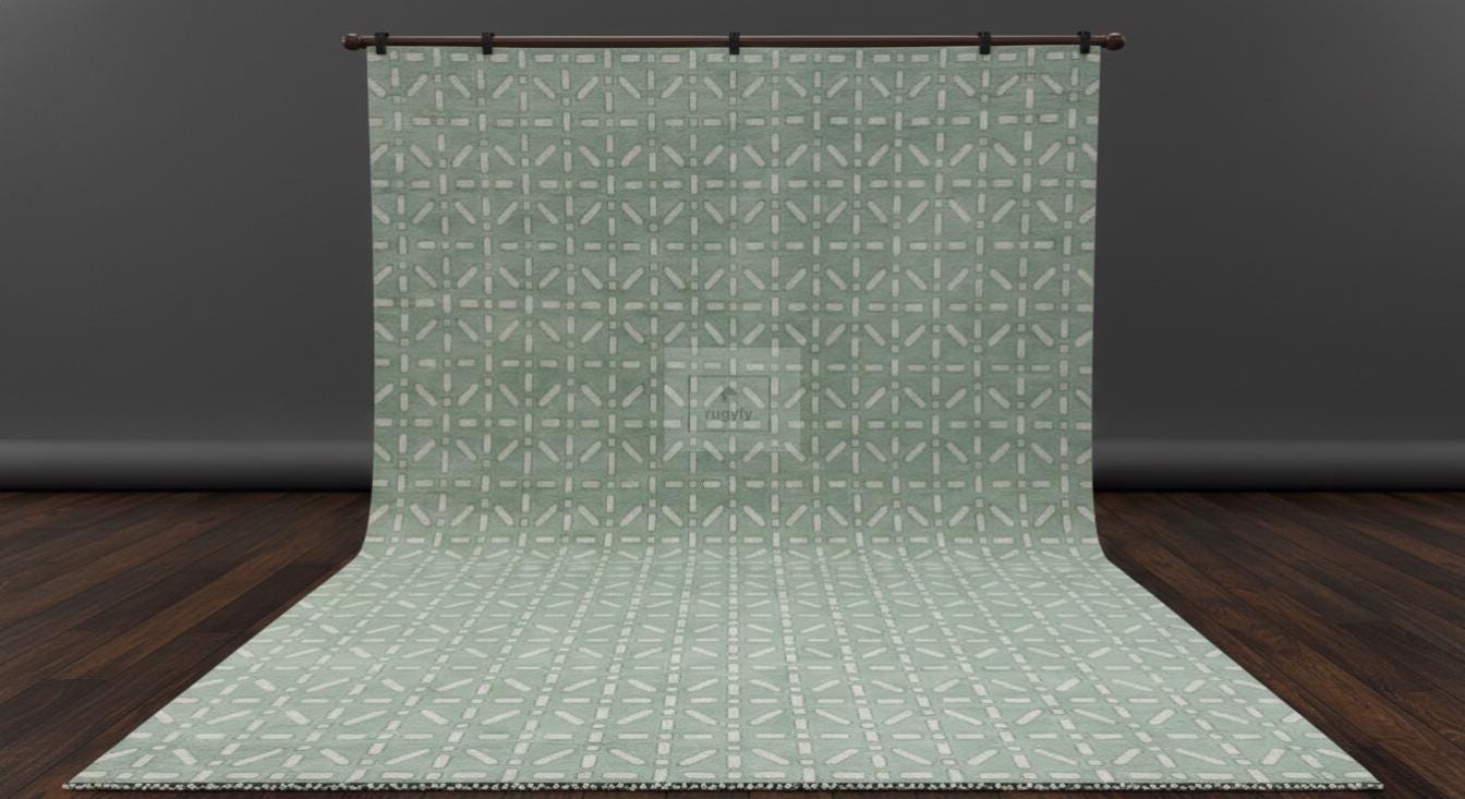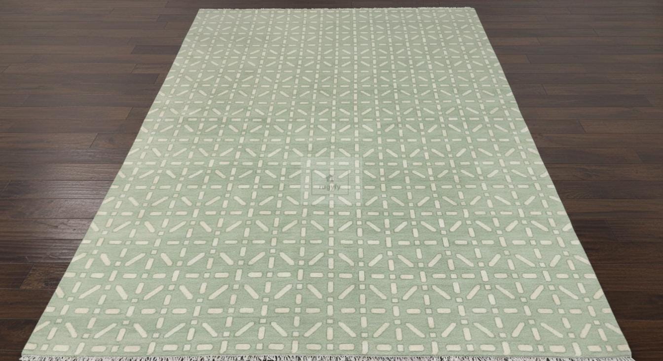Keywords: oushak area rug, turkish geometric rug, sage green carpet, ivory green rug, large neutral rug, boho farmhouse rug, scandinavian rug, coastal area rug, modern oushak, hand knotted wool carpet, 9x12 living room rug, geometric wool rug, minimal green rug