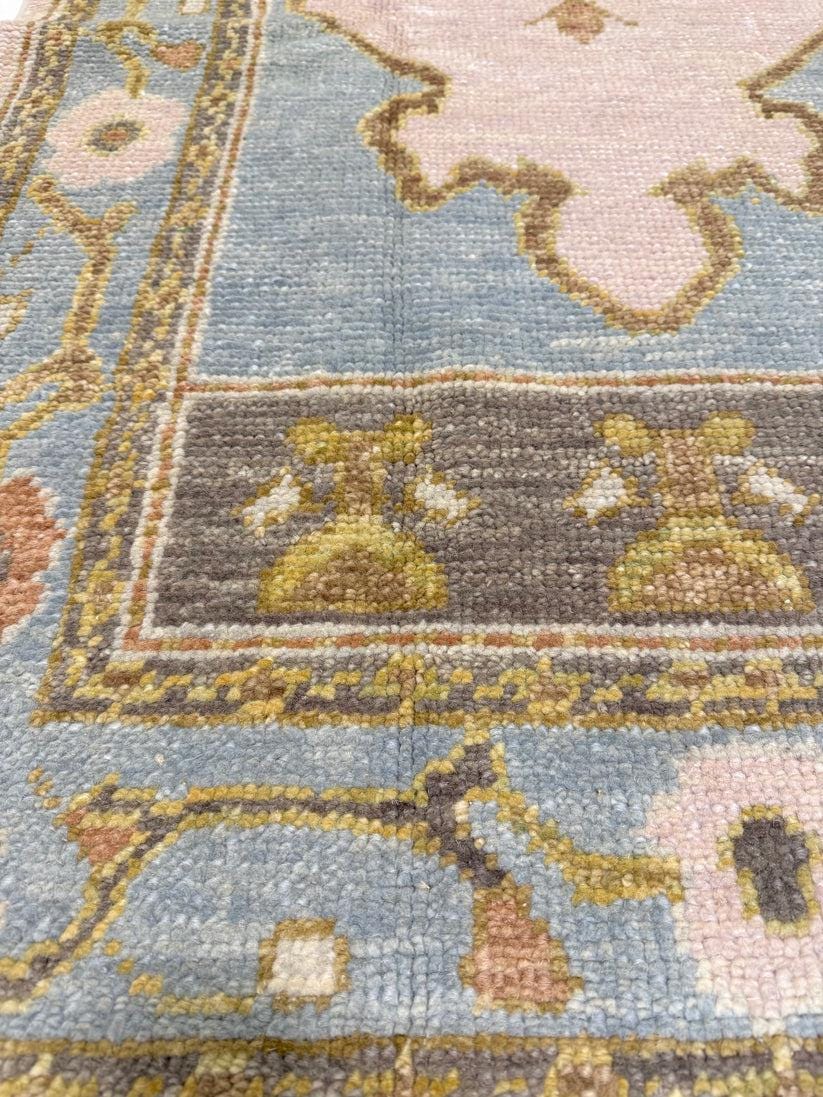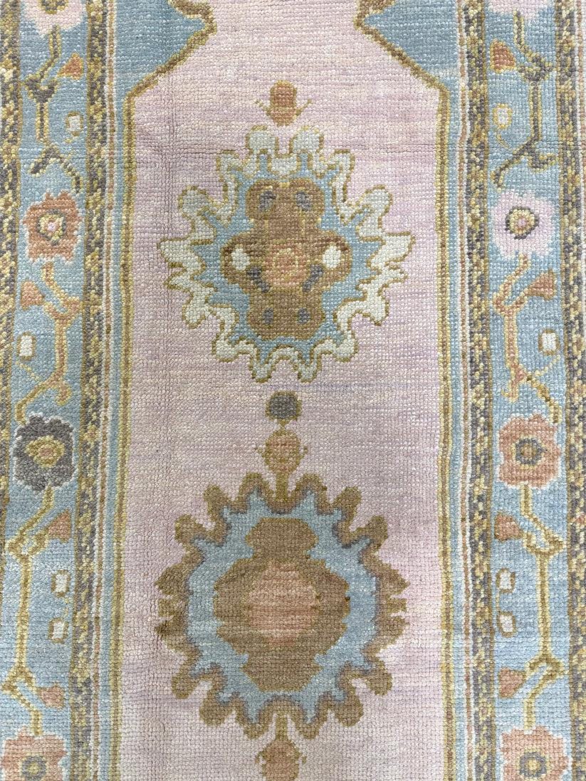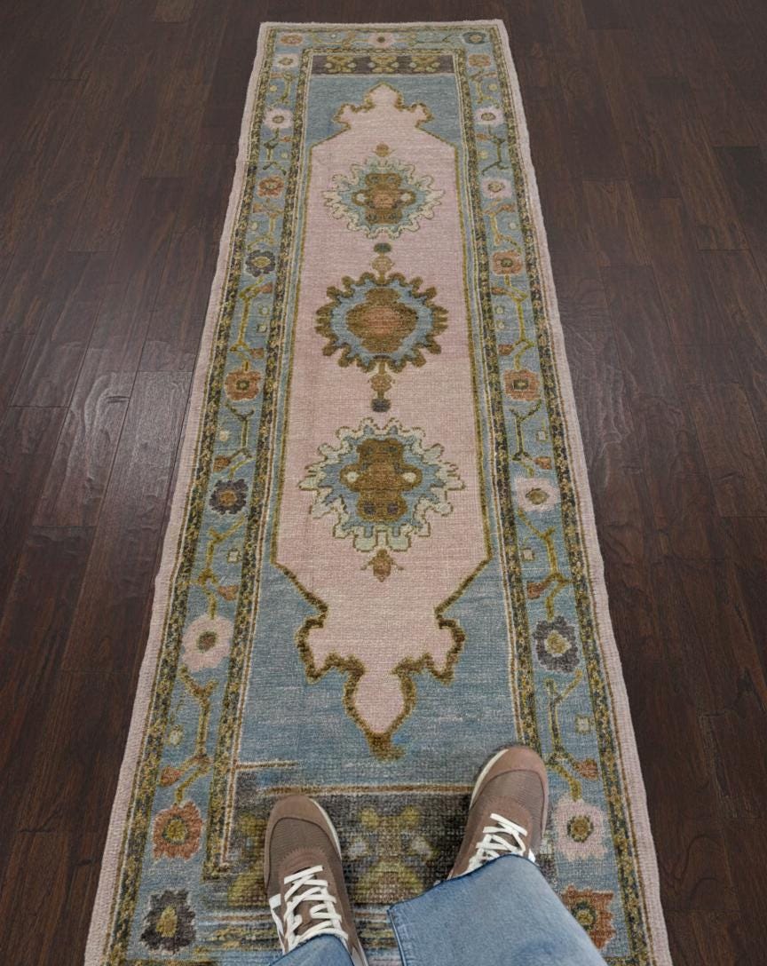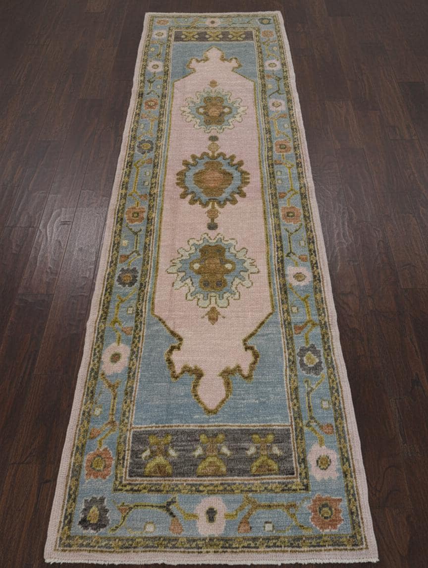 Bring soft, vintage charm to your home with this 2.5x8 ft Hand Knotted Oushak Wool Runner Rug, crafted by skilled artisans in a timeless Turkish Oushak floral design. The color palette features pastel pink and dusty blue, accented with sage/olive and warm golden tones, making it a perfect match for farmhouse, boho, cottagecore, and traditional interiors.