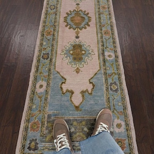 Bring soft, vintage charm to your home with this 2.5x8 ft Hand Knotted Oushak Wool Runner Rug, crafted by skilled artisans in a timeless Turkish Oushak floral design. The color palette features pastel pink and dusty blue, accented with sage/olive and warm golden tones, making it a perfect match for farmhouse, boho, cottagecore, and traditional interiors.