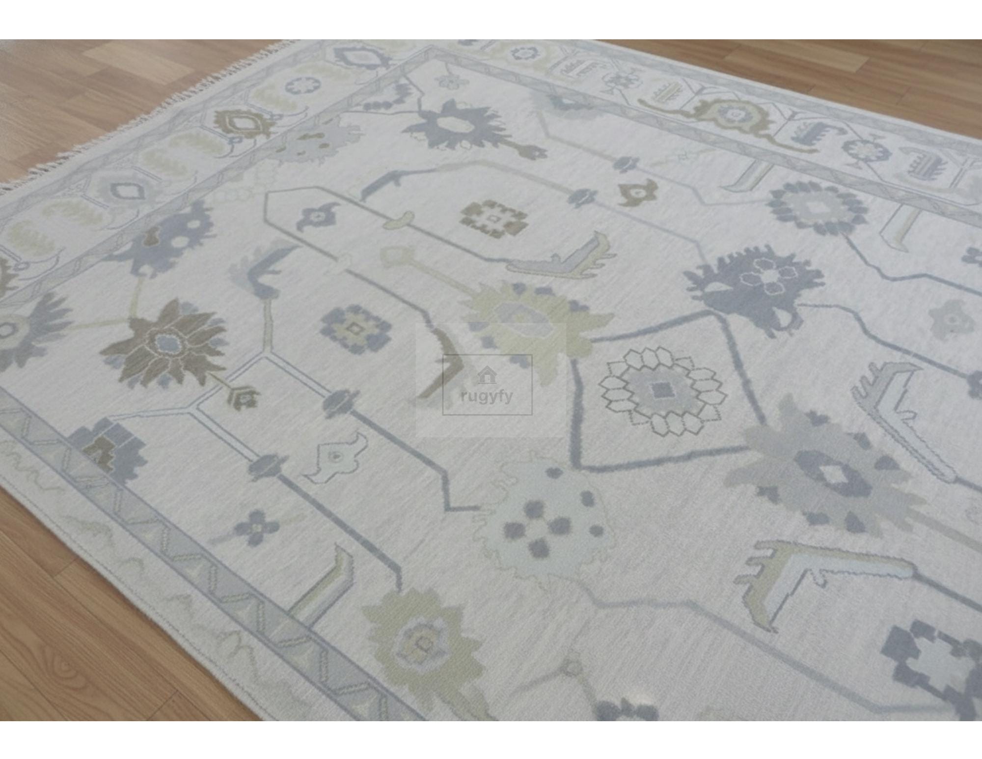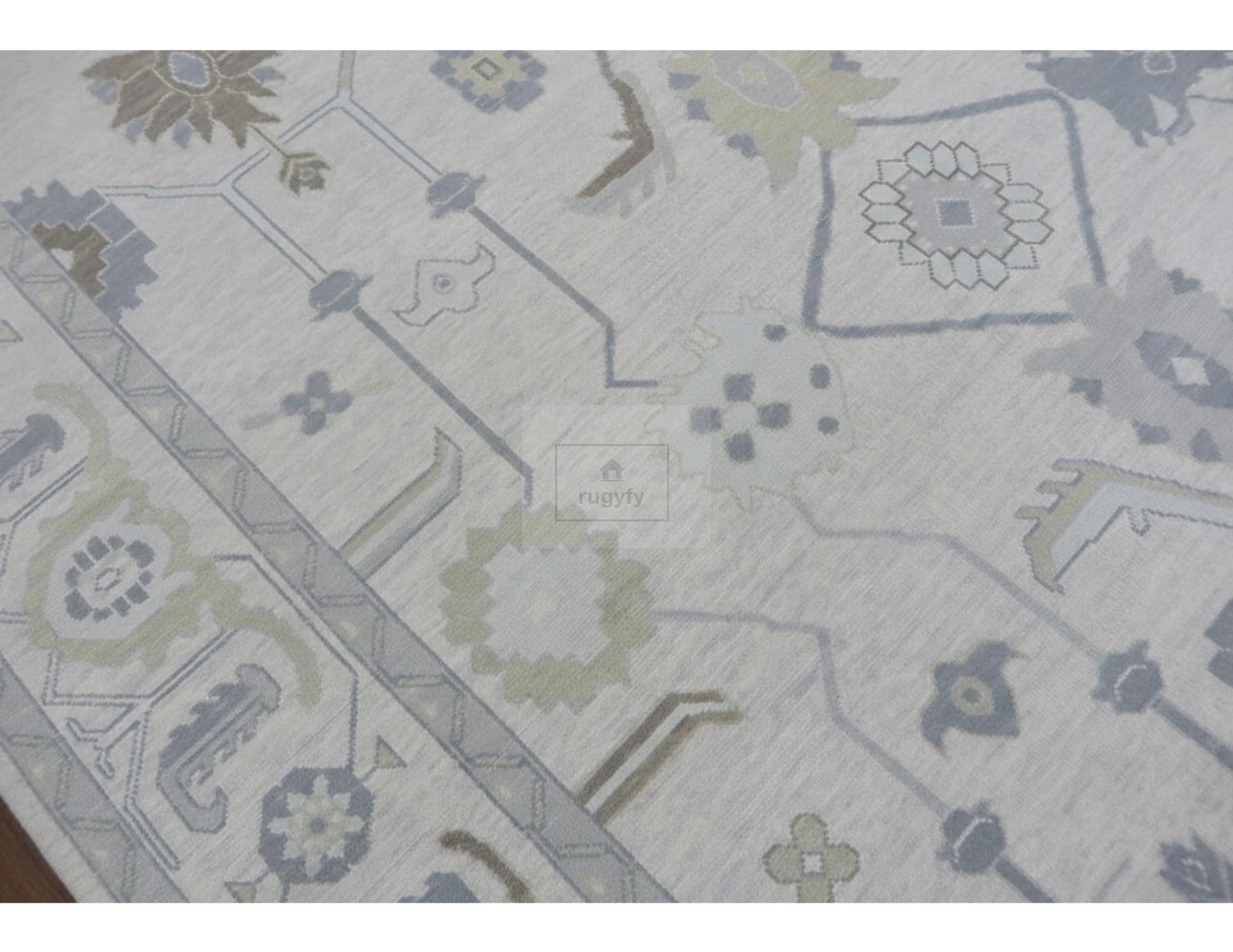 Bring soft, timeless character to your space with this hand-knotted Oushak wool rug in a calm ivory/cream base with dusty blue, sage green, and gray accents. Inspired by vintage Turkish Oushak carpets, the open floral-geometric design looks elevated in modern farmhouse, coastal, Scandinavian, and transitional interiors—perfect for living rooms, bedrooms, dining rooms, nurseries, and designer projects.