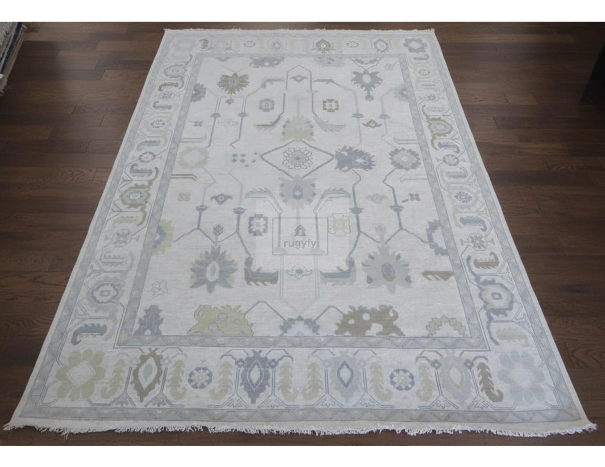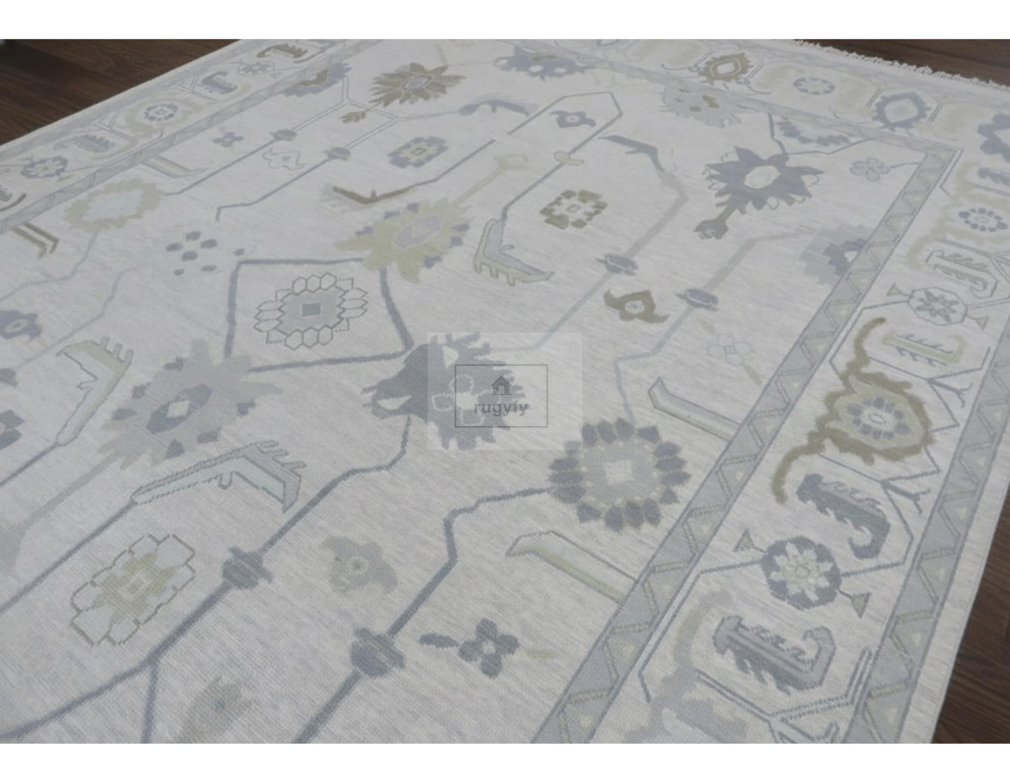 Large Oushak Wool Rug Hand Knotted – Cream Ivory Blue Green Gray Traditional Turkish Floral Area Rug | Multiple Sizes