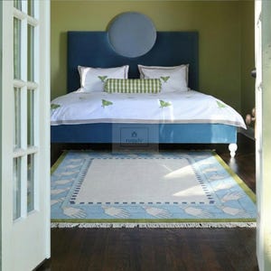 Keywords: oushak rug 9x12, hand knotted area rug, blue ivory geometric rug, wool area rug, handmade oushak Free shipping on orders | 30-day returns | Custom sizes in 4–6 weeks