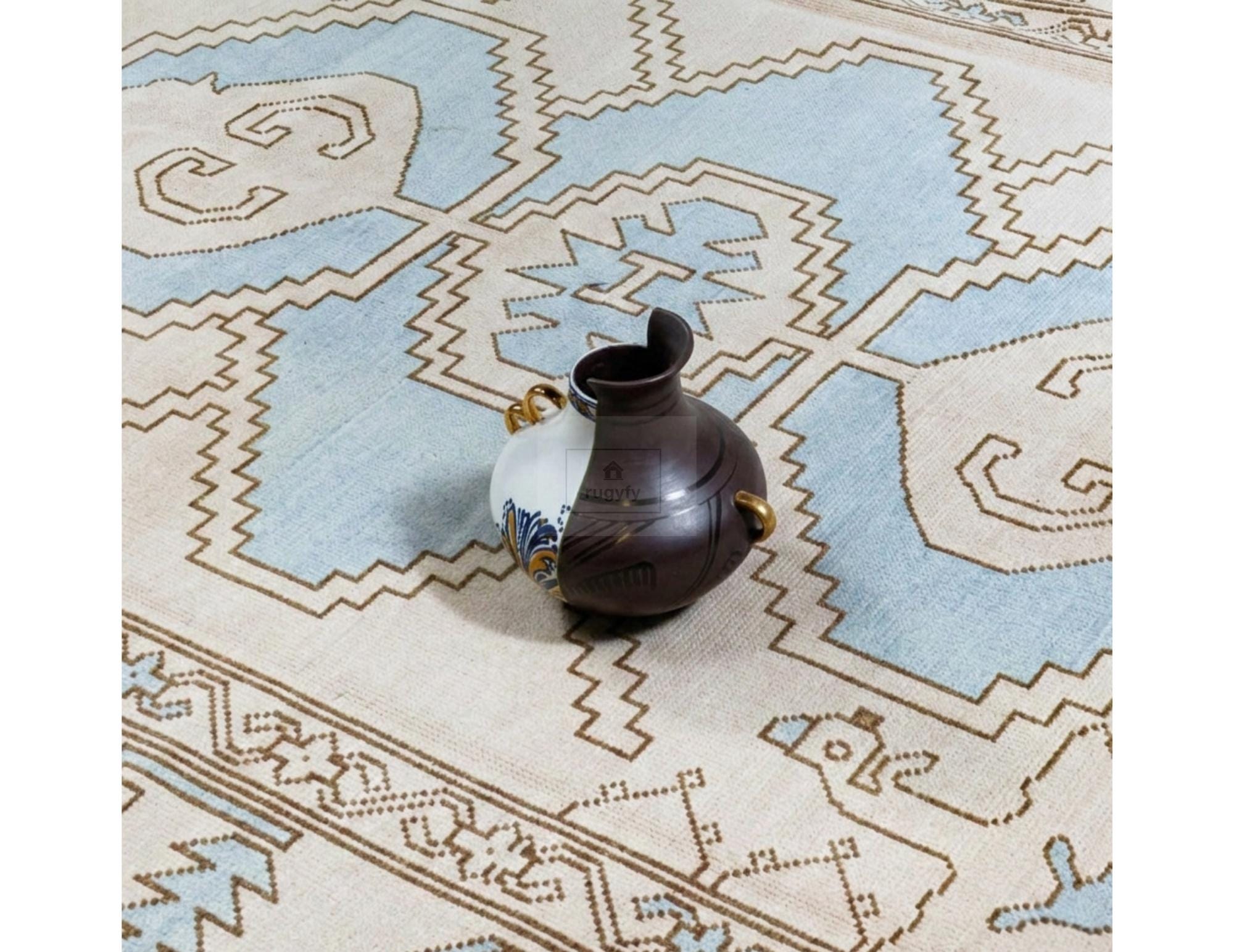 ✨ Elevate your space with this stunning Sky Blue & Ivory Hand Knotted Oushak Rug — a true artisan masterpiece crafted from 100% premium wool. This 9x12 geometric oushak rug features a serene palette of soft sky blue, warm ivory, and subtle gold accents, perfectly designed for modern coastal, boho, and transitional interiors. Each rug is hand knotted by master weavers using centuries-old techniques, ensuring a soft, plush pile that only gets better with age.