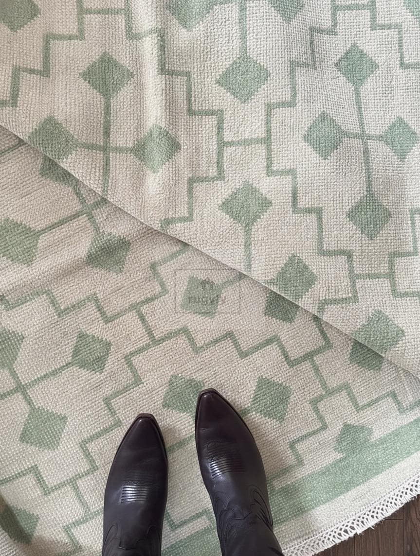 This rug breaks from the typical floral Oushak mold with a bold geometric diamond trellis design. The connected diamond motifs create a rhythmic lattice grid that feels both modern and timeless. The sage green and mint palette against the cream ivory ground delivers a fresh, calming energy — perfect for Scandinavian, mid-century modern, coastal, or transitional interiors. The solid green border frames the geometric field beautifully, adding structure without heaviness.