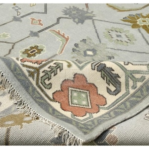 🎨 STYLE & DESIGN: A serene sage green field anchors this Oushak rug with its intricate botanical tree of life motifs. Sky blue flower accents and gold details create a harmonious palette perfect for 2026's trending biophilic and nature-inspired interiors. The ivory border adds a clean, classic frame.