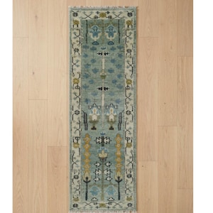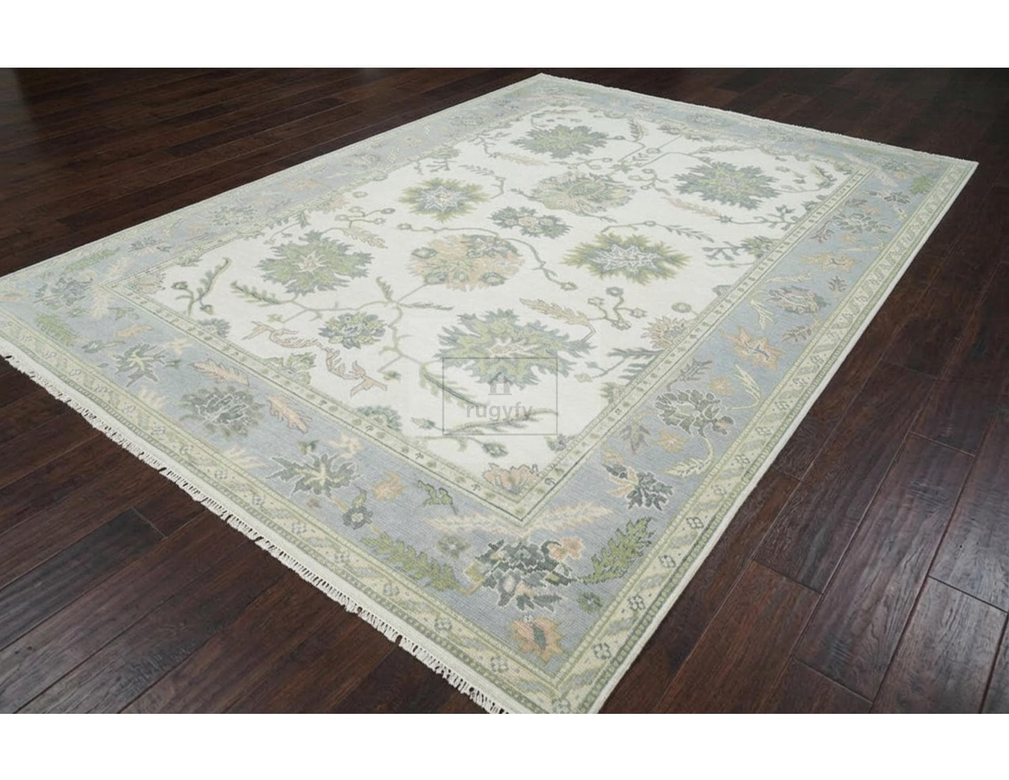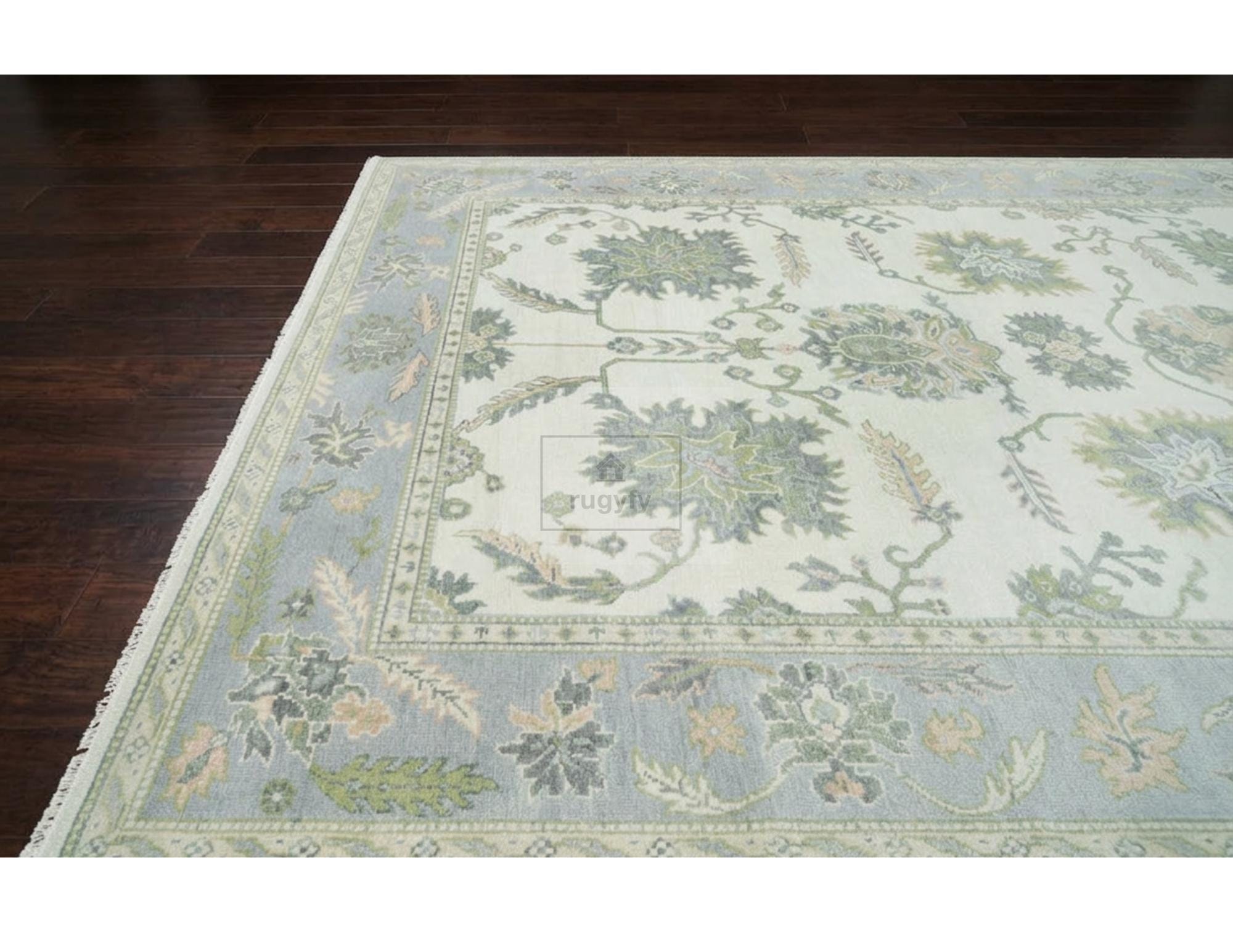 Elevate your space with this stunning 6x9 hand knotted Oushak wool rug featuring a cream ivory field, light blue border, and lush green floral motifs. Crafted from premium New Zealand wool with 20-40 knots per square inch, this Afghani Oushak design rug delivers heirloom-quality craftsmanship with a soft, plush pile that feels luxurious underfoot.