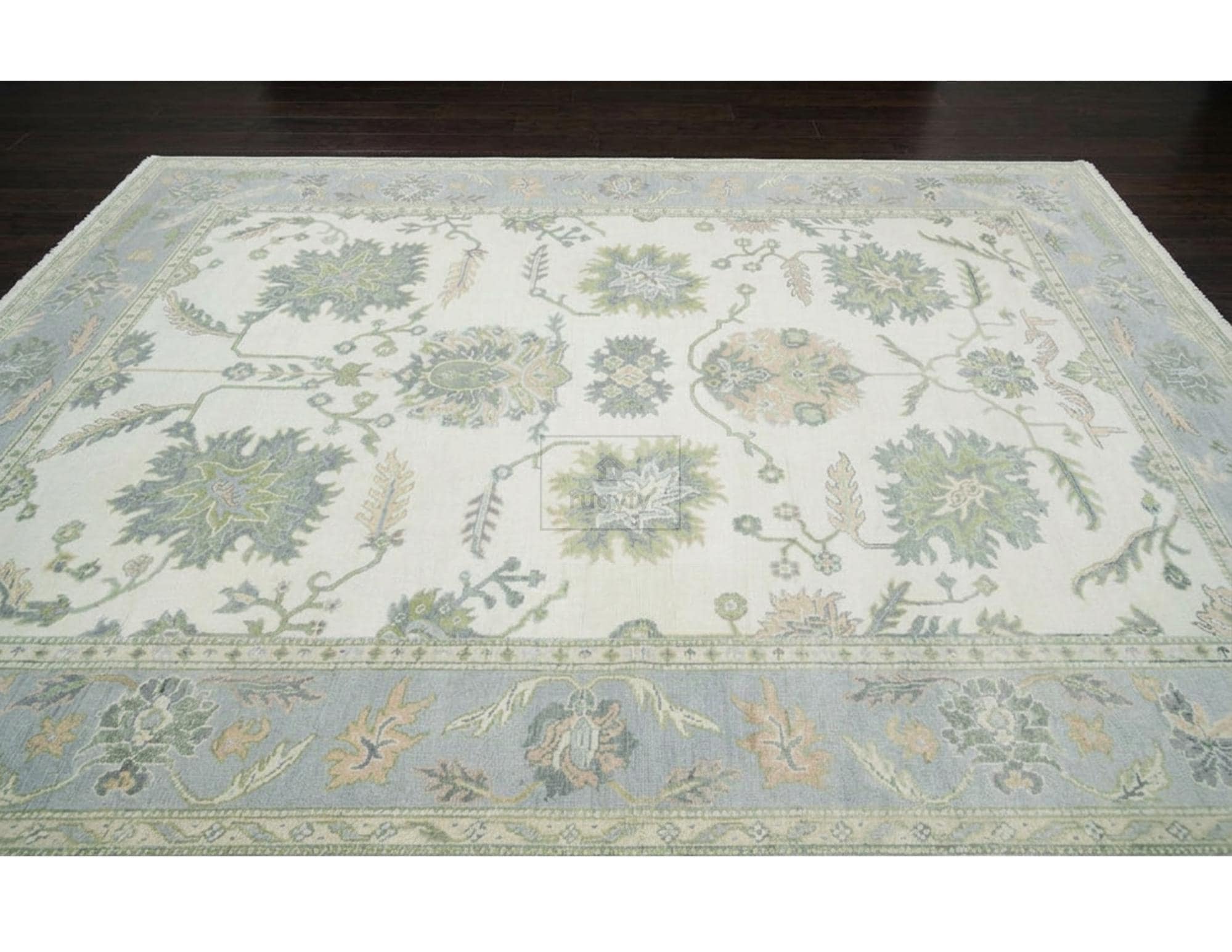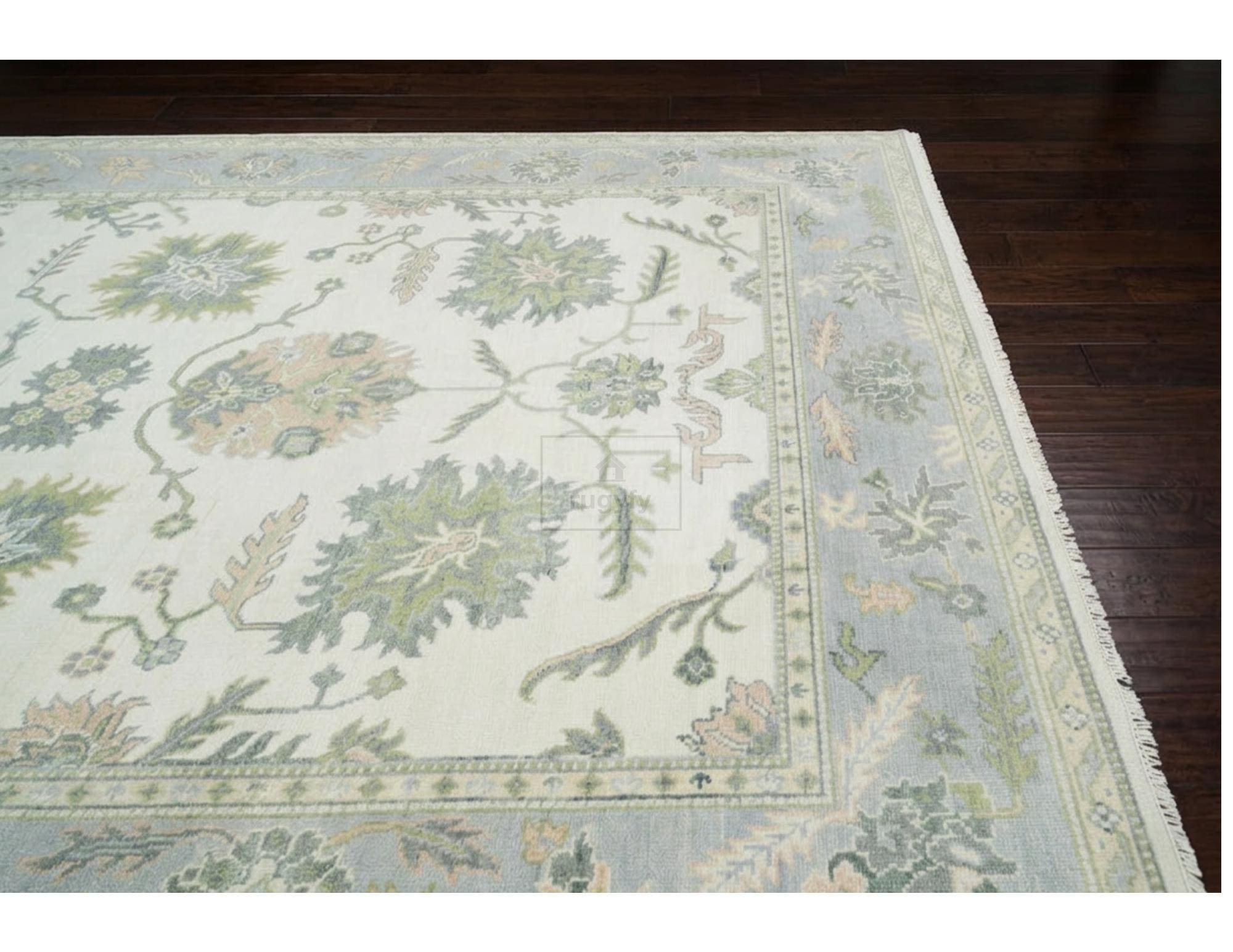 Keywords: hand-knotted rug, Oushak rug 8x10, Turkish rug, vintage style wool carpet, sage green and blush rug, Bhadohi India rug