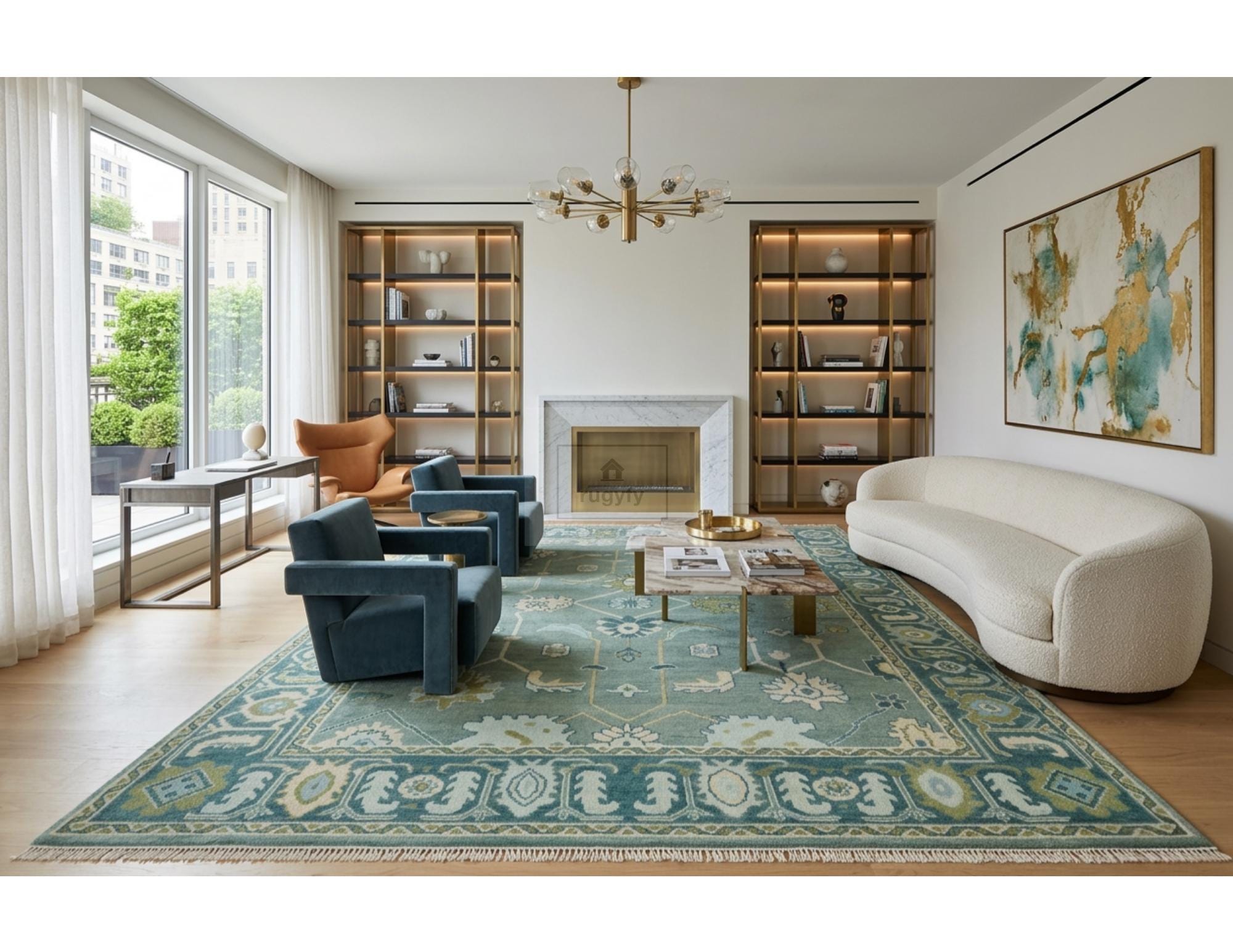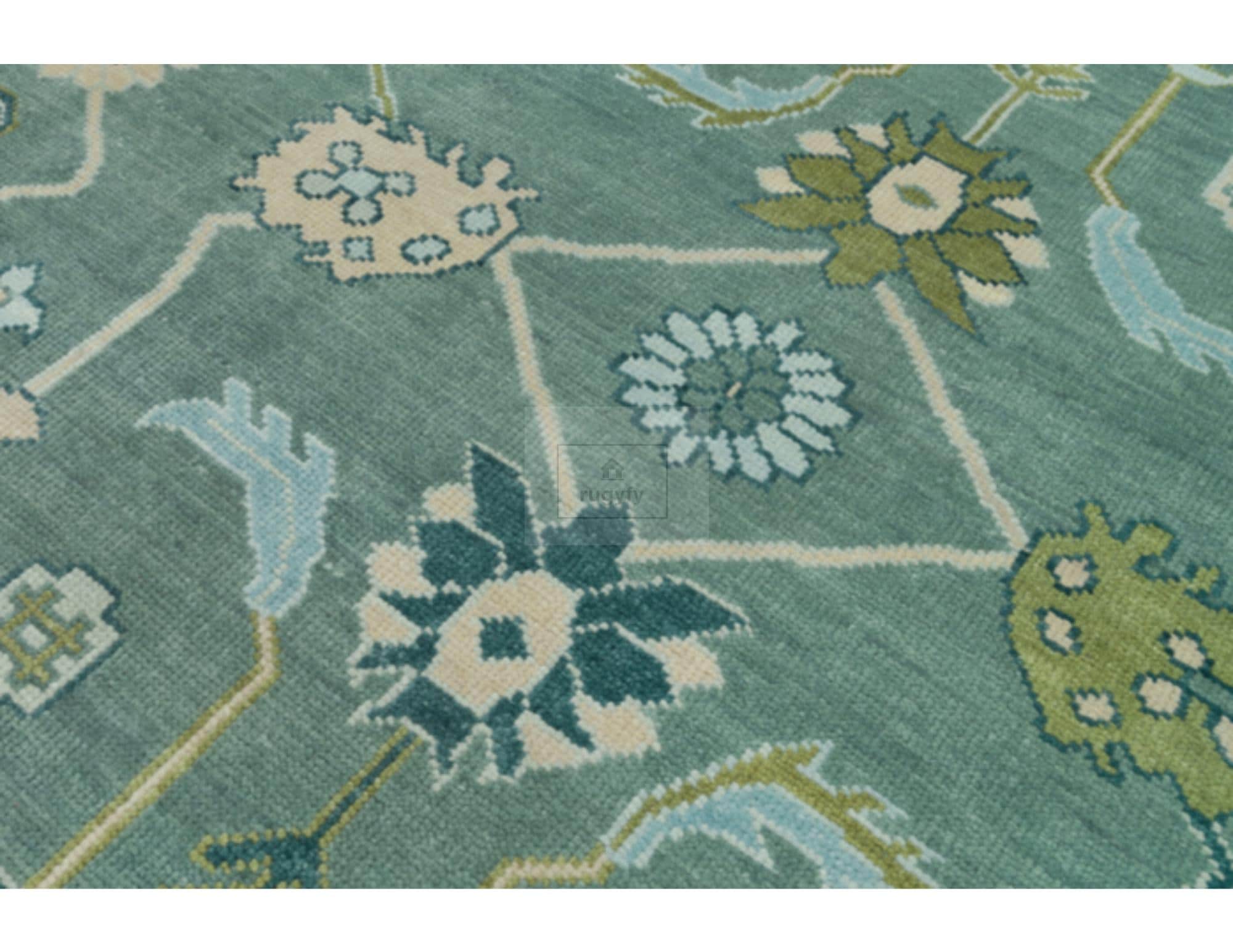 This rug embodies the 2026 trend toward nature-inspired interiors and heritage craftsmanship. The sage green and teal palette aligns with Etsy's 2026 Color of the Year — Patina Blue — bringing a sense of calm depth and restorative character to any room. The intricate botanical motifs reflect the biophilic decor movement, seamlessly blending traditional Oushak artistry with contemporary sensibilities.