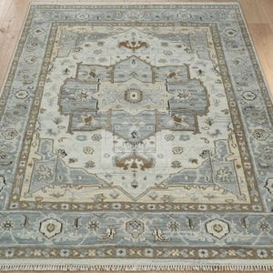 Keywords: hand-knotted rug, Oushak rug 8x10, Turkish rug, vintage style wool carpet, sage green and blush rug, Bhadohi India rug
