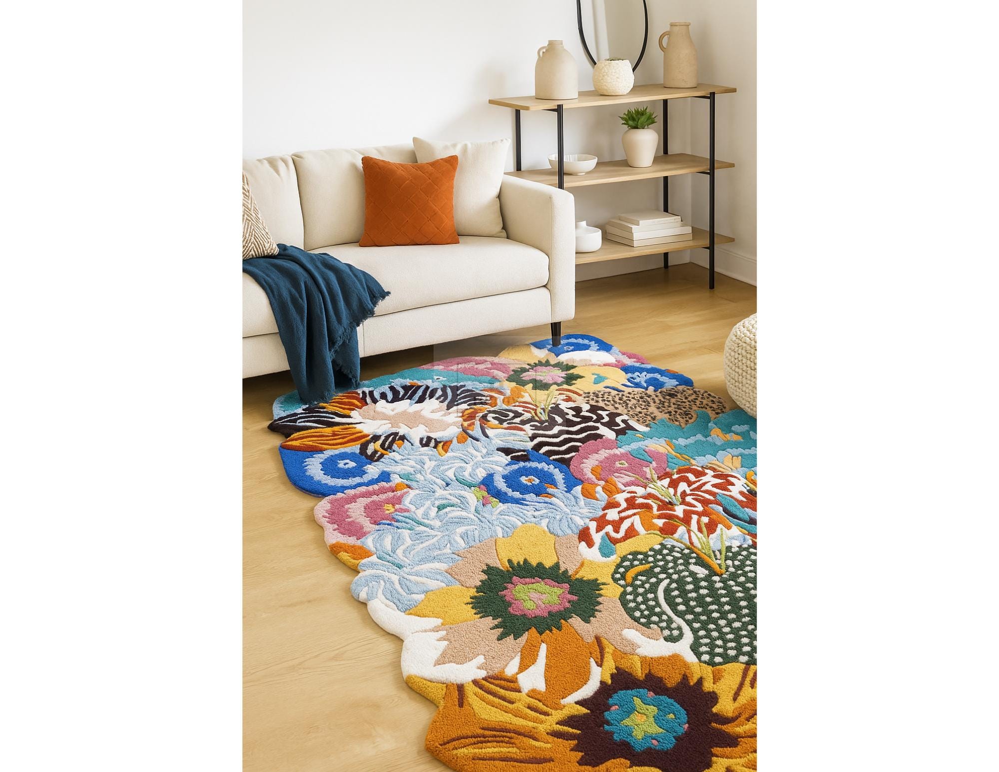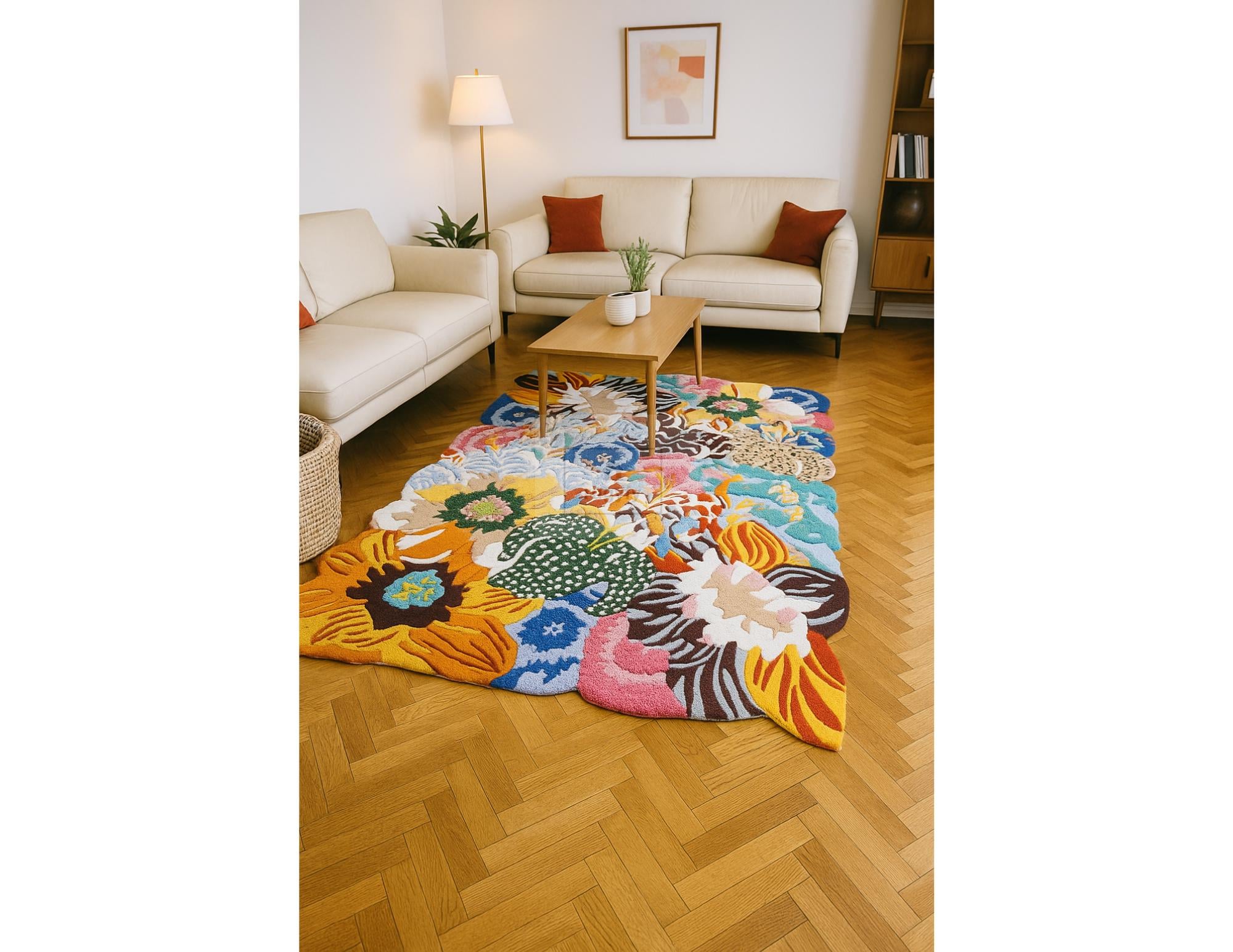 Make your floor the focal point with a hand-tufted wool flower-shaped area rug designed like a colorful “flower garden” collage. In the provided photos, the rug has an organic, irregular silhouette (not a standard rectangle) and oversized floral motifs—most notably a bold sunflower-style bloom—layered with botanical shapes and graphic petal details. The palette is intentionally high-impact: mustard/yellow and orange warmth balanced with blues, teal/green, purples, pinks, cream, and dark contrast.