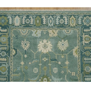 Keywords: hand-knotted rug, Oushak rug 8x10, Turkish rug, vintage style wool carpet, sage green and blush rug, Bhadohi India rug