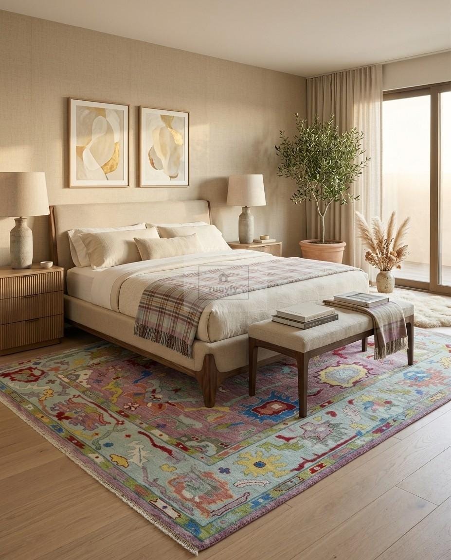 This versatile pastel Oushak rug pairs beautifully with modern, bohemian, Scandinavian, and transitional interiors. Style it under a sofa, bed, or dining table to soften your space with color and texture. Easy to maintain—vacuum regularly (without beater bar) and spot clean as needed. Slight shedding is normal for natural wool rugs and reduces over time. If you’re looking for a statement rug that combines craftsmanship, luxury, and timeless design, this is an investment piece you’ll enjoy for years.