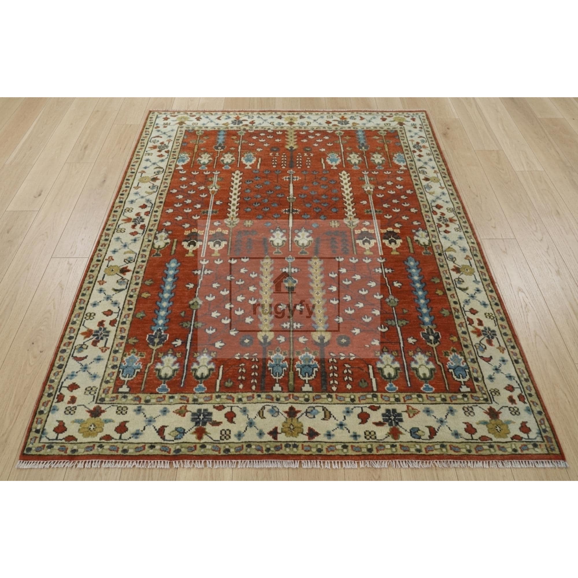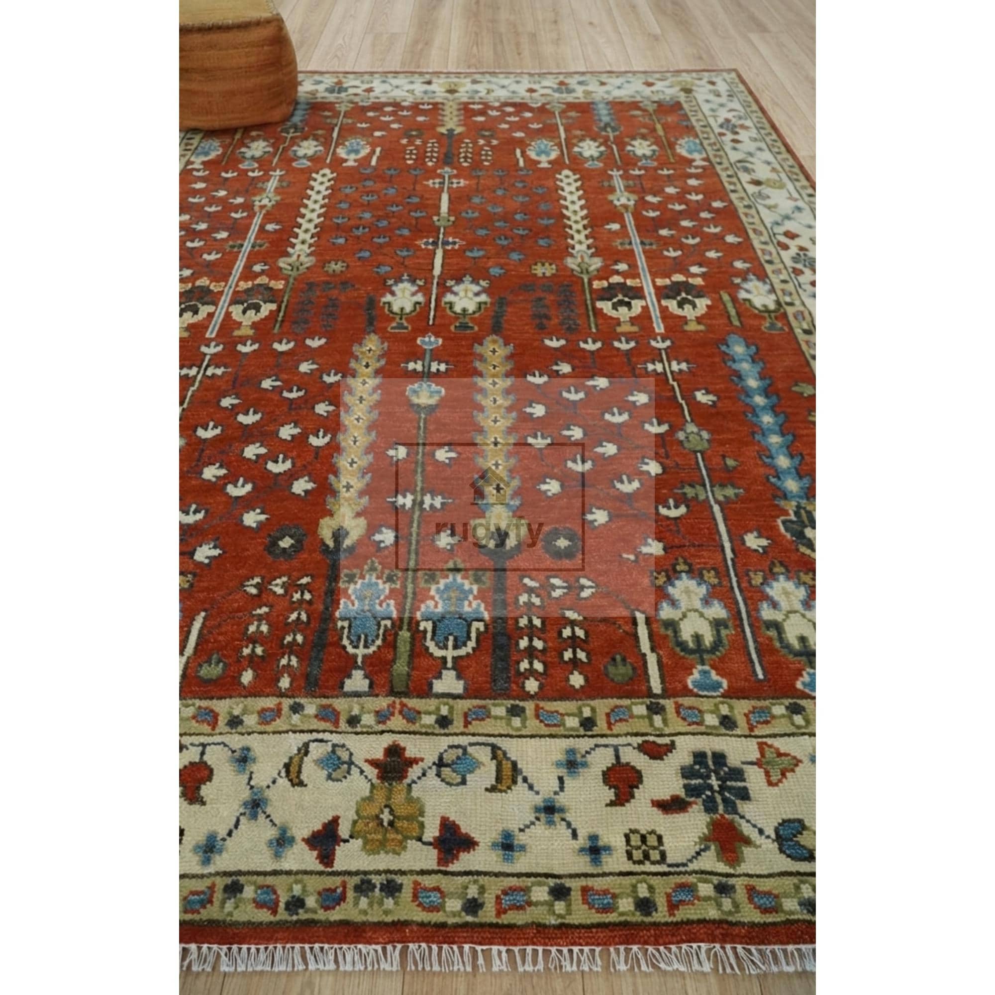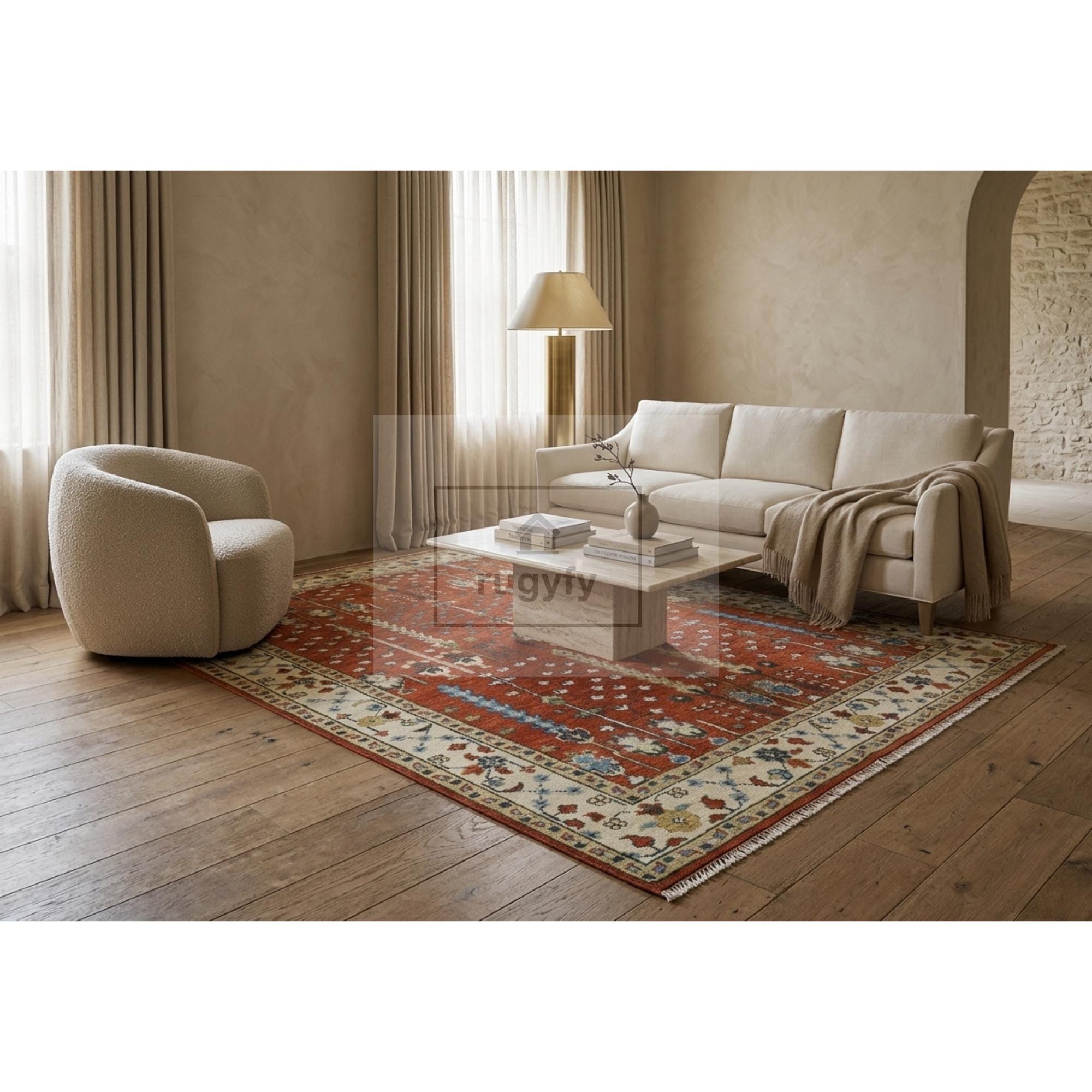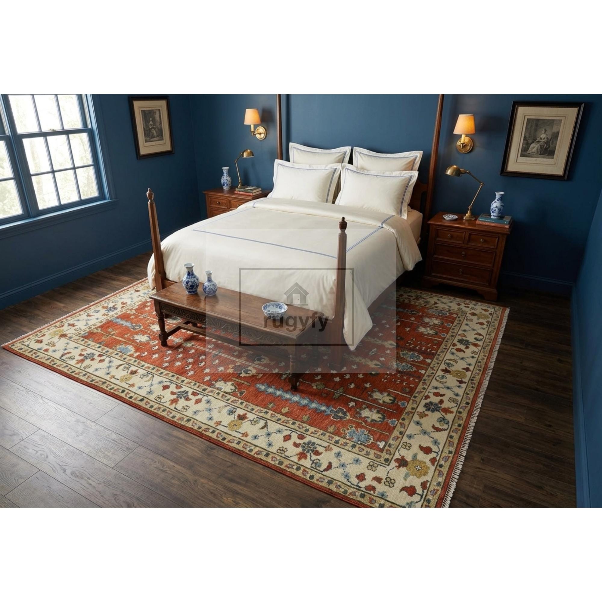 Warm. Commanding. Unforgettable. This hand knotted rust red floral rug is the room's conversation starter — the piece that makes guests ask where you found it. A deep terracotta-rust field woven with Ottoman botanical sprays, ivory florals, and sky blue accent blooms creates a palette that is simultaneously maximalist and timeless. Whether anchoring a formal dining room under a 9x12 or warming a master bedroom in 8x10, this wool carpet sets the entire room's energy. Designed in the Ottoman floral tradition and hand knotted by master weavers in Bhadohi — India's weaving capital since the 16th century — this is heritage you can feel underfoot.
