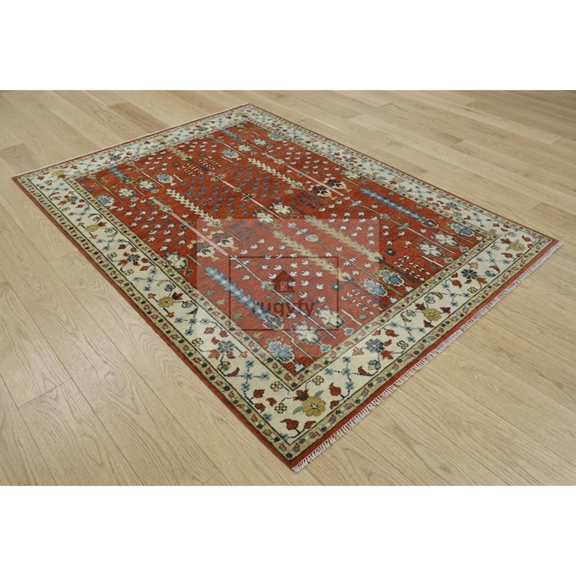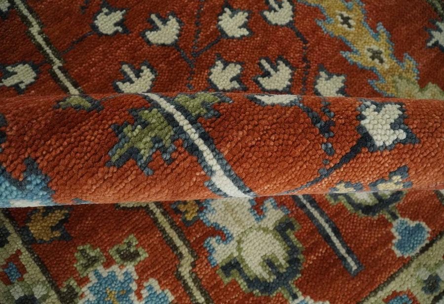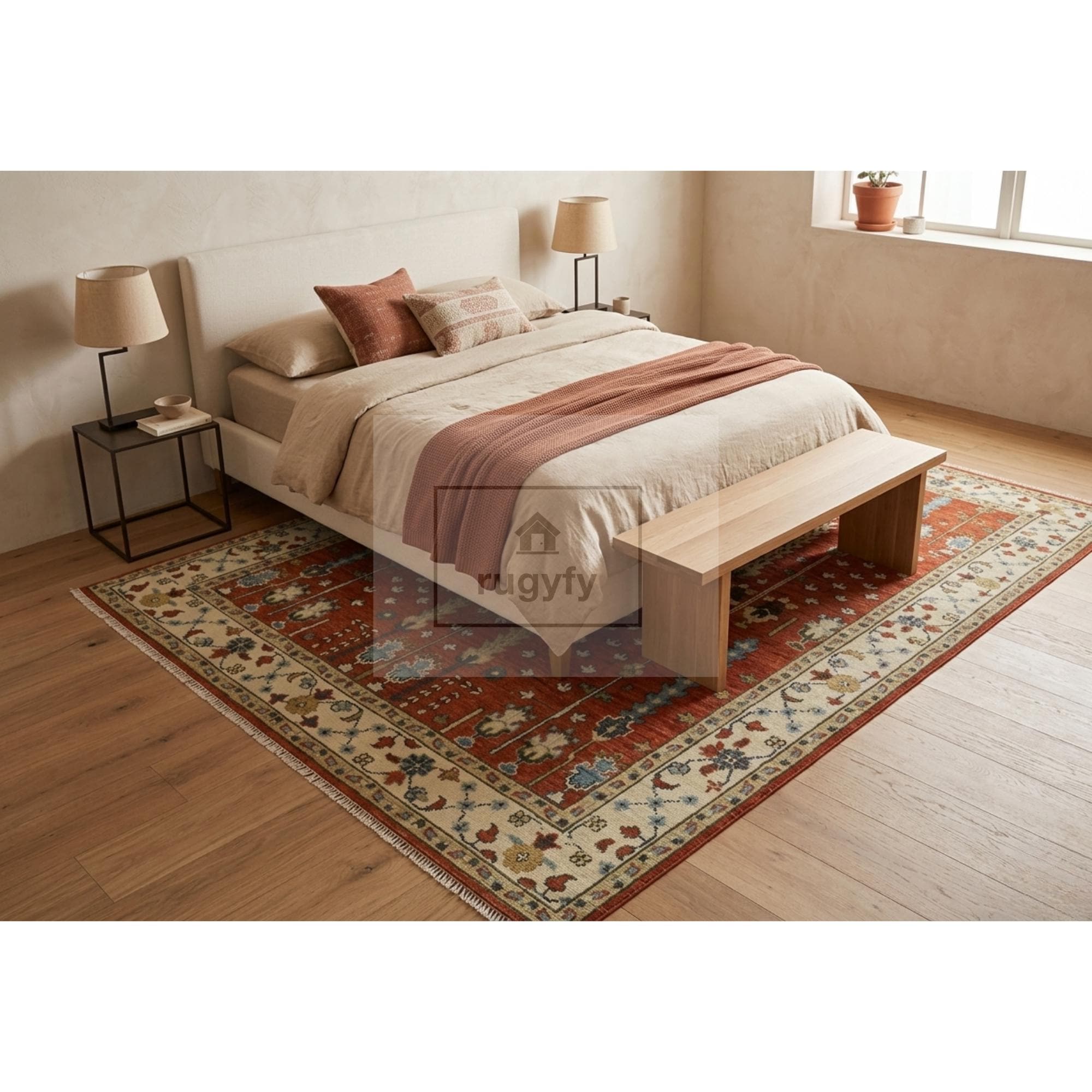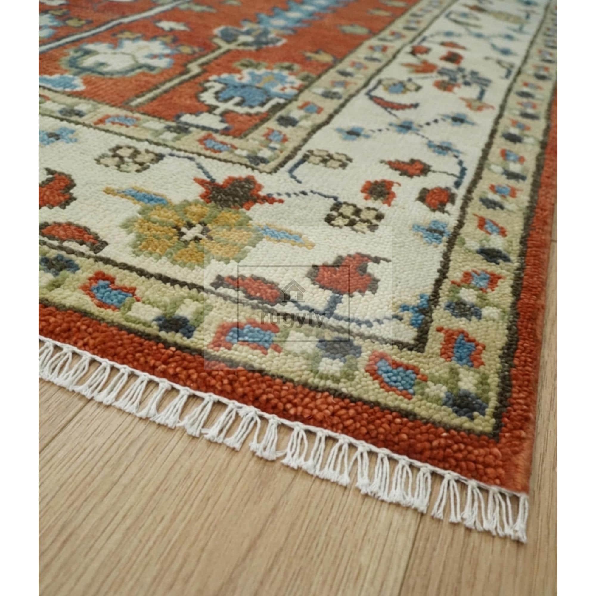Warm. Commanding. Unforgettable. This hand knotted rust red floral rug is the room's conversation starter — the piece that makes guests ask where you found it. A deep terracotta-rust field woven with Ottoman botanical sprays, ivory florals, and sky blue accent blooms creates a palette that is simultaneously maximalist and timeless. Whether anchoring a formal dining room under a 9x12 or warming a master bedroom in 8x10, this wool carpet sets the entire room's energy. Designed in the Ottoman floral tradition and hand knotted by master weavers in Bhadohi — India's weaving capital since the 16th century — this is heritage you can feel underfoot.