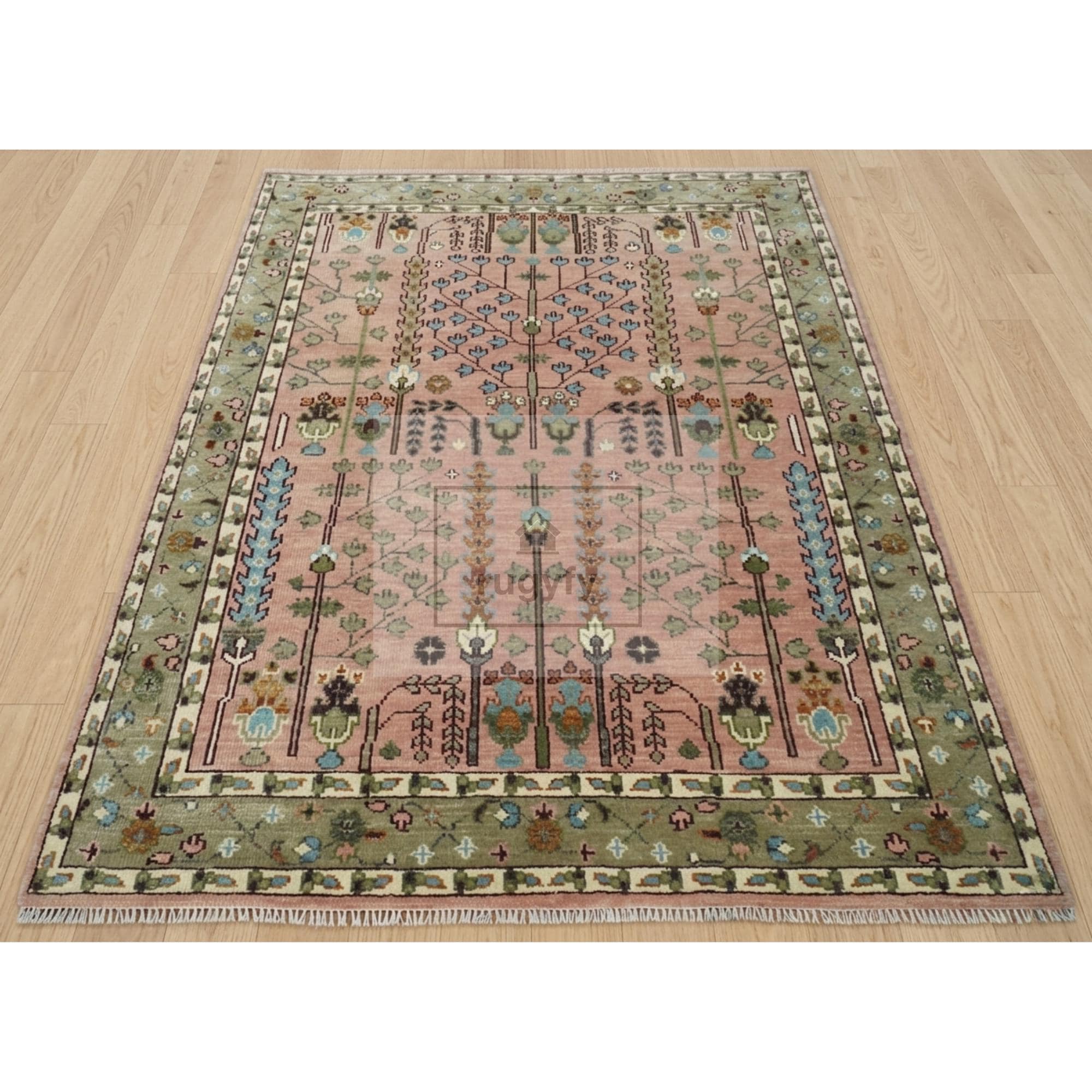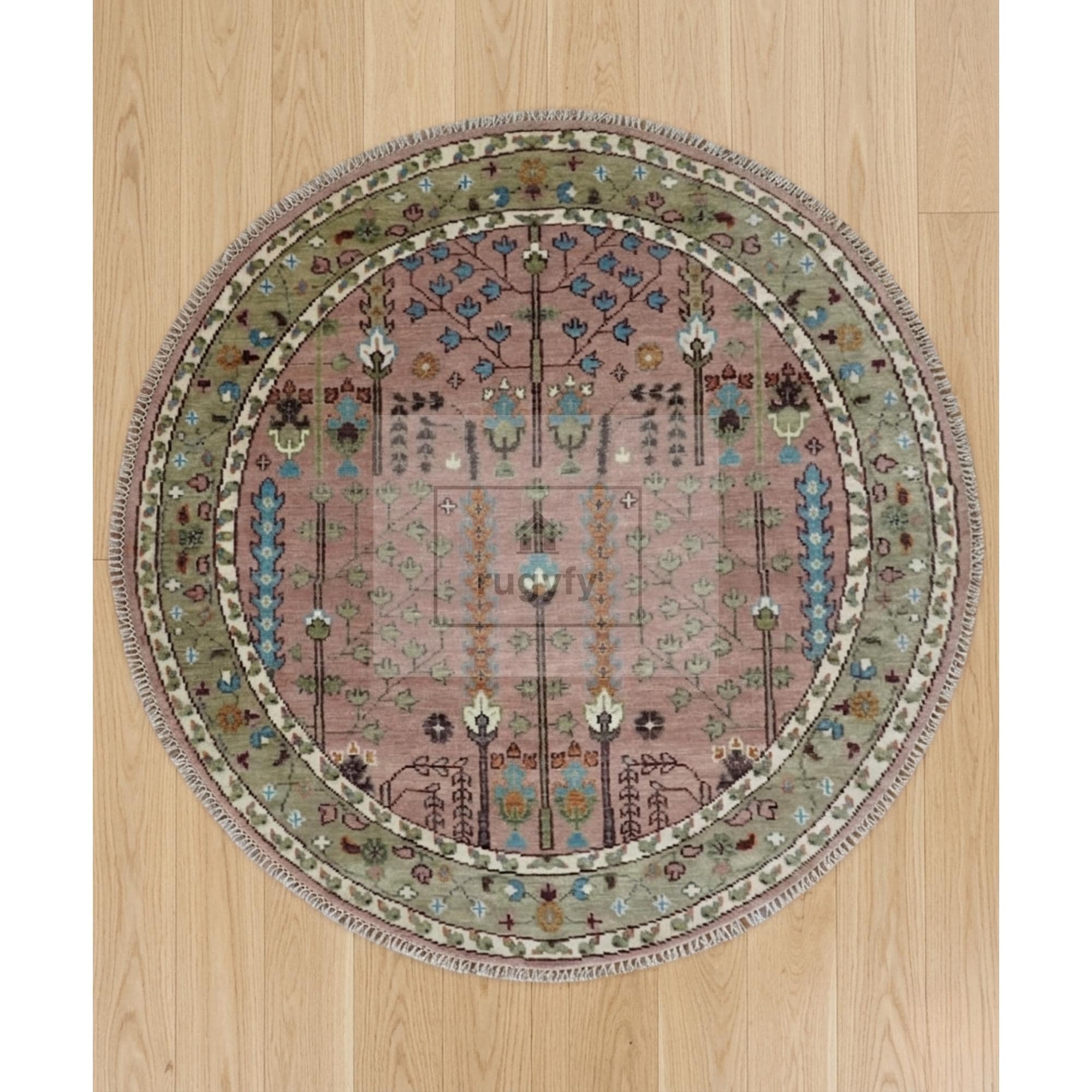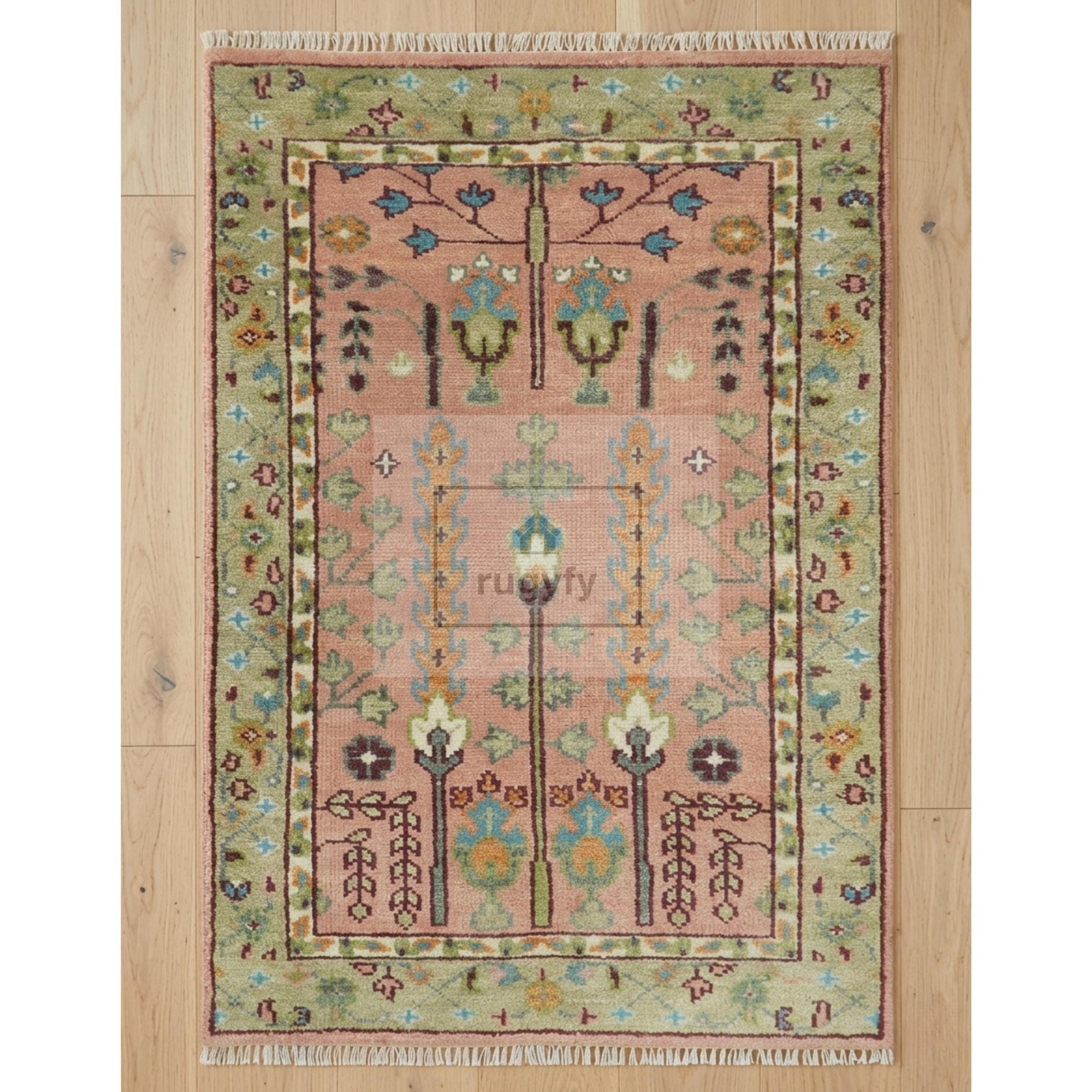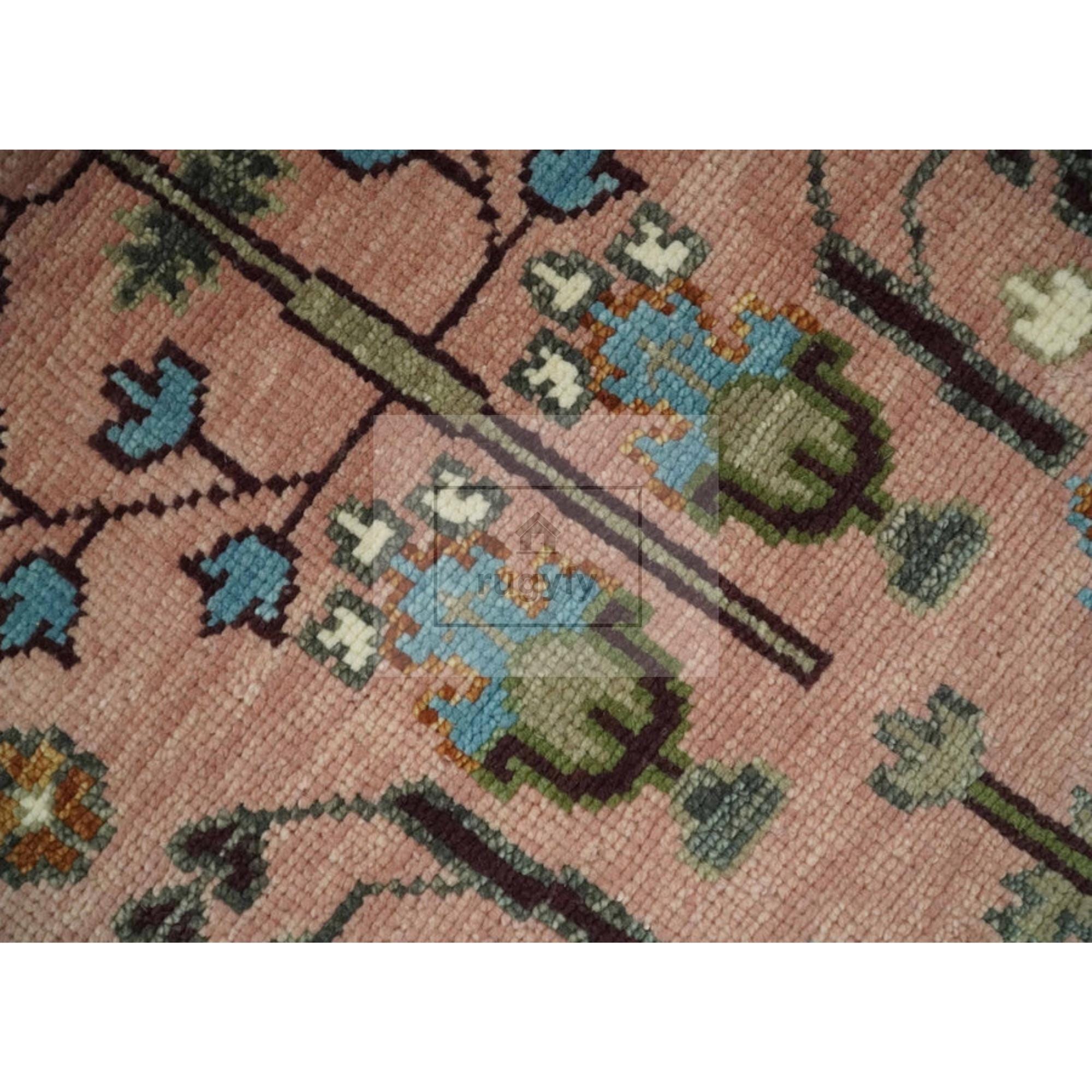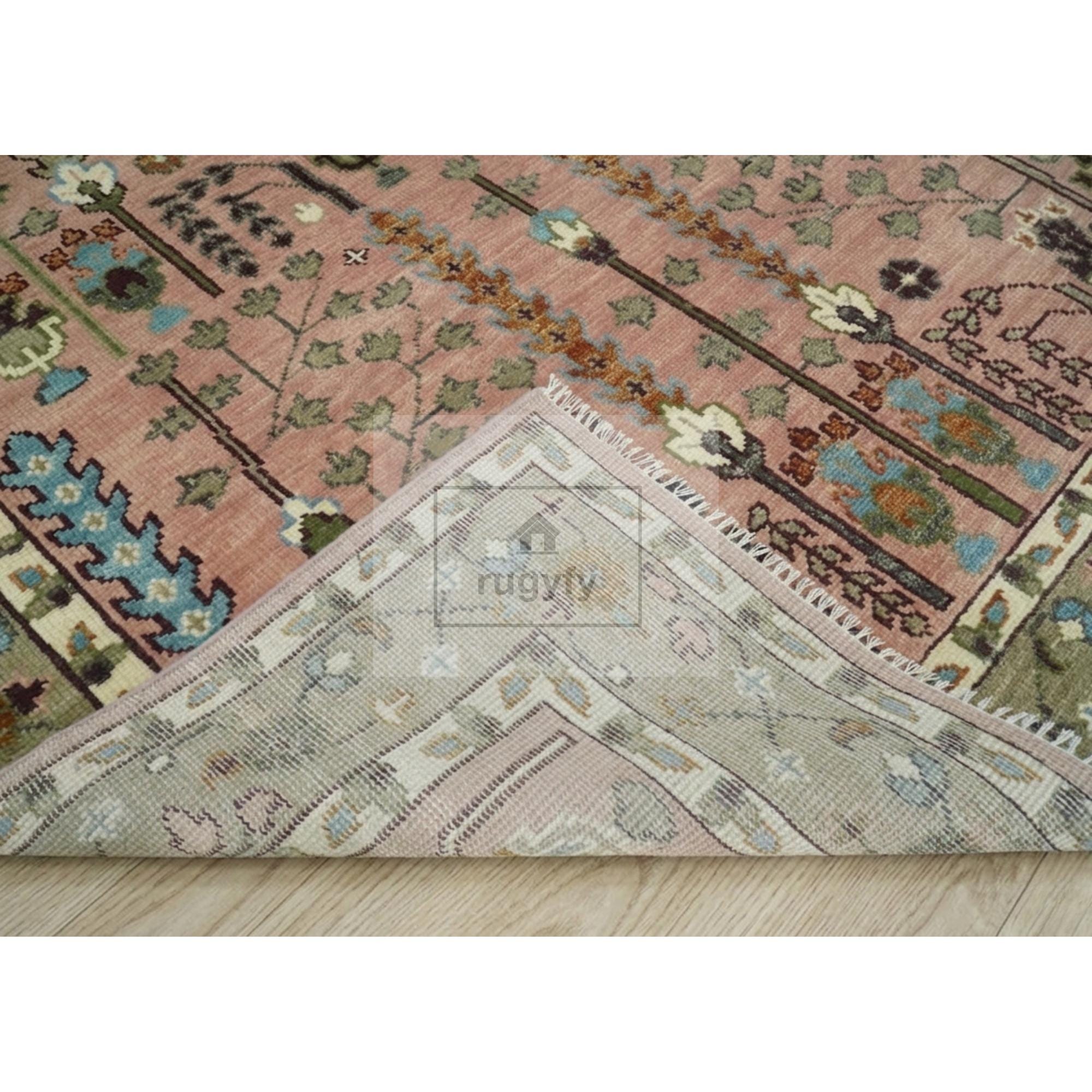 Step into a garden of heirloom beauty — this blush pink hand-knotted oushak rug weaves a timeless Tree of Life motif across a warm dusty rose field, bringing Anatolian artistry straight into your living room.