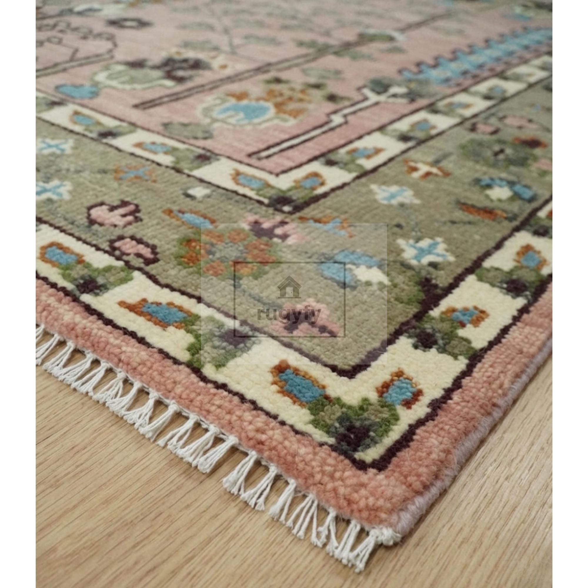 Keywords: hand-knotted rug, Oushak rug 8x10, Turkish rug, vintage style wool carpet, sage green and blush rug, Bhadohi India rug