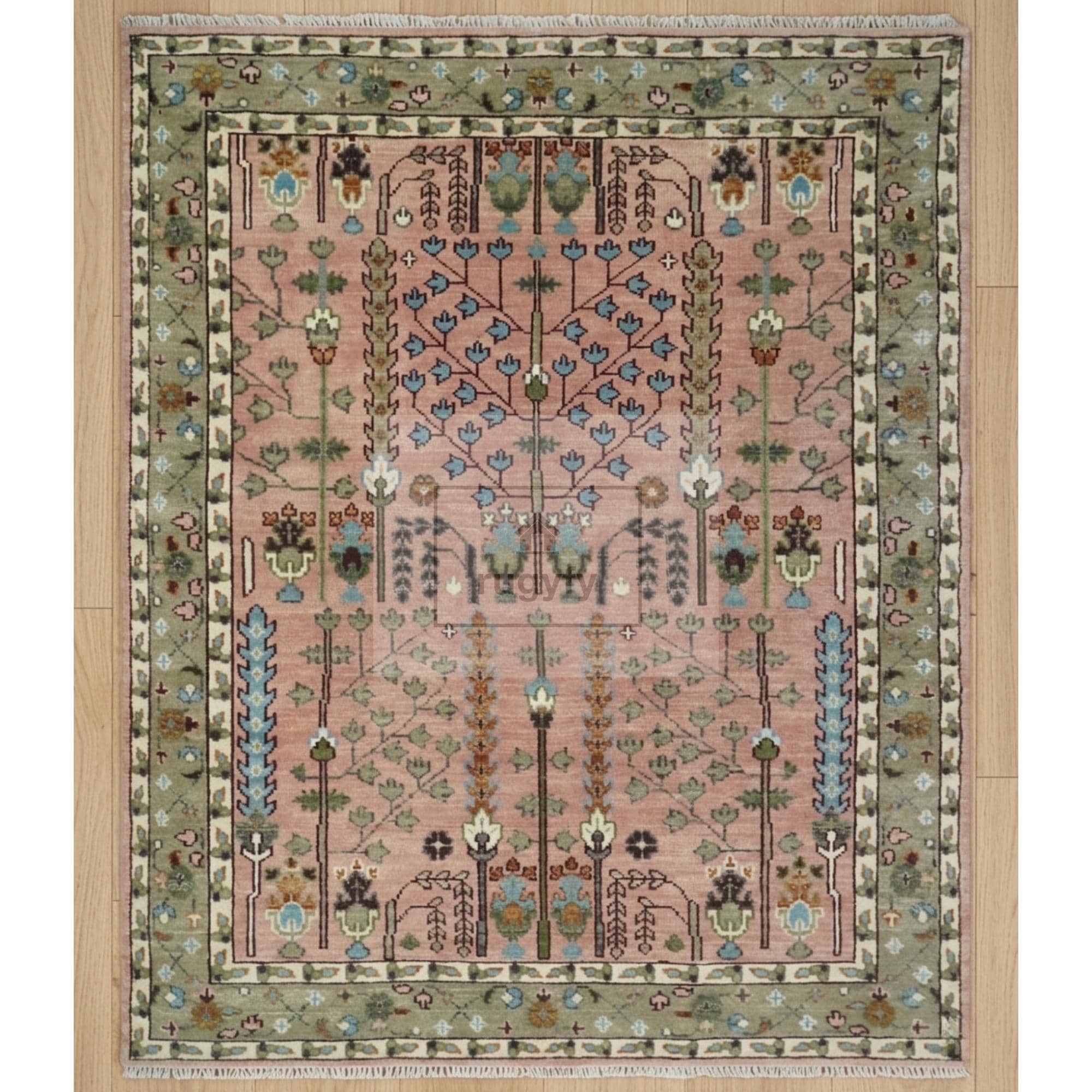 Crafted in the tradition of Turkish Oushak master weavers, this 8x10 wool area rug is hand-knotted knot by knot by artisan craftsmen in Bhadohi, India — the ancient carpet-weaving capital whose looms have run since the reign of Emperor Akbar in the 16th century. The pile is built from 100% premium New Zealand wool, hand-spun for natural luster and exceptional softness underfoot. The pattern — an Anatolian paradise garden with rising cypress trees, stylized tulip blooms, lotus buds, and climbing botanical vines — echoes centuries of nomadic and Ottoman court textile tradition. An ivory cream inner guard border frames the blush field, encased in a rich sage green main border filled with scrolling foliage. Accent colours of sky blue, amber, and deep chocolate complete the naturally-dyed palette. Approximate size 8x10 ft; hand-knotted rugs may vary +/- 2-3 inches.