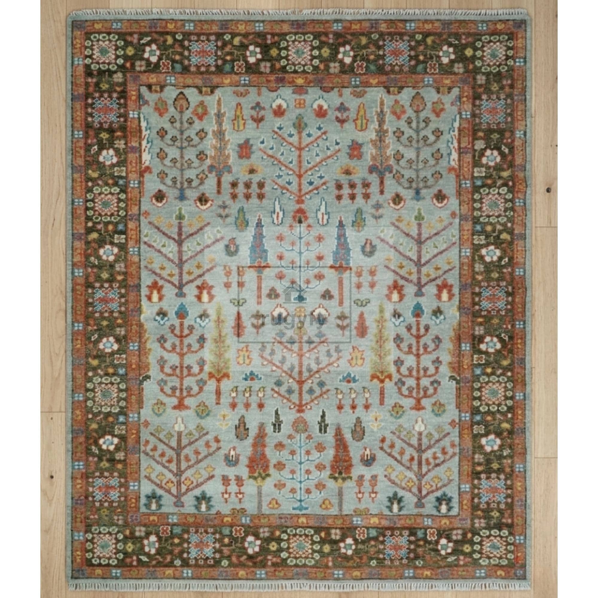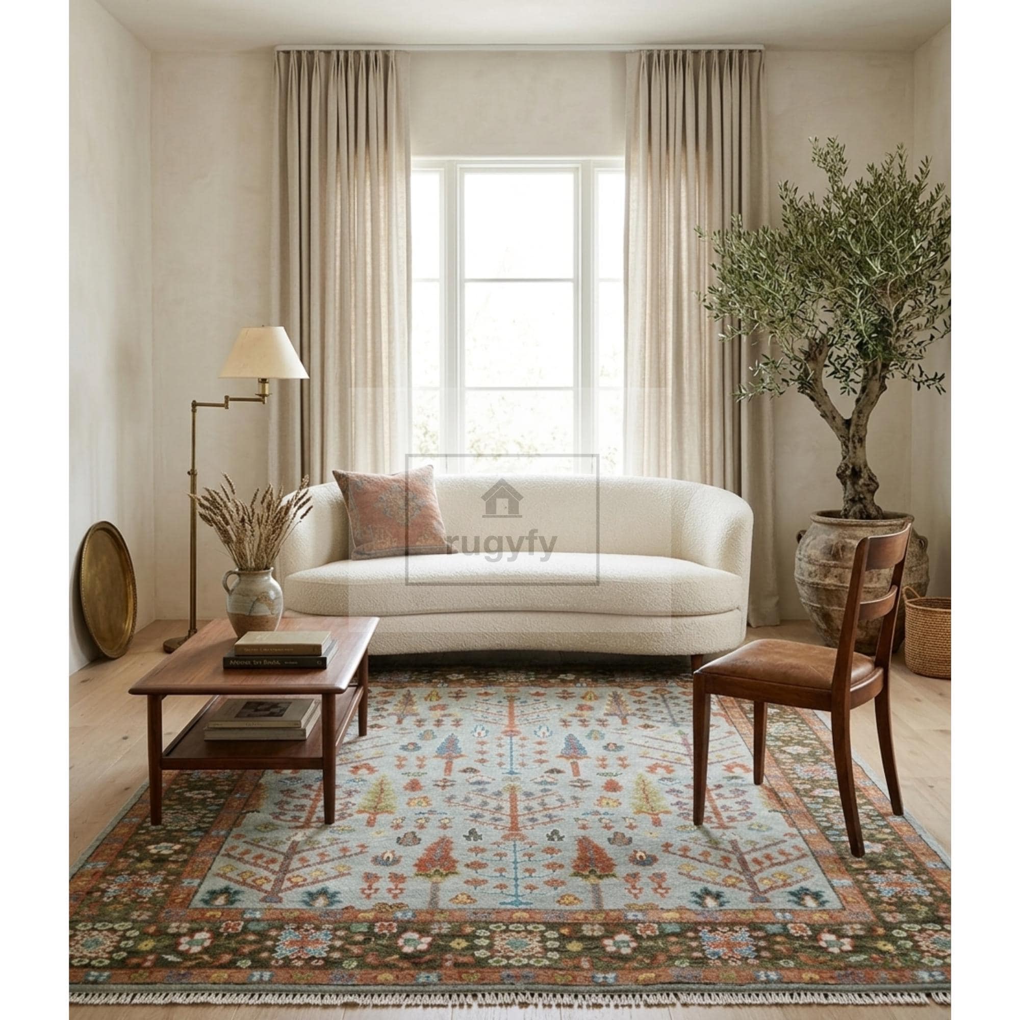 The Tree of Life is one of the oldest symbols in Anatolian carpet weaving — representing growth, protection, and connection to the earth. This piece captures that symbolism in a colorway that speaks directly to 2026's leading interior trends: Patina Blue (Etsy Color of the Year), biophilic design, and heritage maximalism. The blue-gray field is grounded by rust-red trees branching upward, accented by ivory, teal, gold, and sage botanical motifs. The deep olive-brown border anchors the composition with floral geometric repeats, keeping the design cohesive without competing with surrounding furniture.