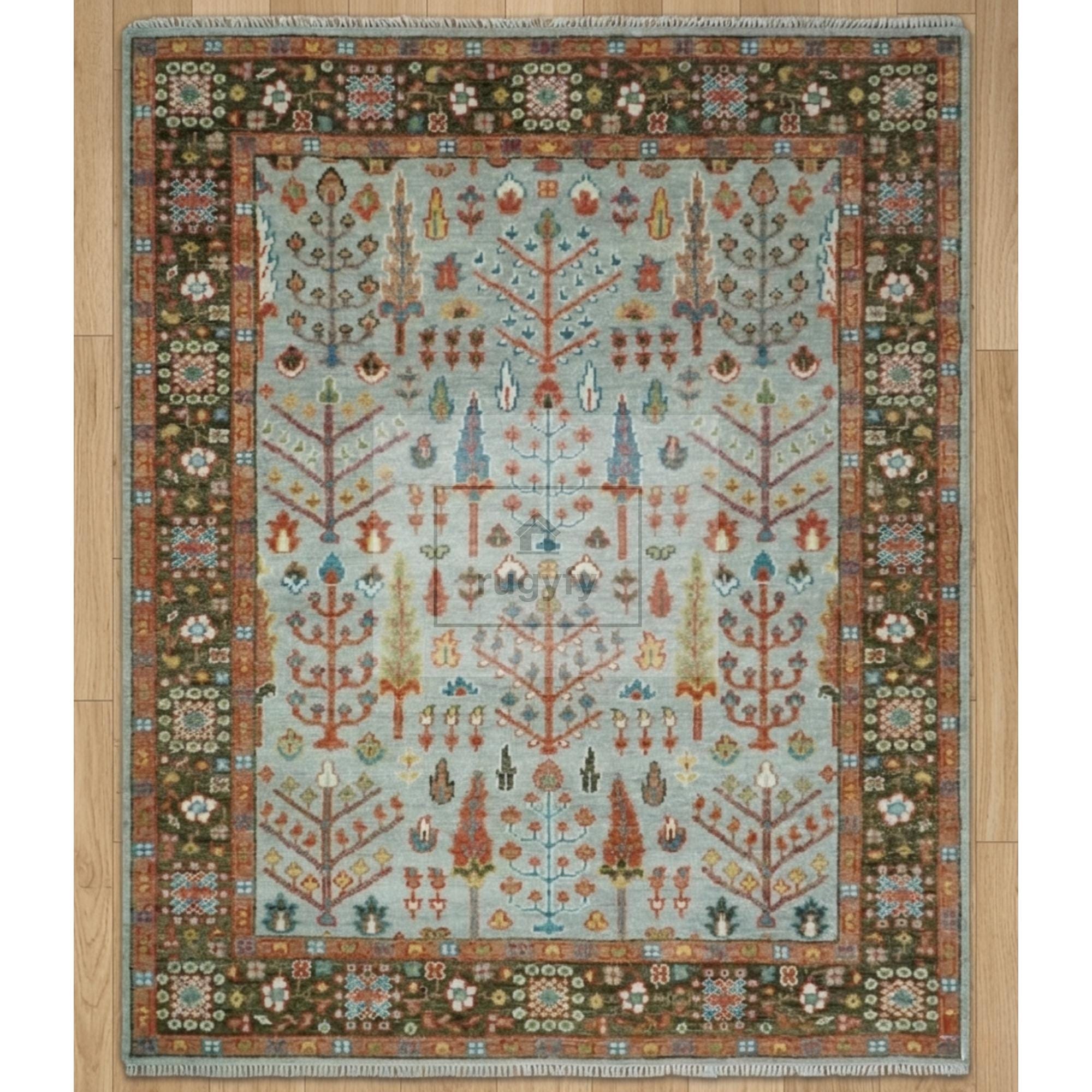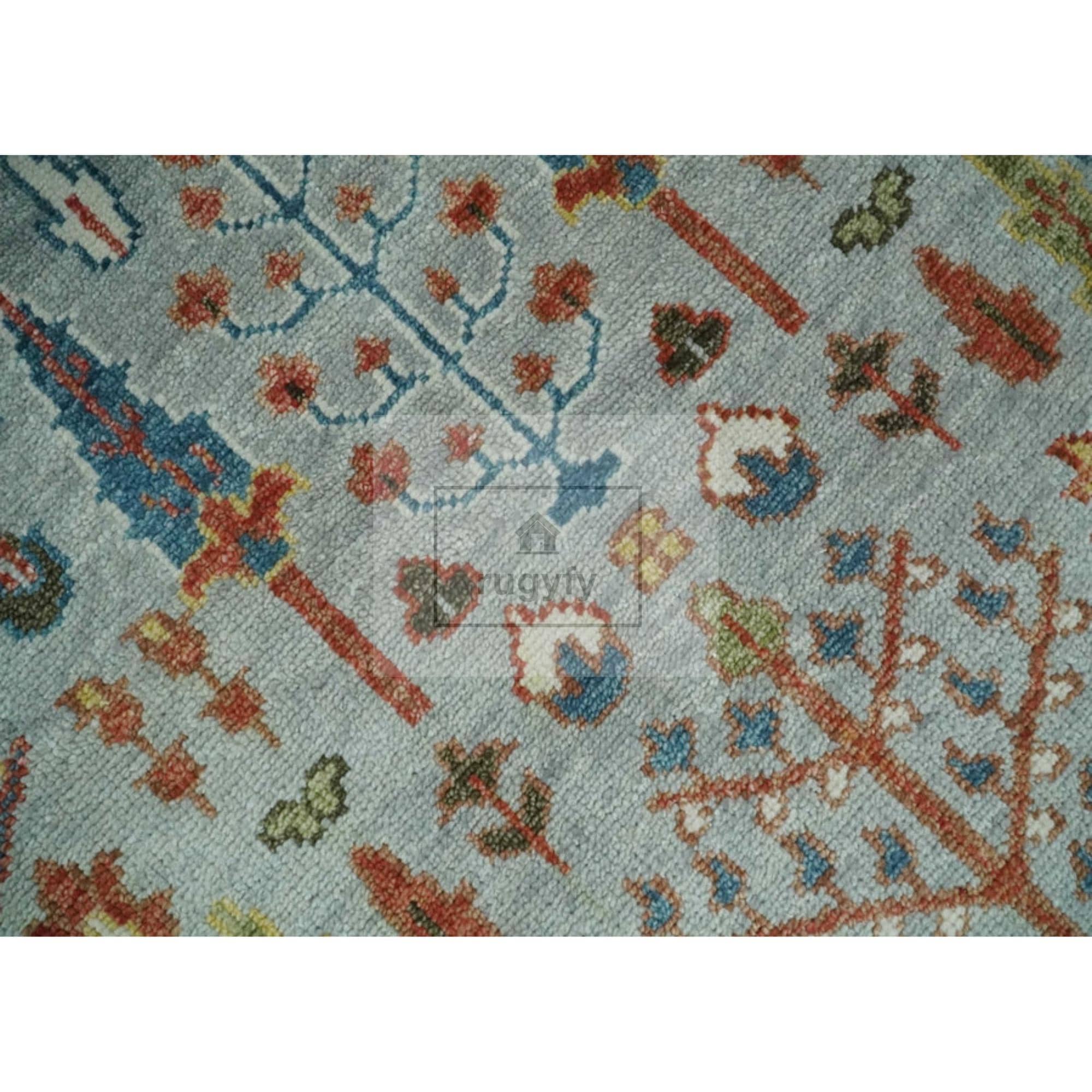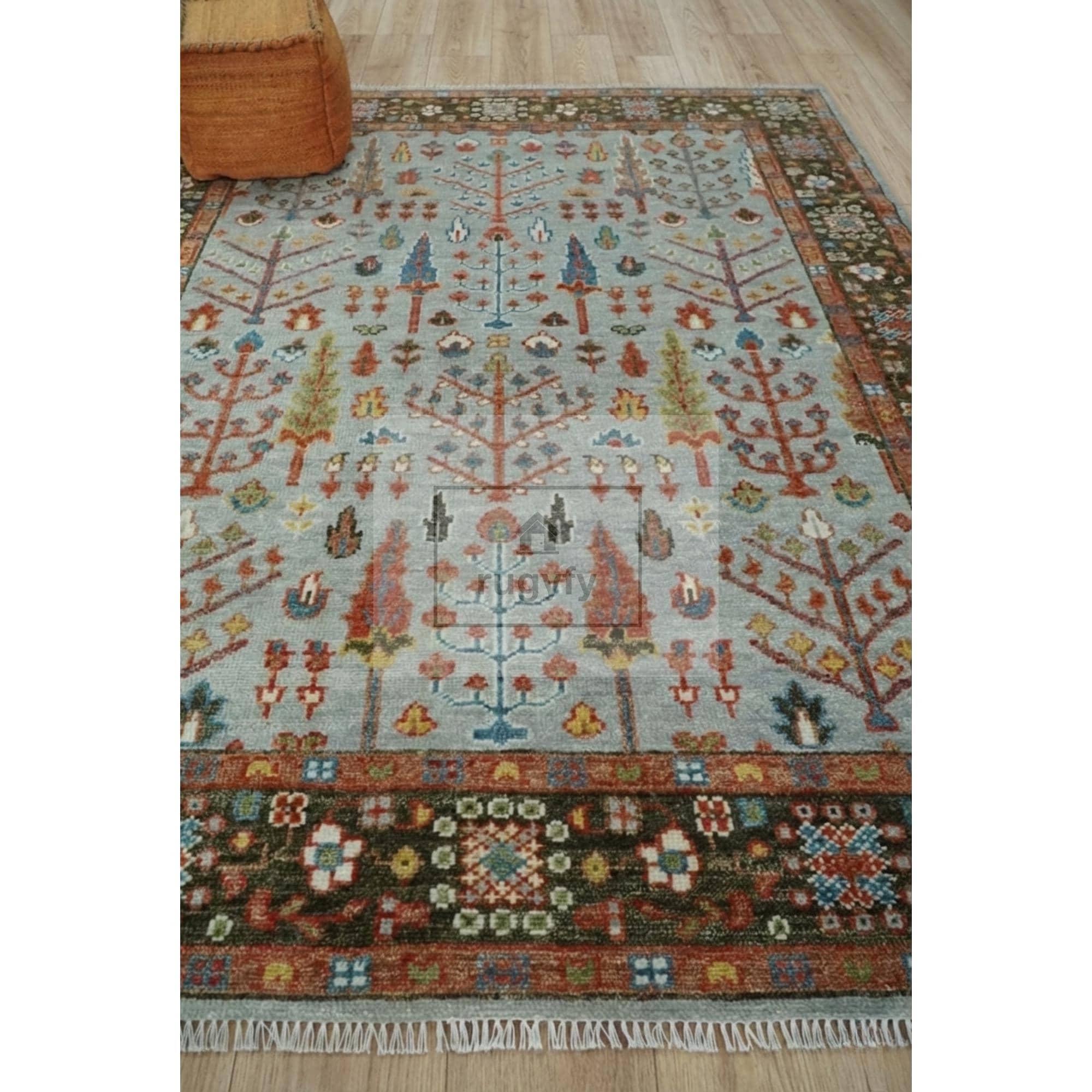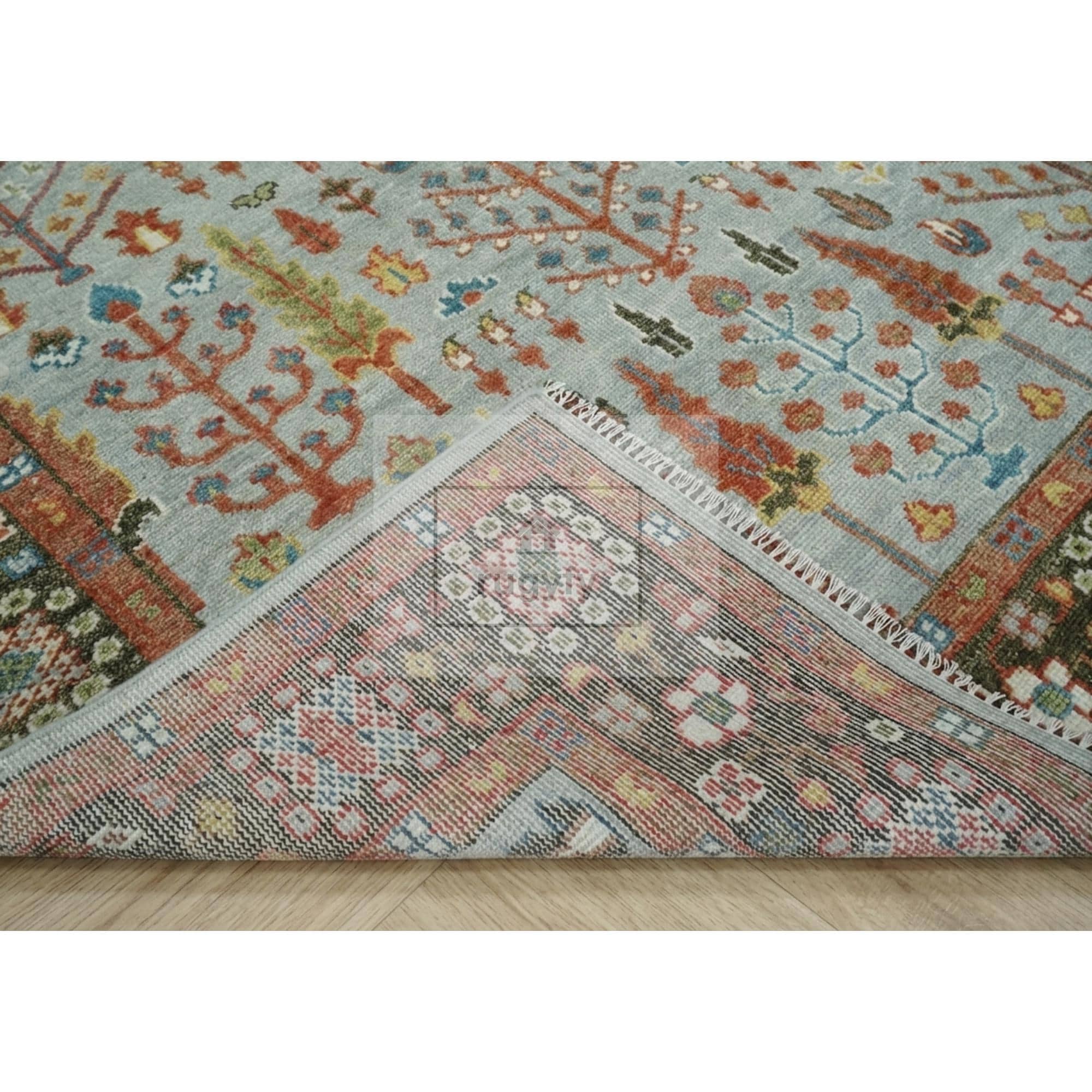 A Tree of Life hand-knotted Oushak rug in patina blue-gray with rust-red branches — woven in the Anatolian tradition, crafted for rooms that tell stories.