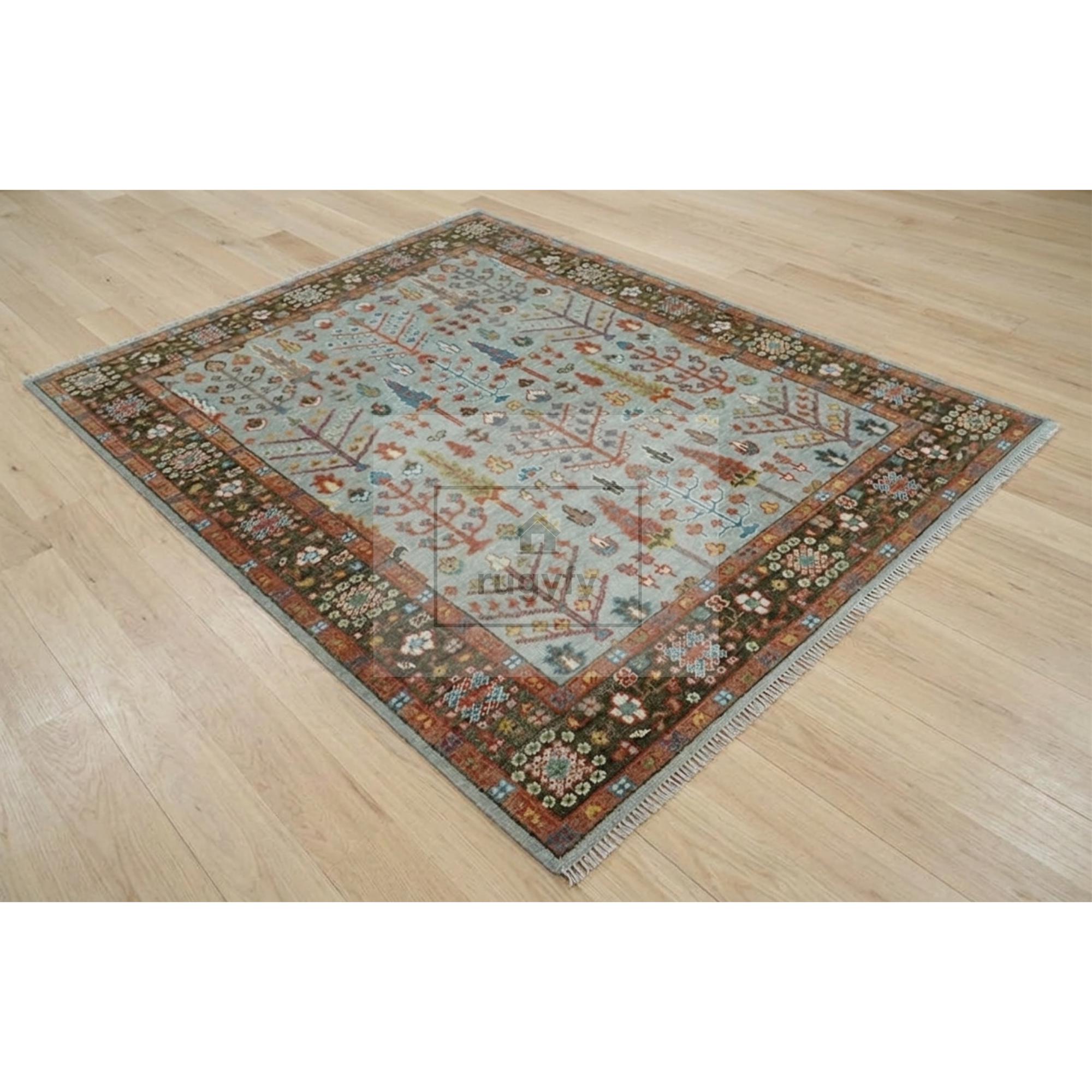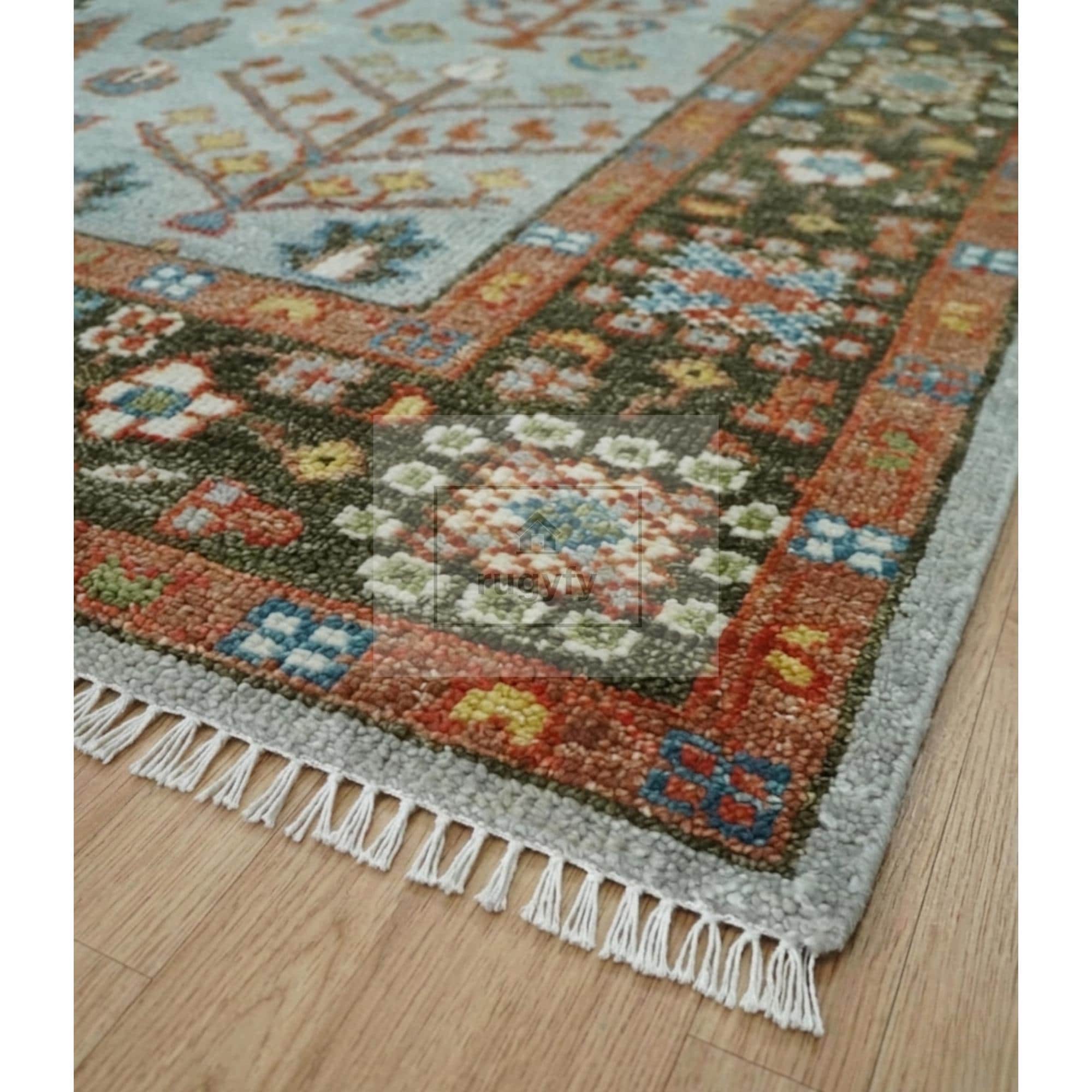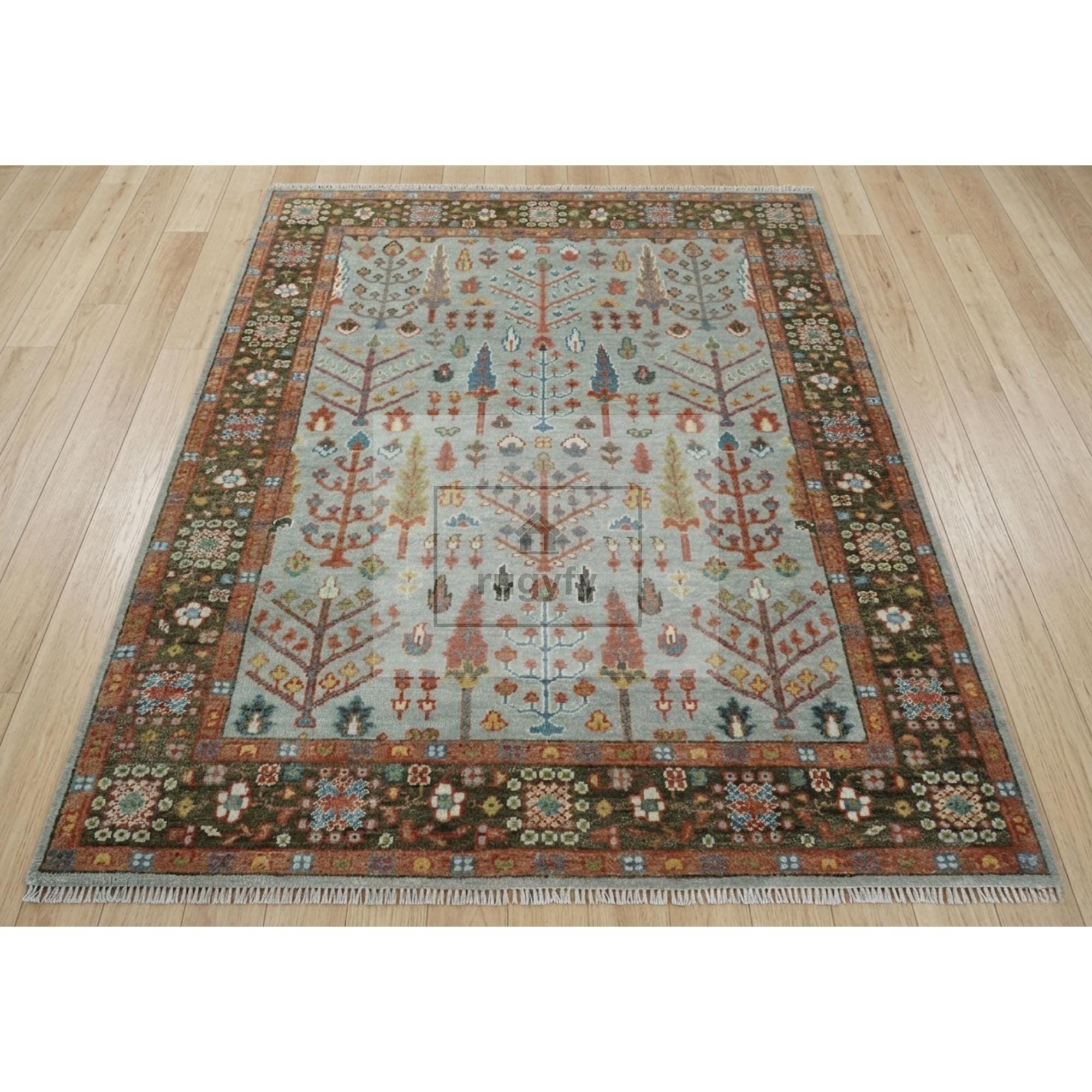 This Turkish Oushak-style hand-knotted wool rug features the timeless Tree of Life motif rendered across a serene blue-gray field, bordered by a rich olive-brown frame alive with floral medallions. Knotted entirely by hand using 100% New Zealand wool — prized for its superior softness, hypoallergenic properties, and lasting durability — this rug carries the quality marker of true Anatolian tribal craftsmanship.
