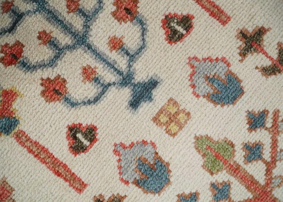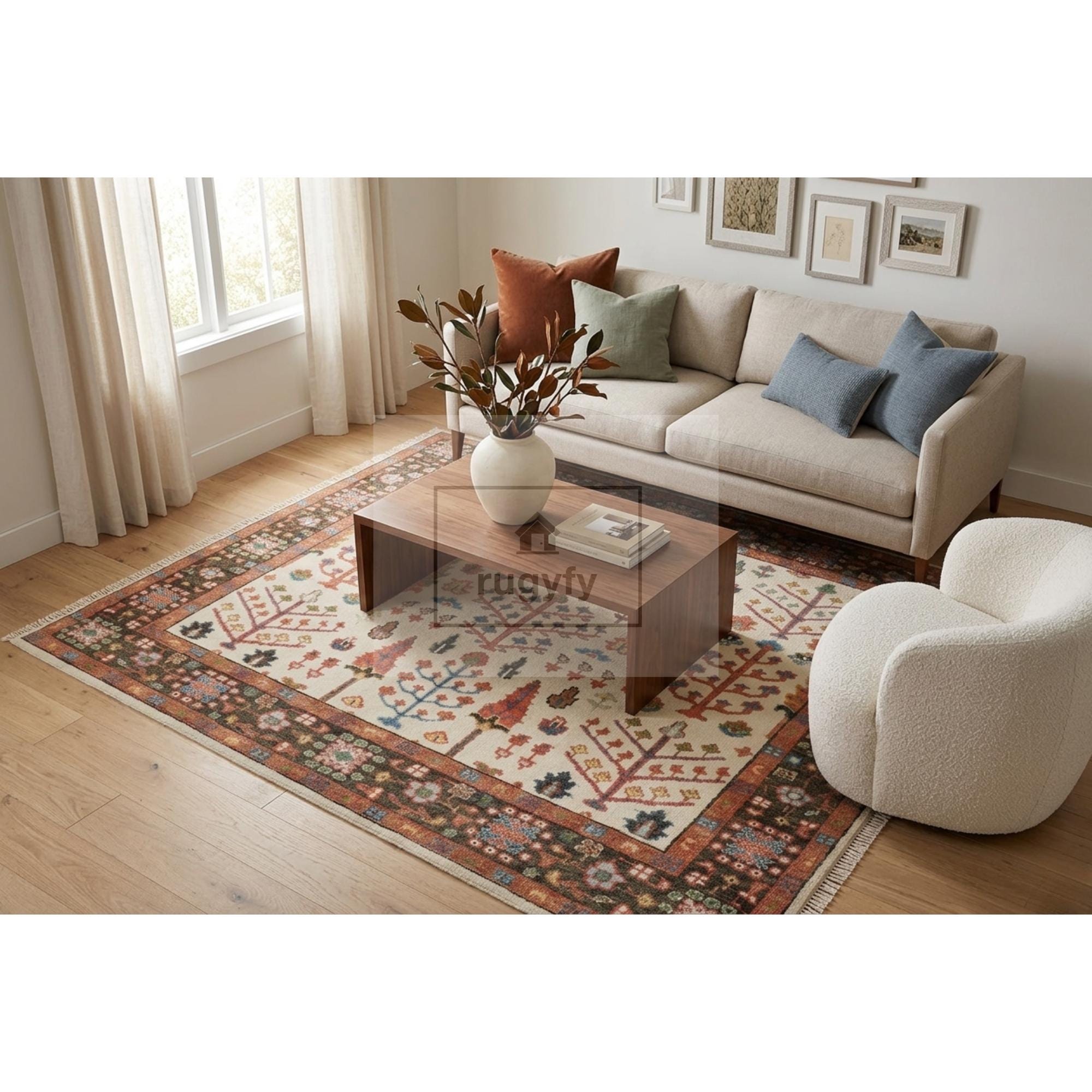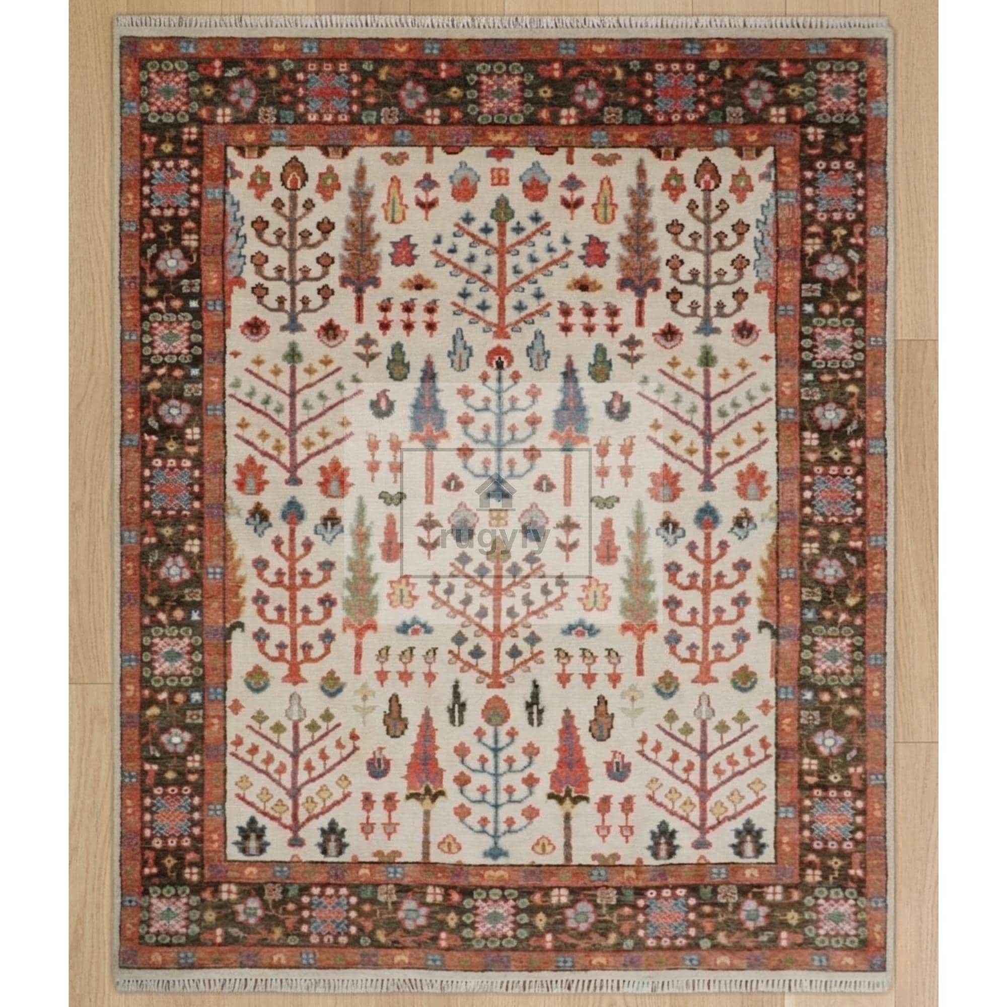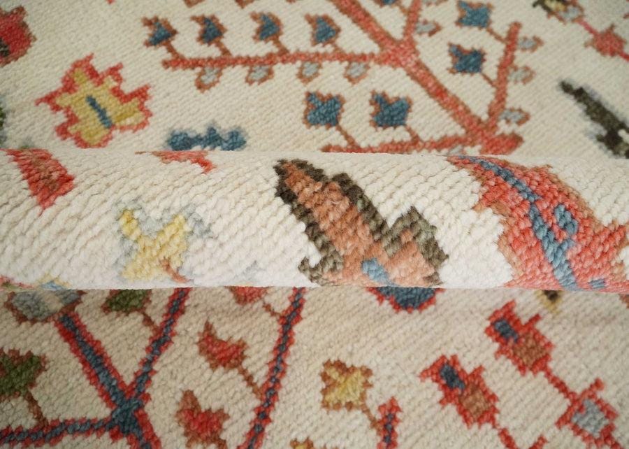 Bring timeless Turkish artistry into your home with this hand-knotted Tree of Life Oushak rug, woven on traditional looms in the Bhadohi-Mirzapur weaving belt of India. The ivory field blooms with stylized cypress and tree-of-life motifs in rust, coral, teal, sage, navy, and gold — framed by a richly detailed terracotta border drawn from antique Anatolian textiles. A true heirloom-quality piece designed to anchor a room for generations.