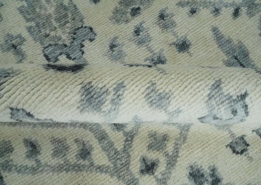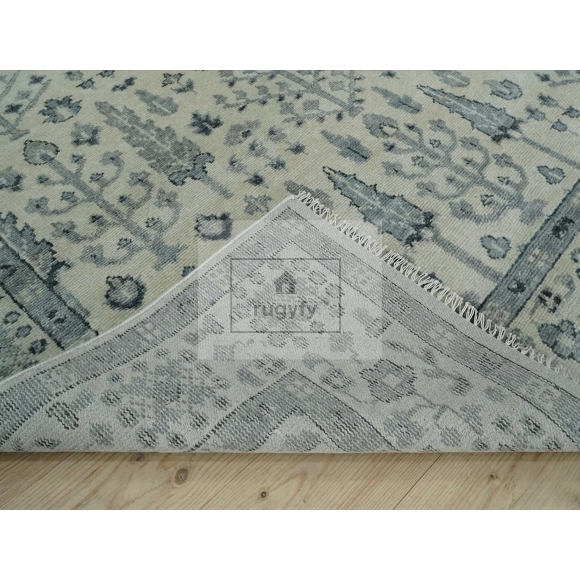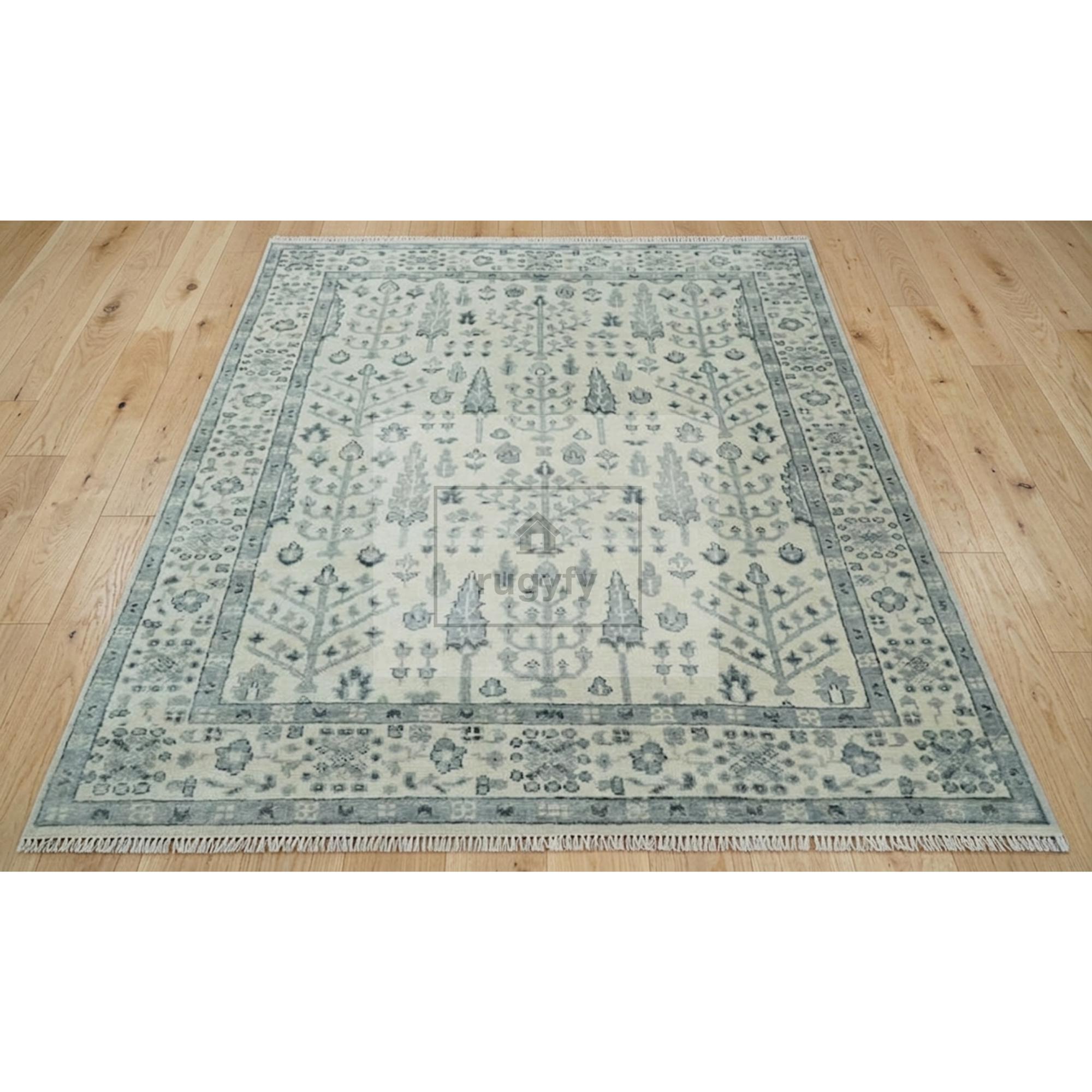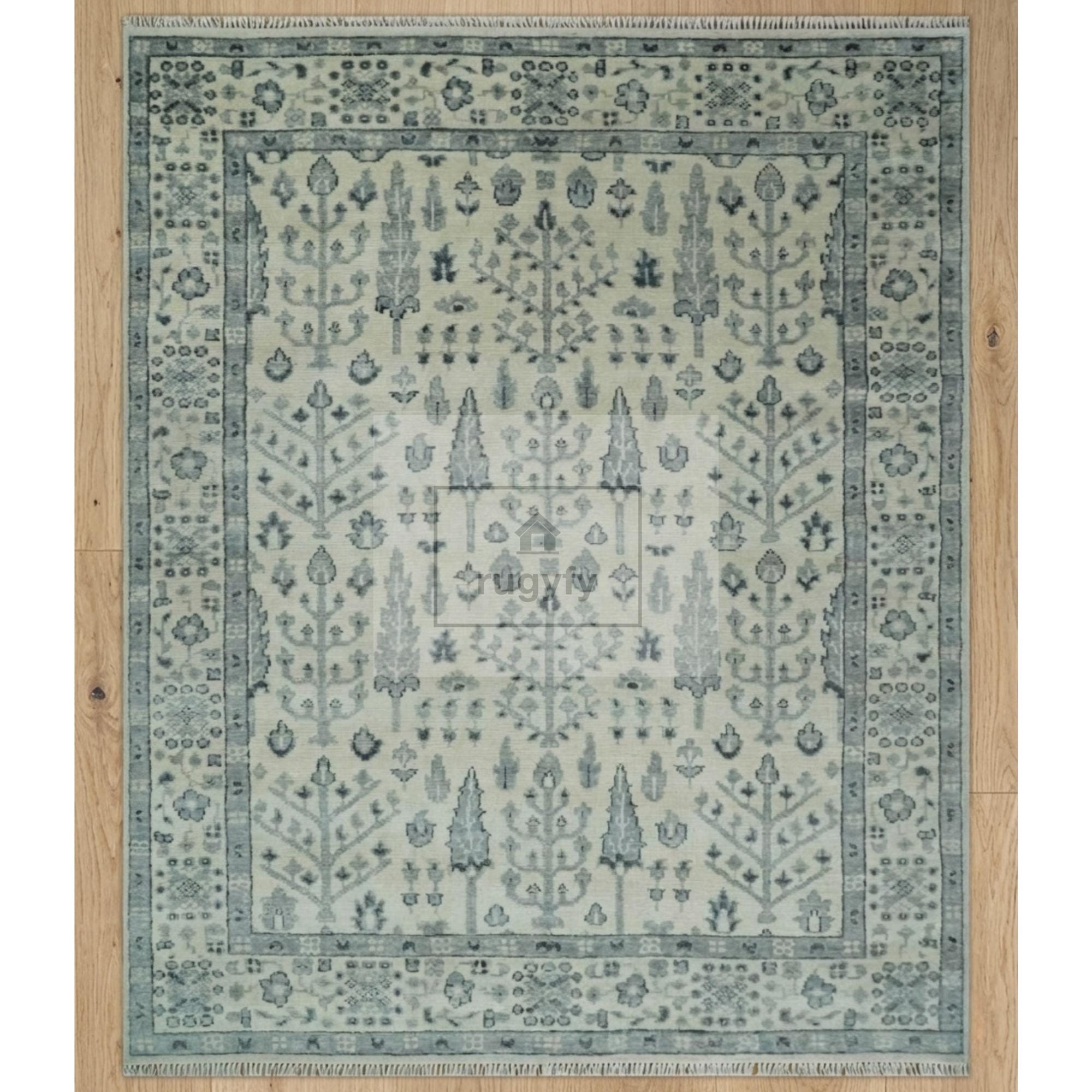 Hand-knotted in the Bhadohi weaving belt of India, this ivory and slate-blue Oushak rug brings a quiet, coastal-farmhouse serenity into any room. Woven in 100% New Zealand wool, the Tree of Life motif whispers a biophilic calm — soft cypress silhouettes and botanical sprigs drifting across a cream ground, framed by a gently tonal border.