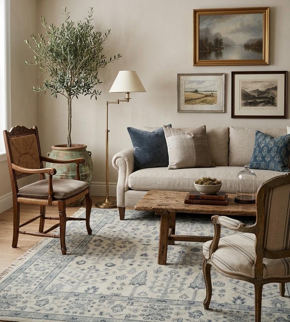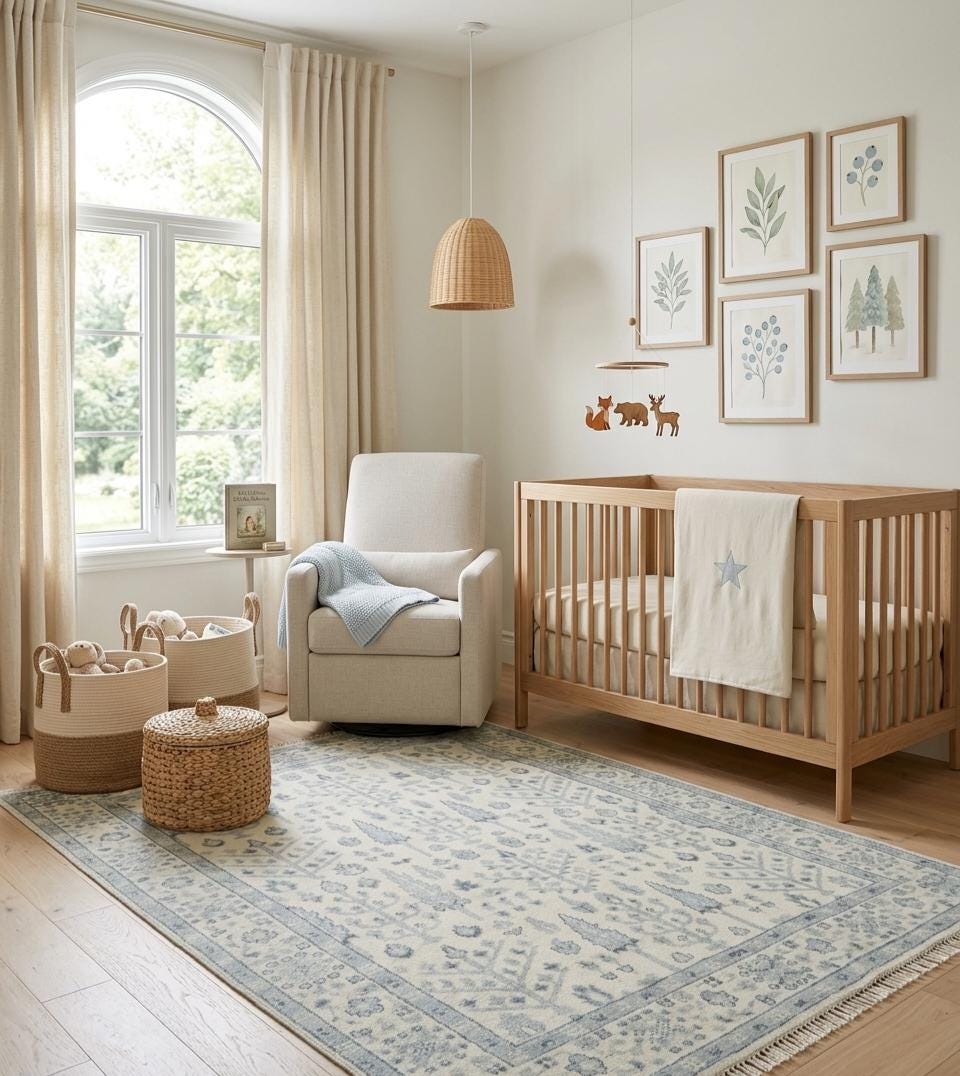 This rug is made for the Patina Blue moment — Etsy's 2026 Color of the Year — and layers beautifully with raw oak floors, linen slipcovers, brass lighting, and natural stone.