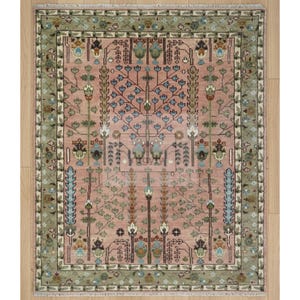 Keywords: hand-knotted rug, Oushak rug 8x10, Turkish rug, vintage style wool carpet, sage green and blush rug, Bhadohi India rug