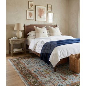 This rug is made for the Patina Blue moment — Etsy's 2026 Color of the Year — and layers beautifully with raw oak floors, linen slipcovers, brass lighting, and natural stone.