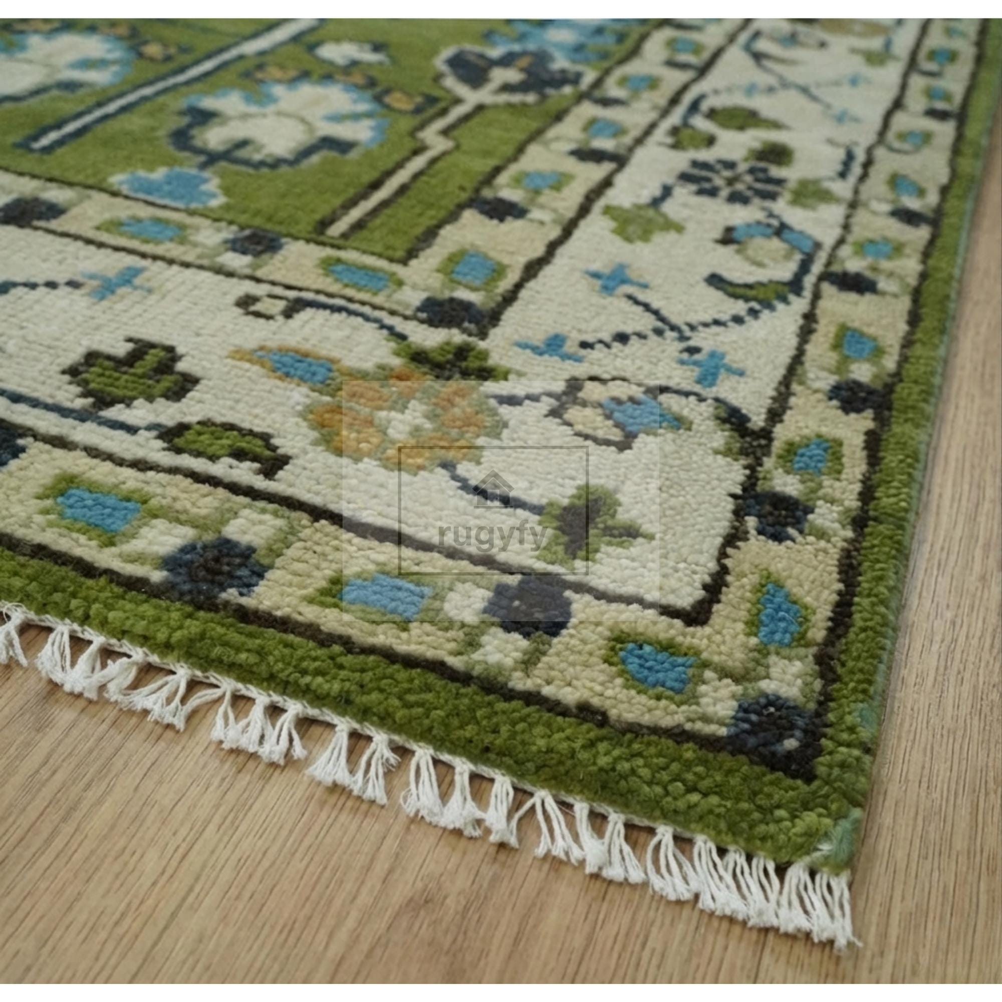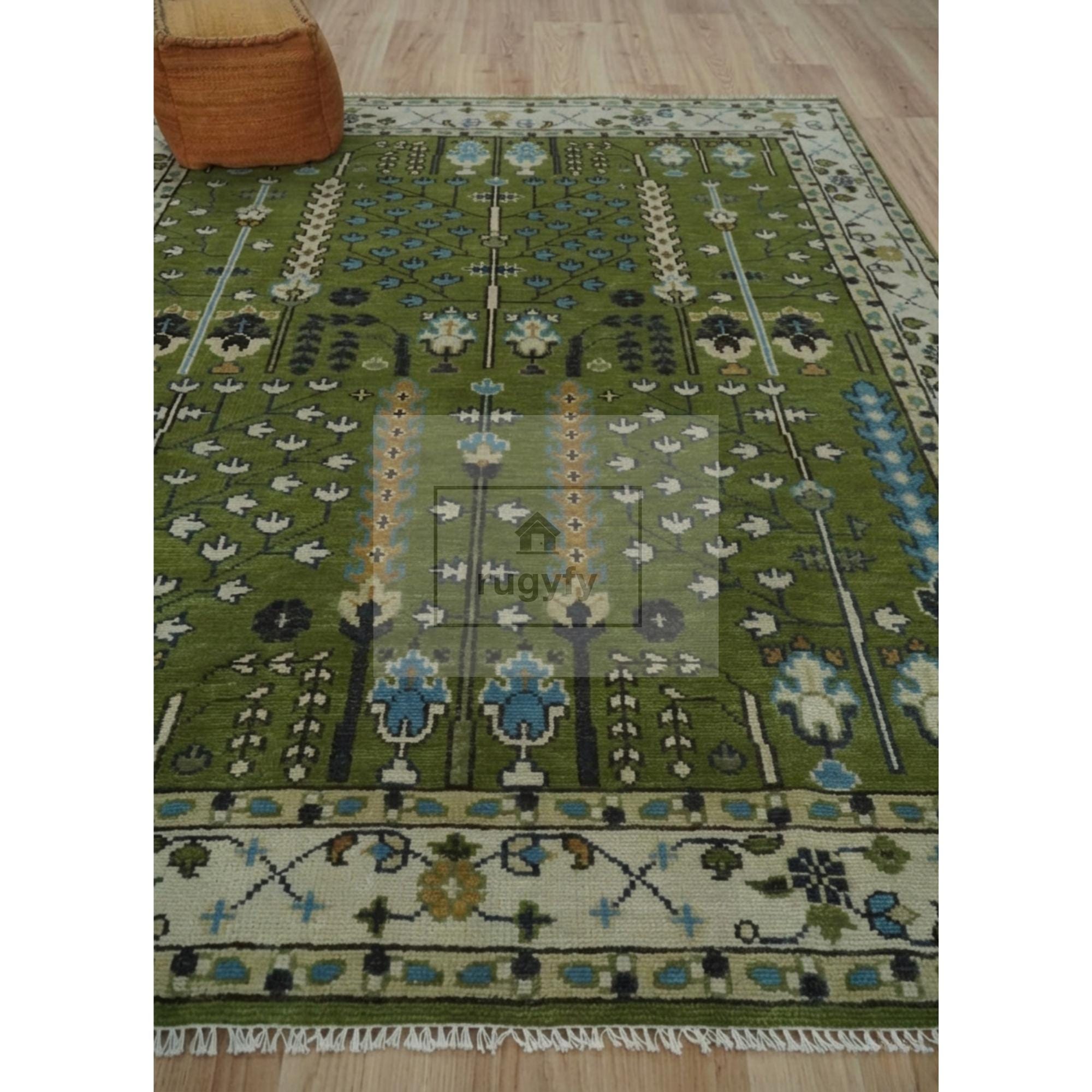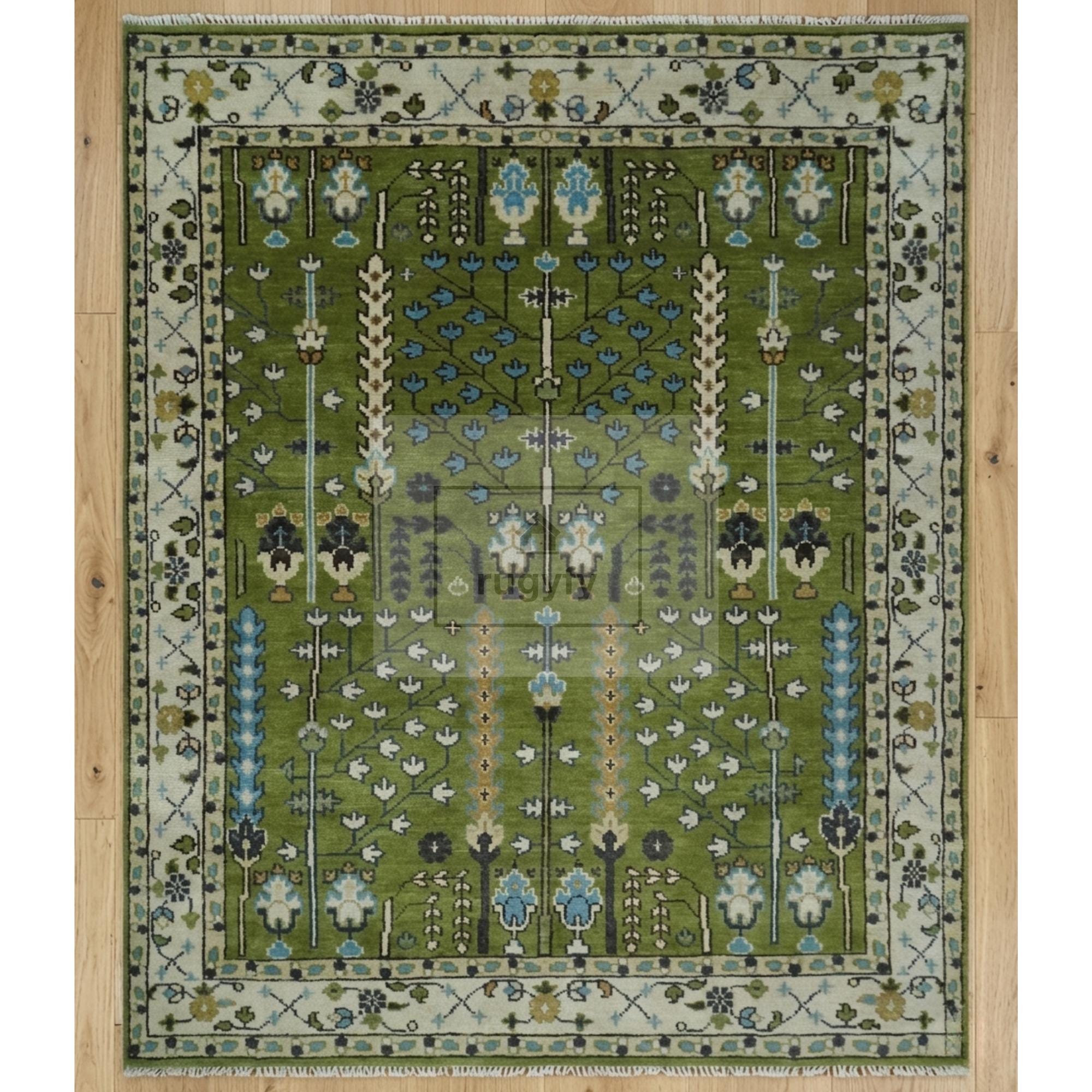 Forest green Oushak rug, Tree of Life rug, hand knotted wool area rug, New Zealand wool rug, Anatolian Oushak tree of life, moss green area rug, hunter green Oushak, emerald wool rug, 8x10 green Oushak, 9x12 green Oushak, 5x8 Oushak rug, 6x9 Oushak rug, botanical area rug, sky blue accent rug, ivory border rug, heirloom wool rug, designer trade rug, interior designer rug, biophilic decor rug, slow living rug, heritage maximalism rug, Patina Blue 2026, floor art rug, Ottoman design rug, Bhadohi hand knotted rug