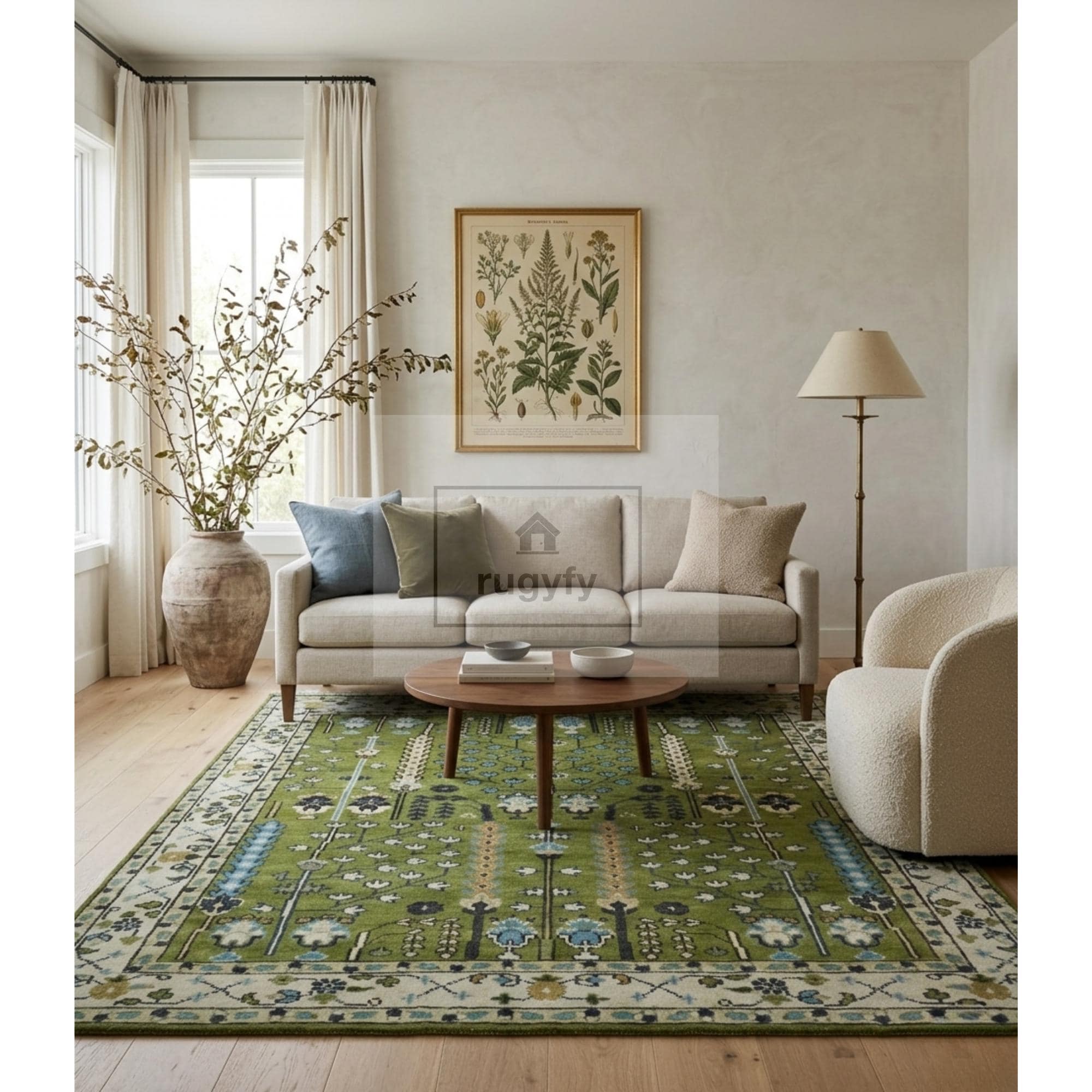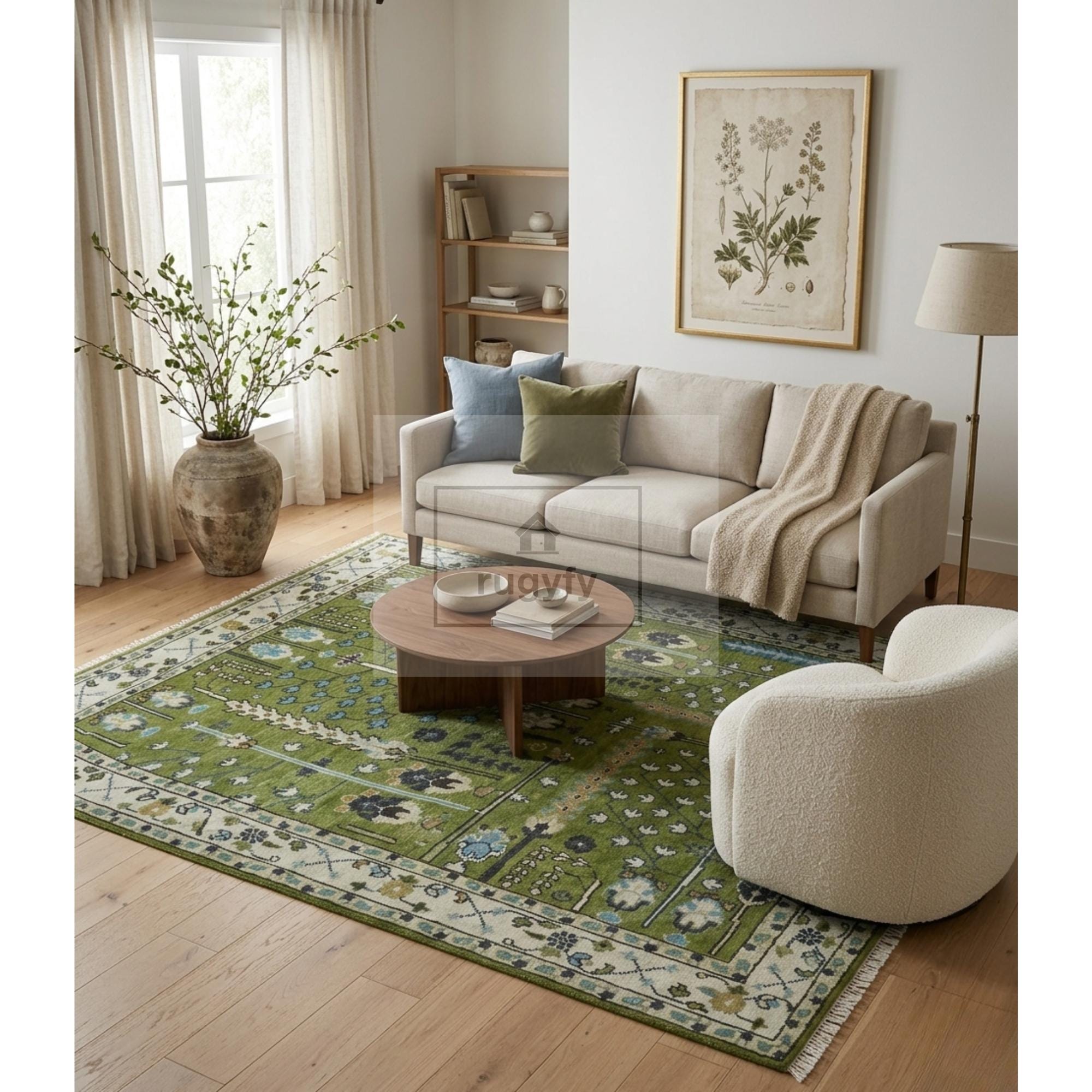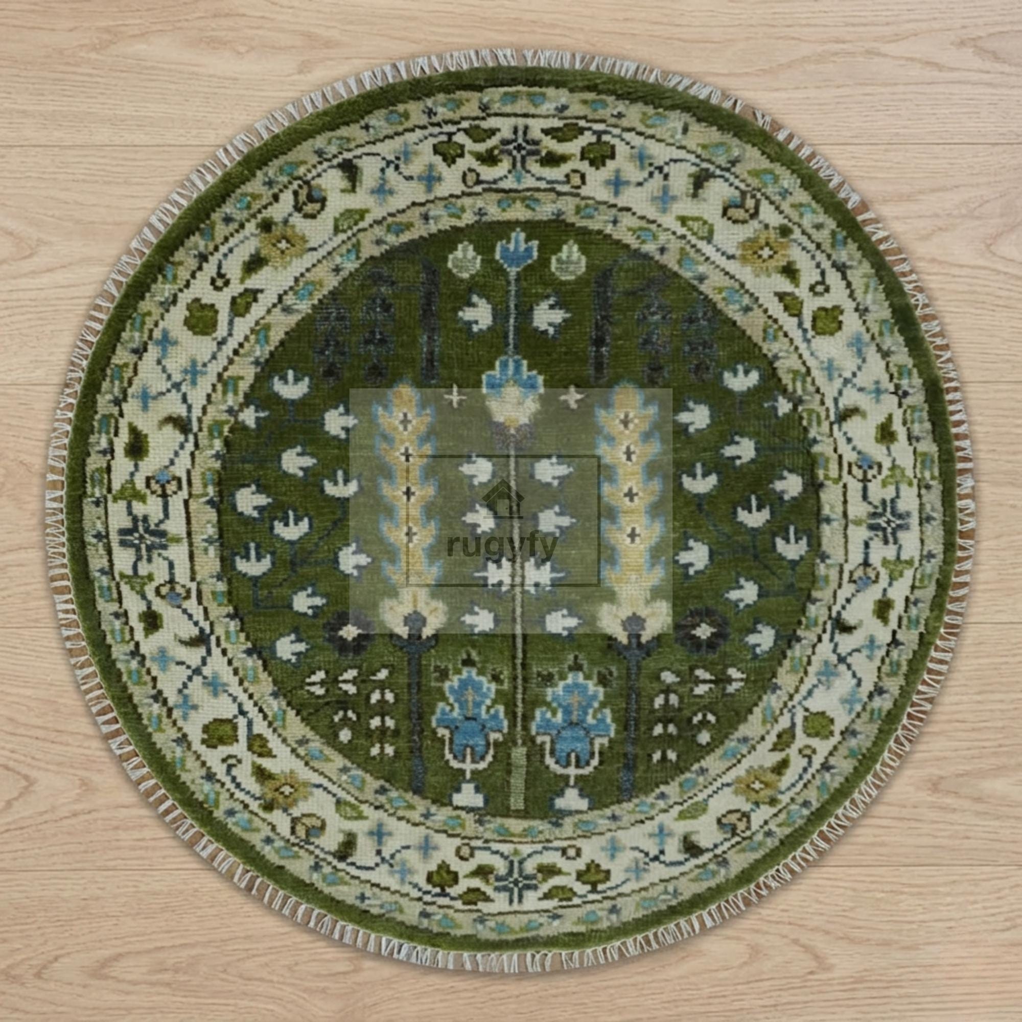 Forest green Oushak rug, Tree of Life rug, hand knotted wool area rug, New Zealand wool rug, Anatolian Oushak tree of life, moss green area rug, hunter green Oushak, emerald wool rug, 8x10 green Oushak, 9x12 green Oushak, 5x8 Oushak rug, 6x9 Oushak rug, botanical area rug, sky blue accent rug, ivory border rug, heirloom wool rug, designer trade rug, interior designer rug, biophilic decor rug, slow living rug, heritage maximalism rug, Patina Blue 2026, floor art rug, Ottoman design rug, Bhadohi hand knotted rug