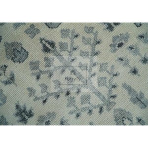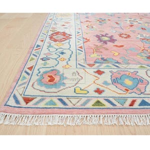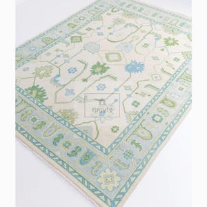 Keywords: hand-knotted rug, Oushak rug 8x10, Turkish rug, vintage style wool carpet, sage green and blush rug, Bhadohi India rug