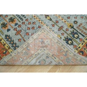 Keywords: hand-knotted rug, Oushak rug 8x10, Turkish rug, vintage style wool carpet, sage green and blush rug, Bhadohi India rug