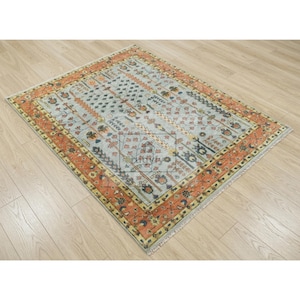 Keywords: hand-knotted rug, Oushak rug 8x10, Turkish rug, vintage style wool carpet, sage green and blush rug, Bhadohi India rug