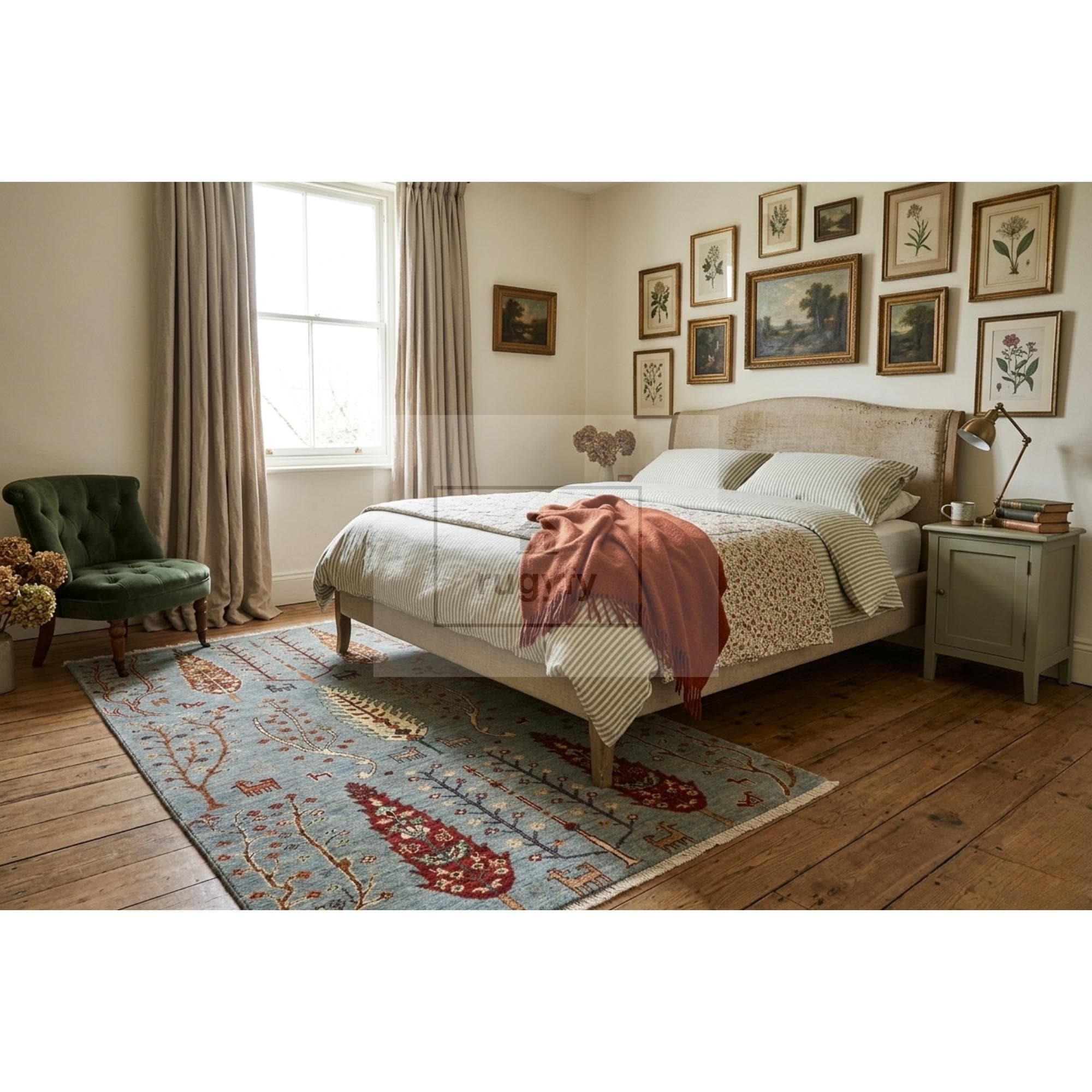 The calm sky-blue palette pairs beautifully with heritage maximalism, Grand Millennial, Neo Deco, Biophilic, and Afrohemian inspired interiors. Ideal for living rooms, primary bedrooms, dining rooms, reading nooks, and gallery-style studies. The pictorial animals and cypress trees make this a conversation piece for homes built around storytelling.