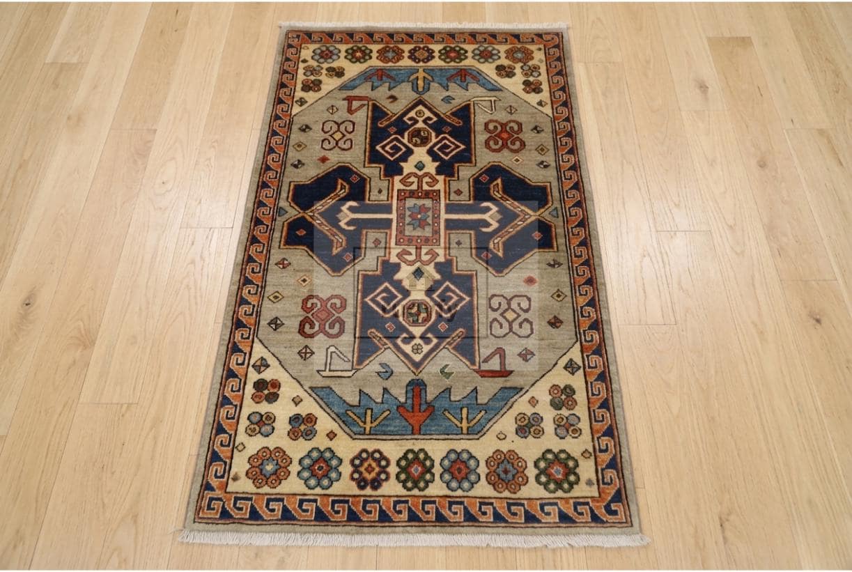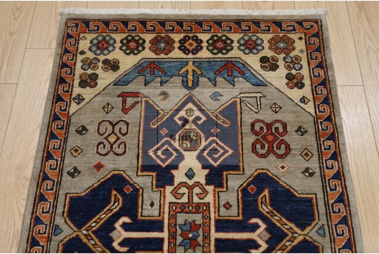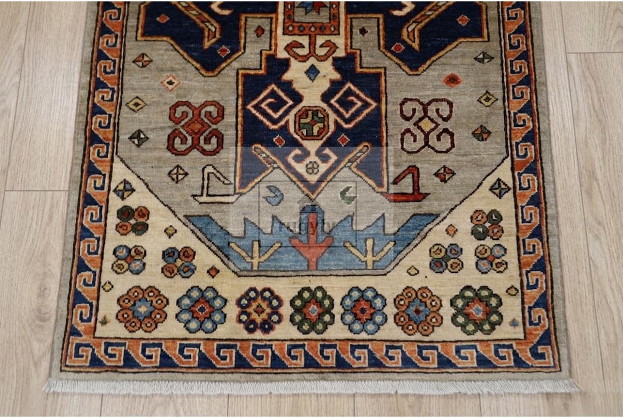 • Design: Authentic Kazak-Oushak with twin medallion, Caucasian geometry, Anatolian border tradition
