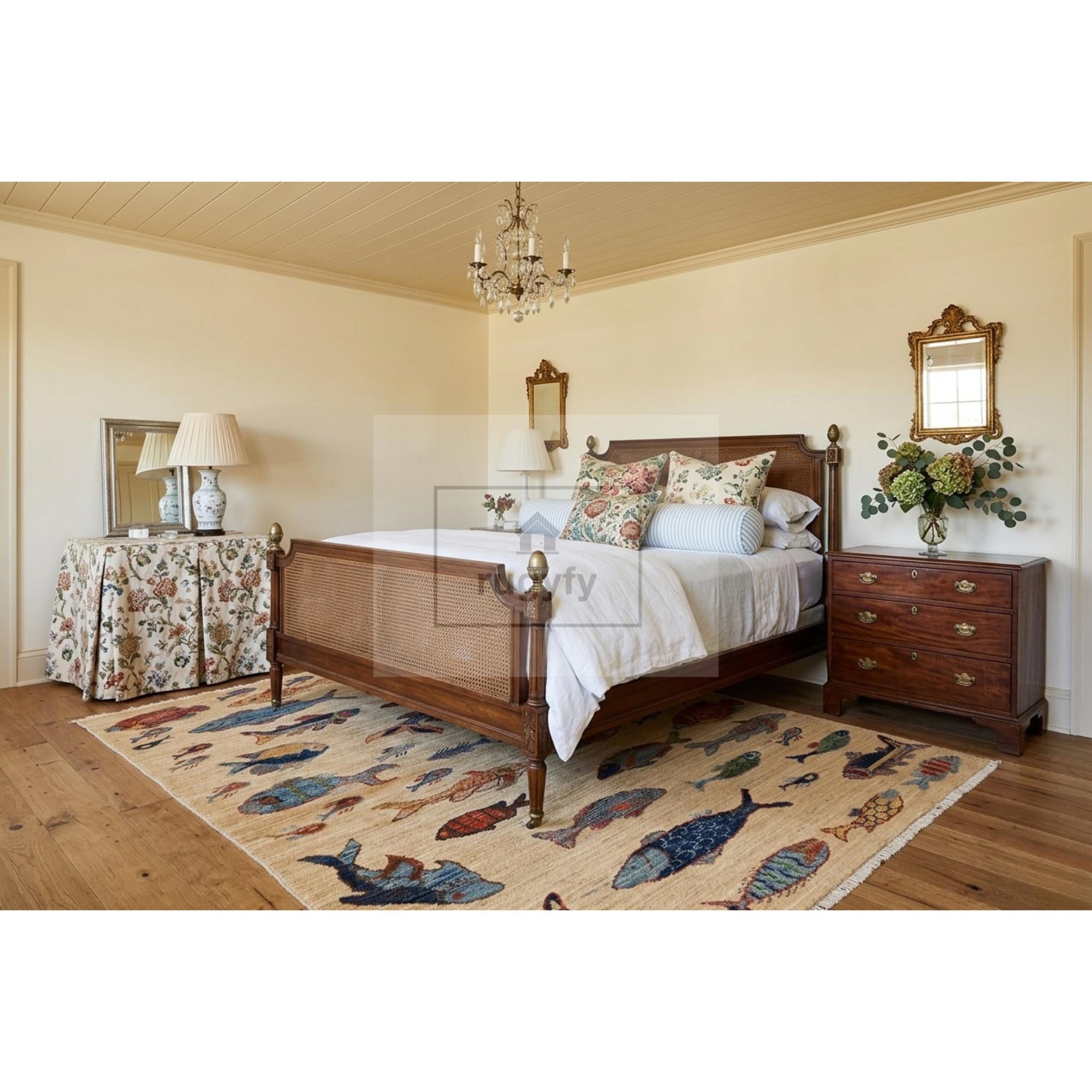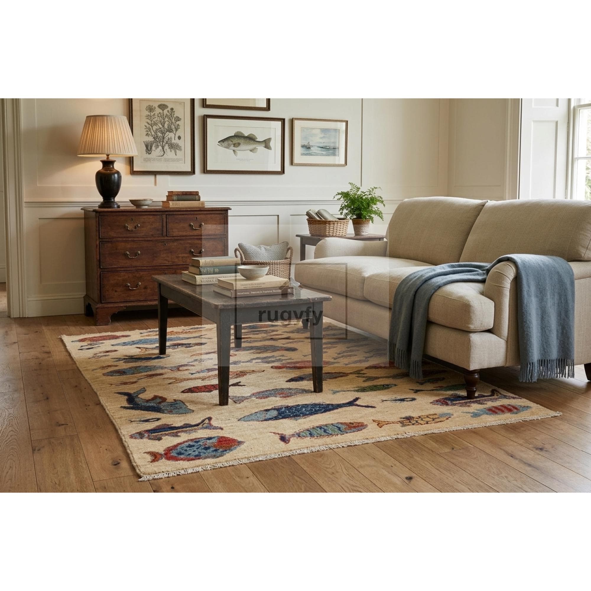 Pictorial rugs are among the most collectible in the Oushak canon. Unlike geometric or floral designs, a pictorial fish rug tells a story — a perfect anchor for coastal homes, biophilic interiors, nurseries, libraries, reading nooks, and quiet-luxury spaces. The abrash (subtle tonal variation) in the ivory field gives the wool a glowing, lived-in patina that photographs beautifully and ages like fine furniture.
