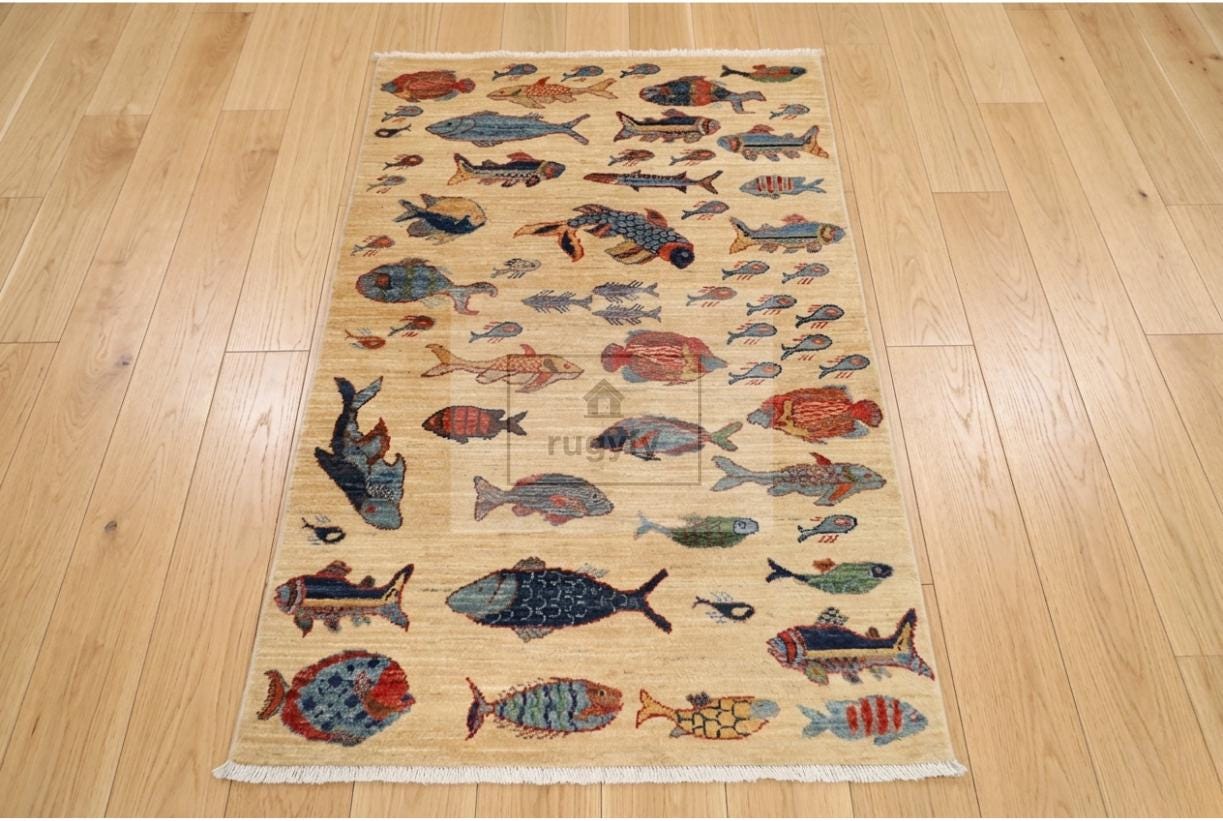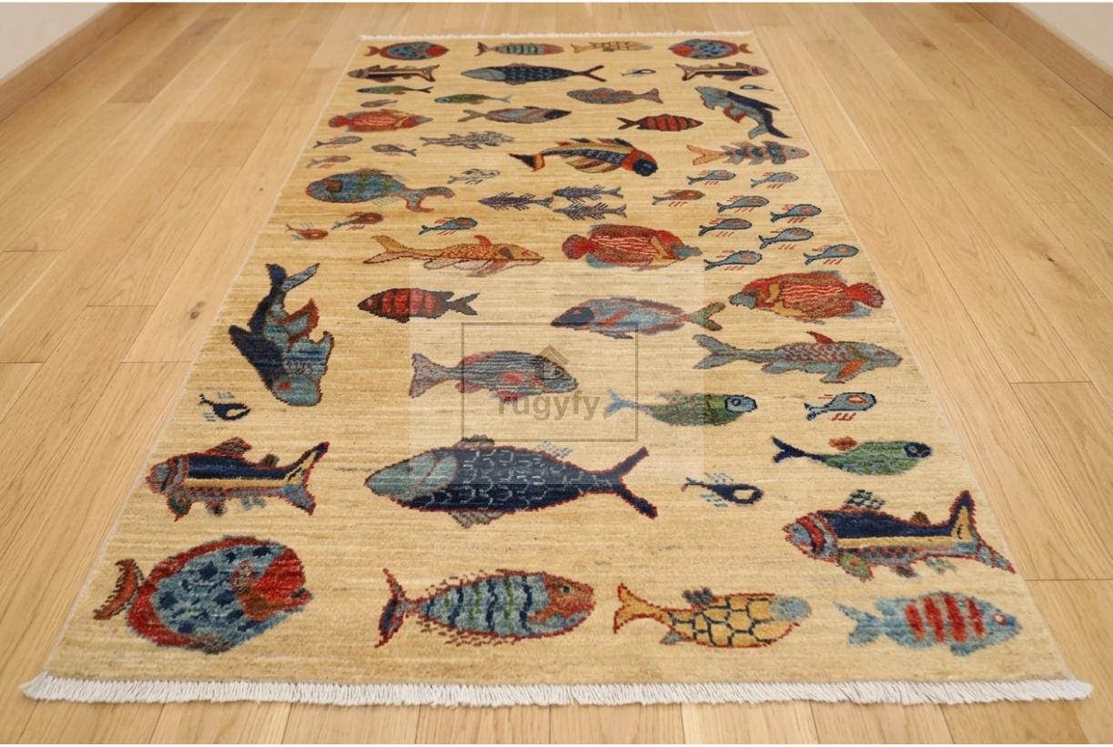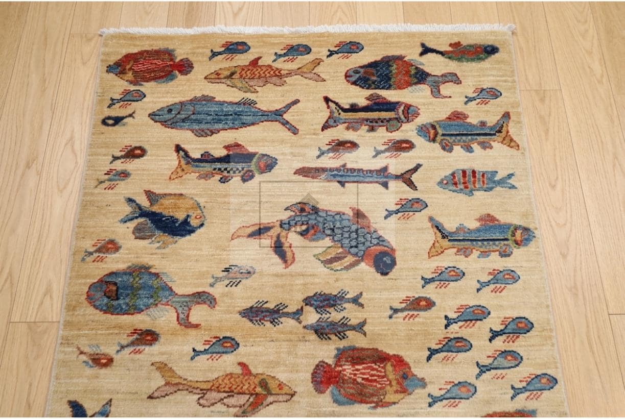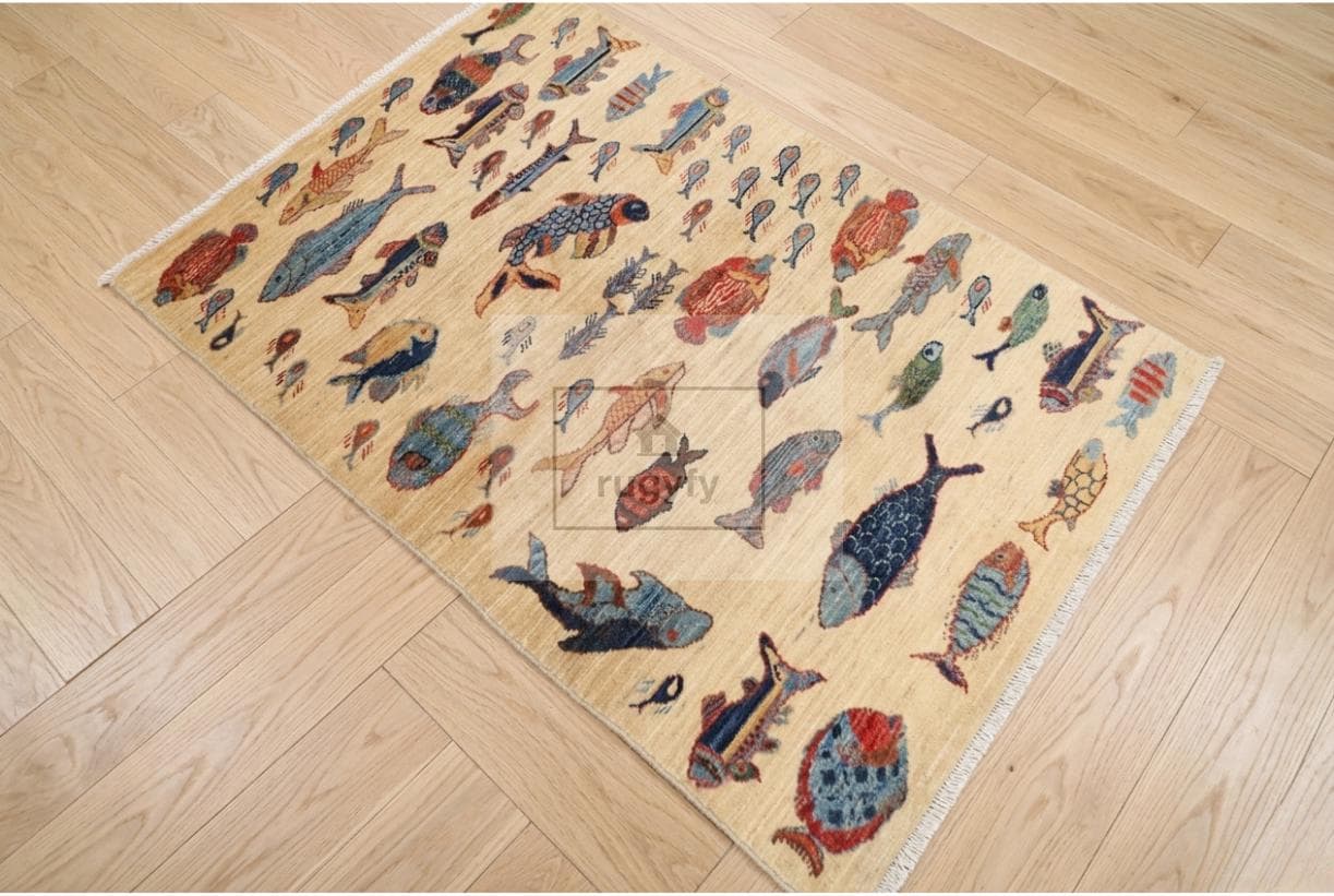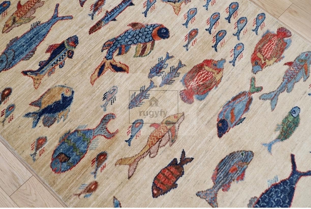 • Design: Pictorial fish motif on ivory ground with indigo, teal, terracotta, ochre, and sage green — every fish slightly different, a true one-of-a-kind piece